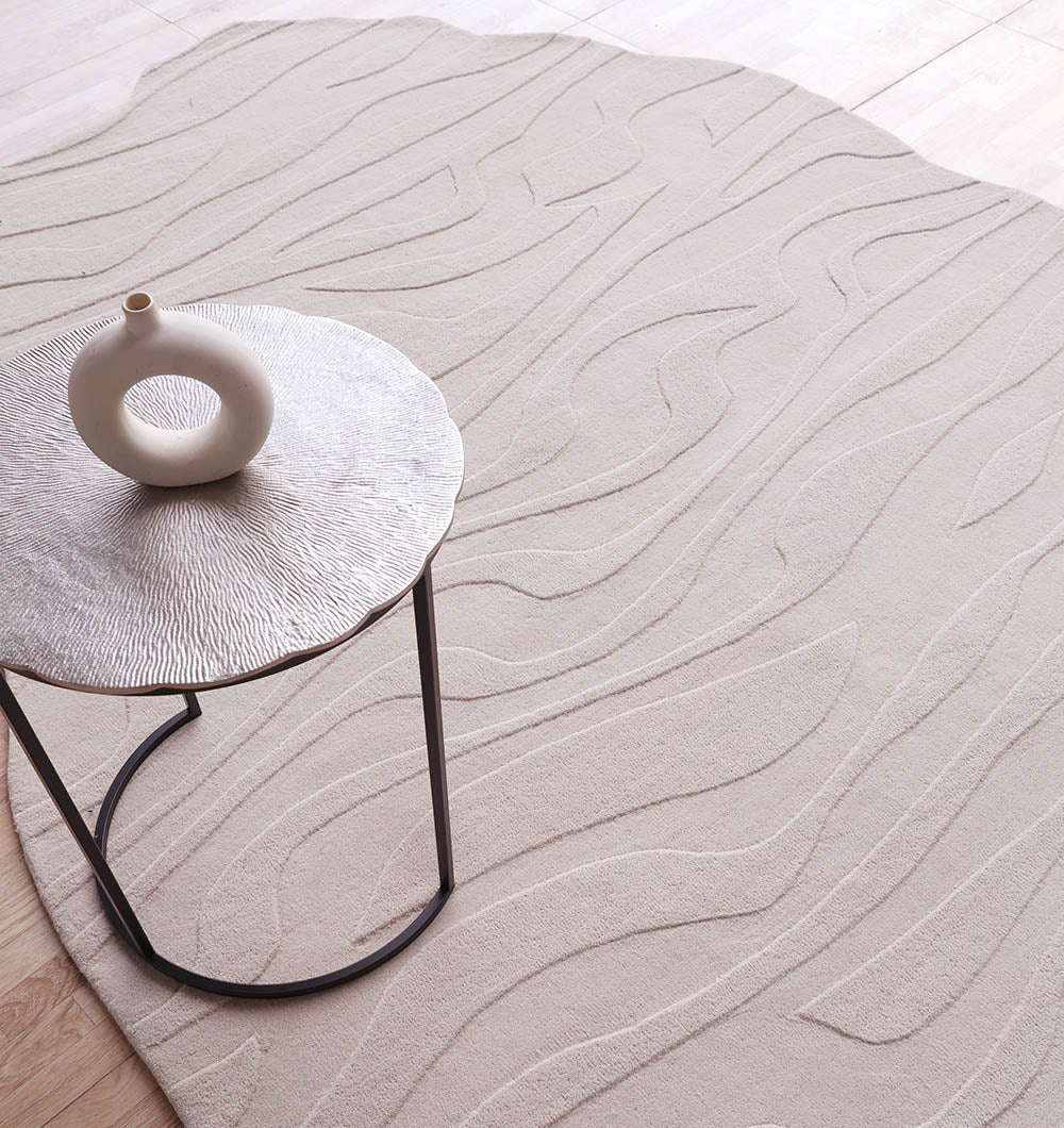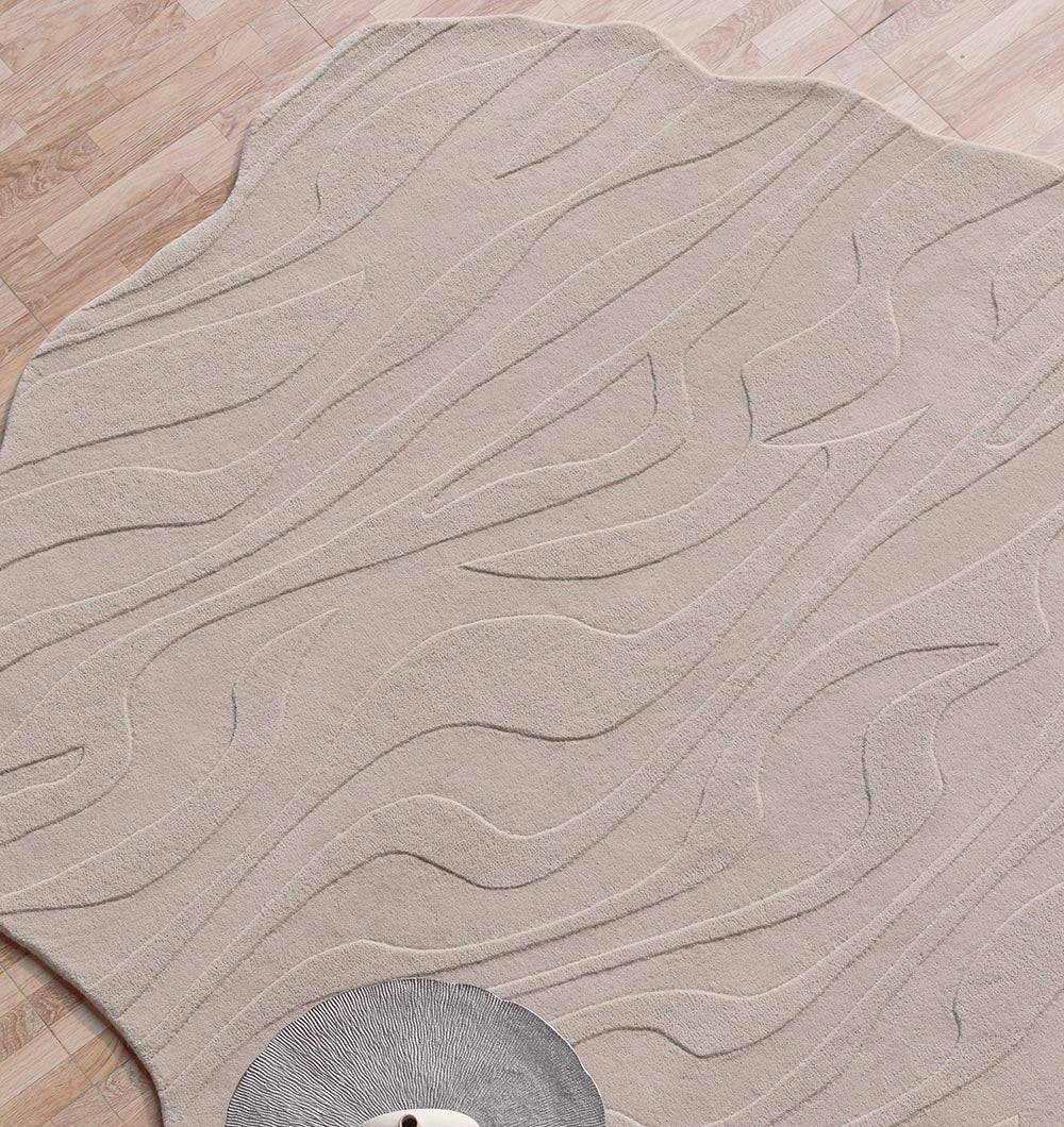 Soft and calming, this light beige rug features a smooth irregular outline with gentle carved wave lines that add texture without busy detail. The neutral tone blends easily with wood floors, white walls, and warm minimal décor, making the room feel open and relaxed. Use it as a beige wool rug to soften a seating area or style it as a modern irregular rug for a clean, contemporary look. The subtle pattern also makes it a lovely textured hand tufted rug for everyday comfort.