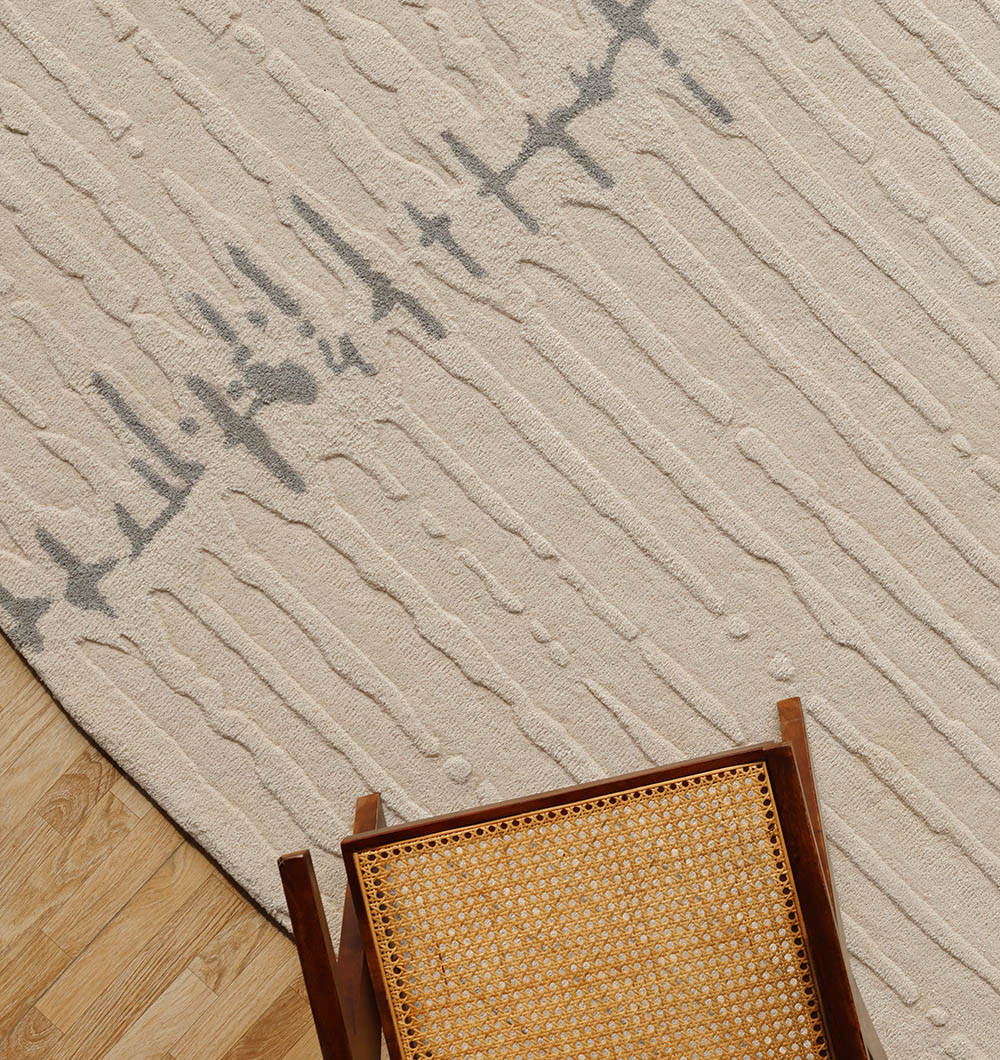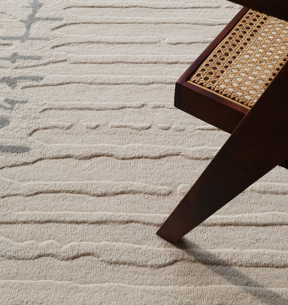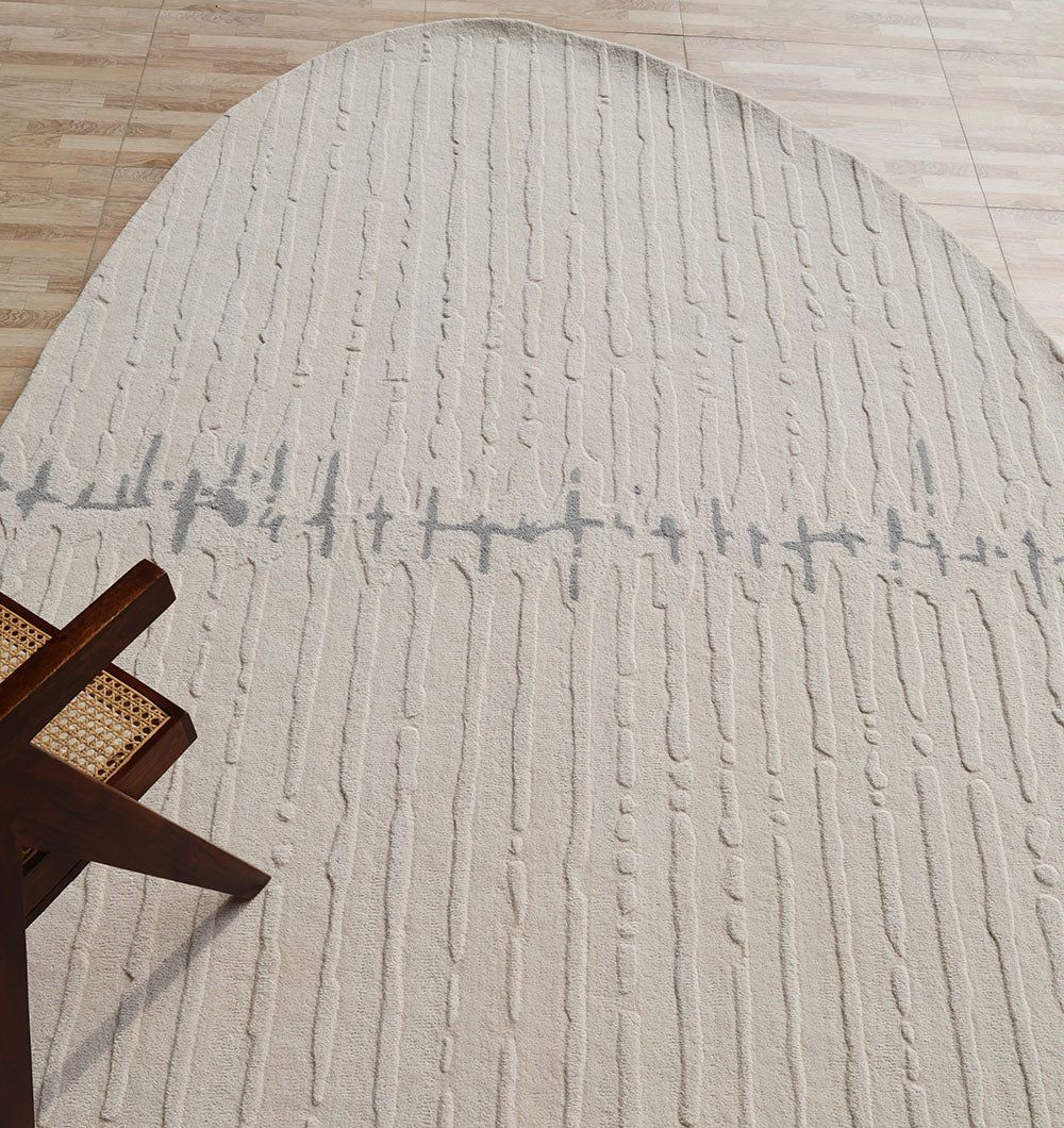 Bring calm, modern texture to your space with this soft beige rug in an organic outline. Fine raised lines add a gentle ribbed feel. This hand tufted wool rug has a smooth, cozy finish that works beautifully as a modern neutral rug, and the irregular shape rug makes the room feel more relaxed and designed.