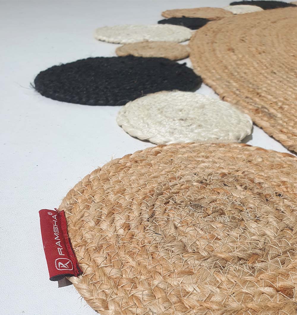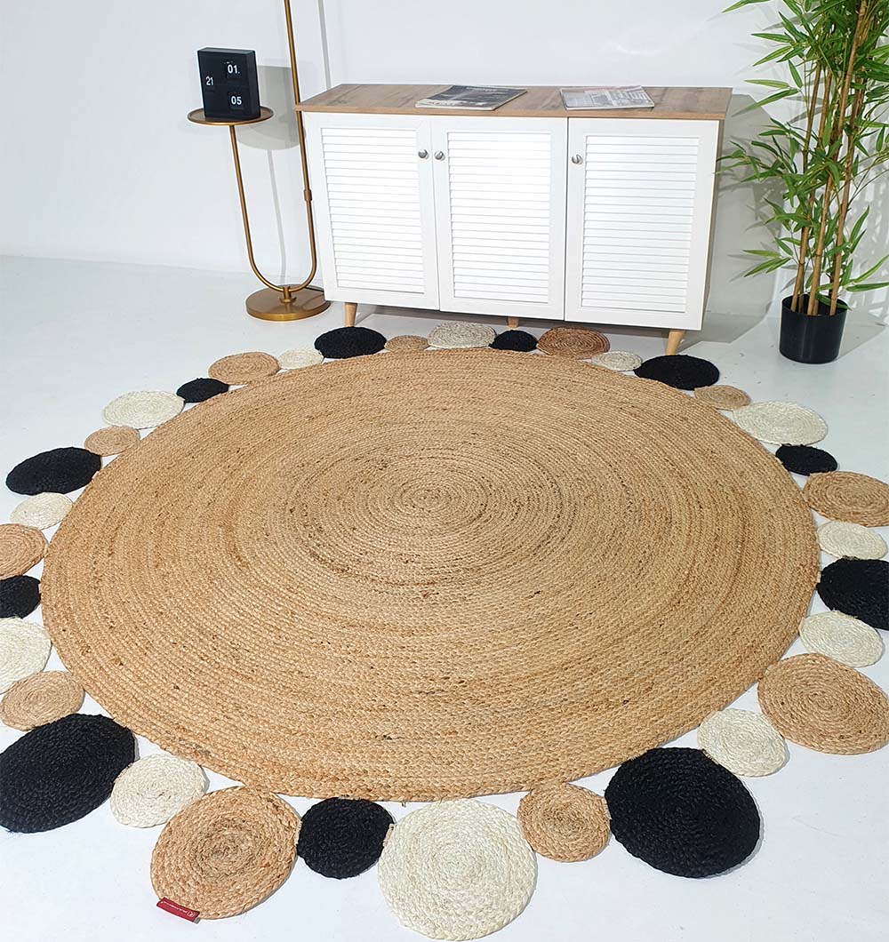 Designed to stand out, this round rug features a natural beige braided center surrounded by playful circular accents in black, cream, and light brown. Made from pure jute, it offers a firm texture and durable construction suitable for daily use. The layered circular weave adds depth, while the contrasting border details create a lively yet balanced look. Its organic tones pair easily with wood and neutral furniture, bringing warmth and character to the space. This round jute rug works beautifully as a statement piece in modern interiors. With its decorative edge, it also functions as a unique boho jute rug and a sturdy braided jute rug for practical living.
