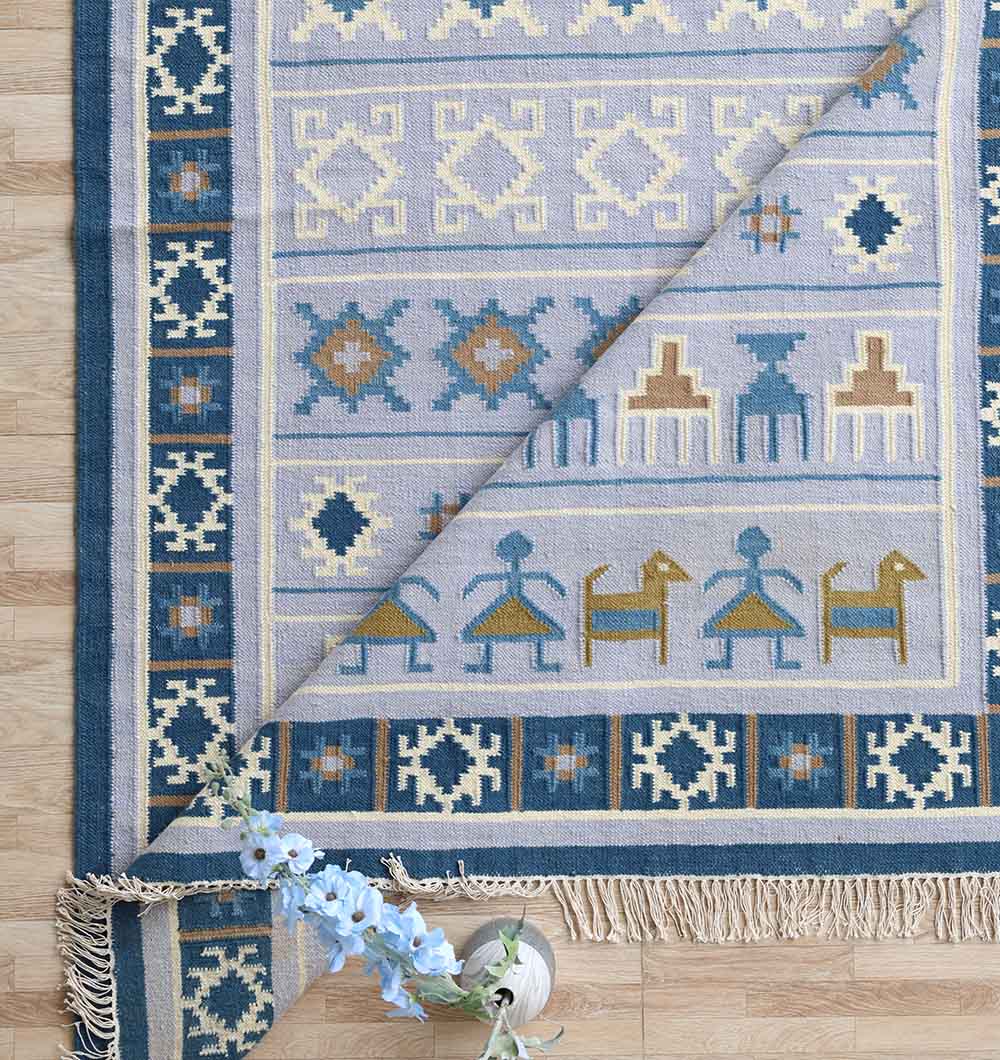 Cool shades of sky blue and deep navy frame this lively rectangular design, filled with rows of geometric motifs and small figurative patterns in mustard and ivory. The structured border keeps the layout balanced, while the fringe edges add a relaxed finish. Woven as a kilim rug, it features a flat surface that works well under furniture and in layered settings. Made from jute and cotton, this jute kilim rug brings natural texture with a breathable, lightweight feel suited for everyday use. Choose this blue tribal rug to introduce character and pattern while keeping the space fresh and easy to style.