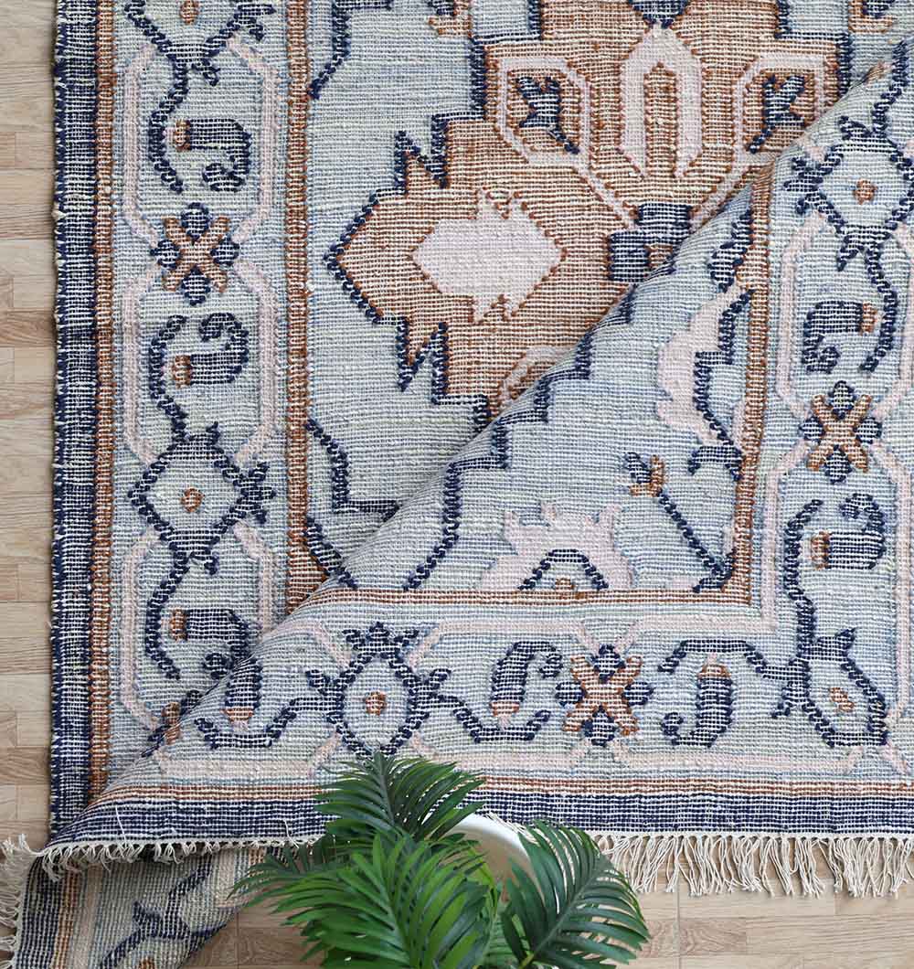 Soft ivory and pale blue tones set a calm base for this rectangular design, detailed with a central medallion in warm beige and framed by navy and muted rust motifs. The slightly distressed look gives it a relaxed vintage feel, while the fringe edges add a casual touch. Woven as a kilim rug, it features a flat, low profile that fits easily under furniture and works well in layered spaces. Made from jute and cotton, this jute kilim rug brings natural texture with a breathable, lightweight finish. Choose this medallion flatweave rug to add subtle color and classic character without overwhelming the room.
