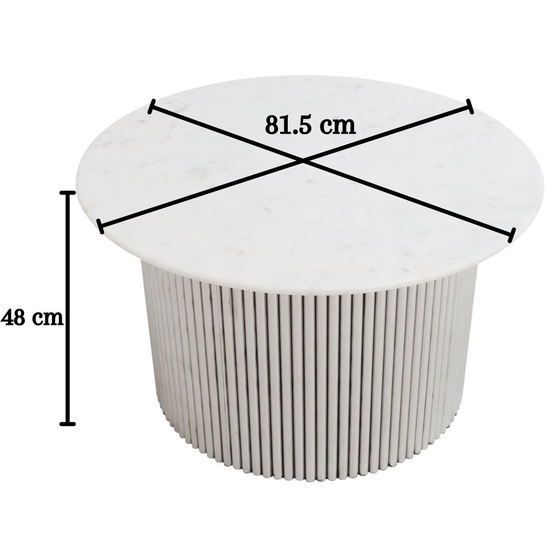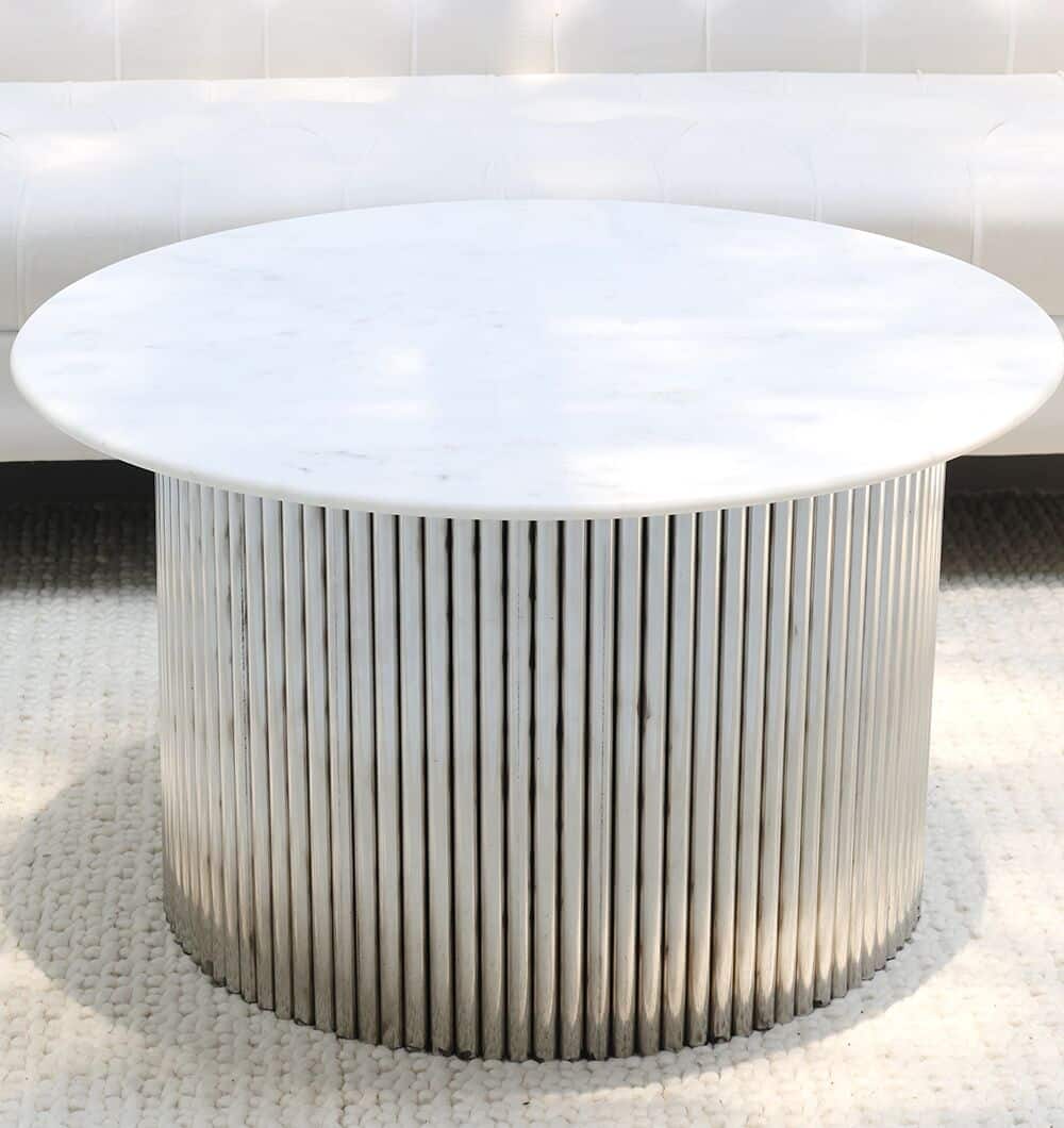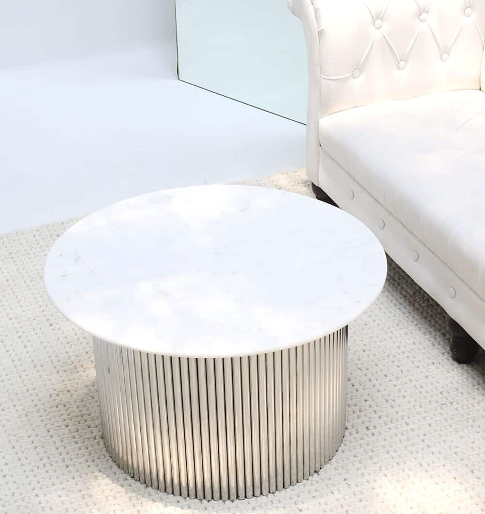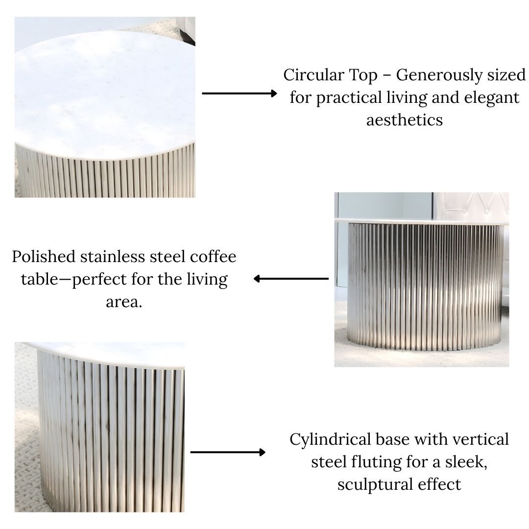 Bring a clean centerpiece to your seating area with this round coffee table in white gloss. The smooth top pairs with a fluted stainless-steel base for a modern look that still feels warm and balanced. Its wide surface is practical for serving, books, and simple décor, while the solid drum shape keeps it steady in everyday use. Made from 100% stainless steel, this stainless-steel coffee table suits contemporary living spaces.