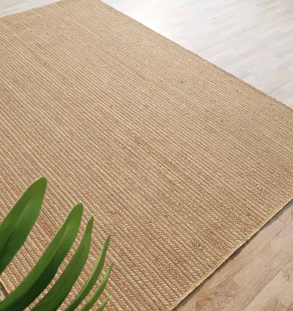 Clean and understated, this rectangular rug showcases the natural beauty of pure jute in a warm beige tone with subtle golden strands. The linear braided pattern runs evenly across the surface, giving it a structured look while adding visible texture. Built with durability in mind, the tight weave creates a firm feel underfoot, making it practical for everyday use. This rectangular jute rug fits easily beneath dining tables or seating setups, helping define larger spaces. Its strong construction makes it a dependable braided jute rug that maintains shape over time. For those who prefer simple and earthy interiors, this natural fiber rug offers a grounded base without bold designs.