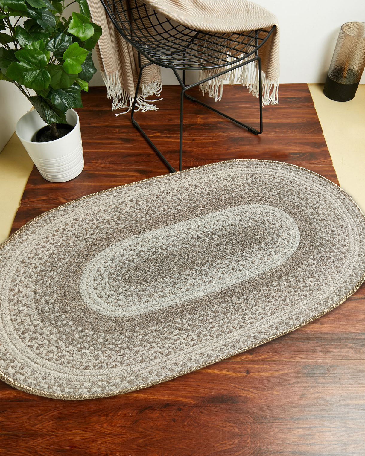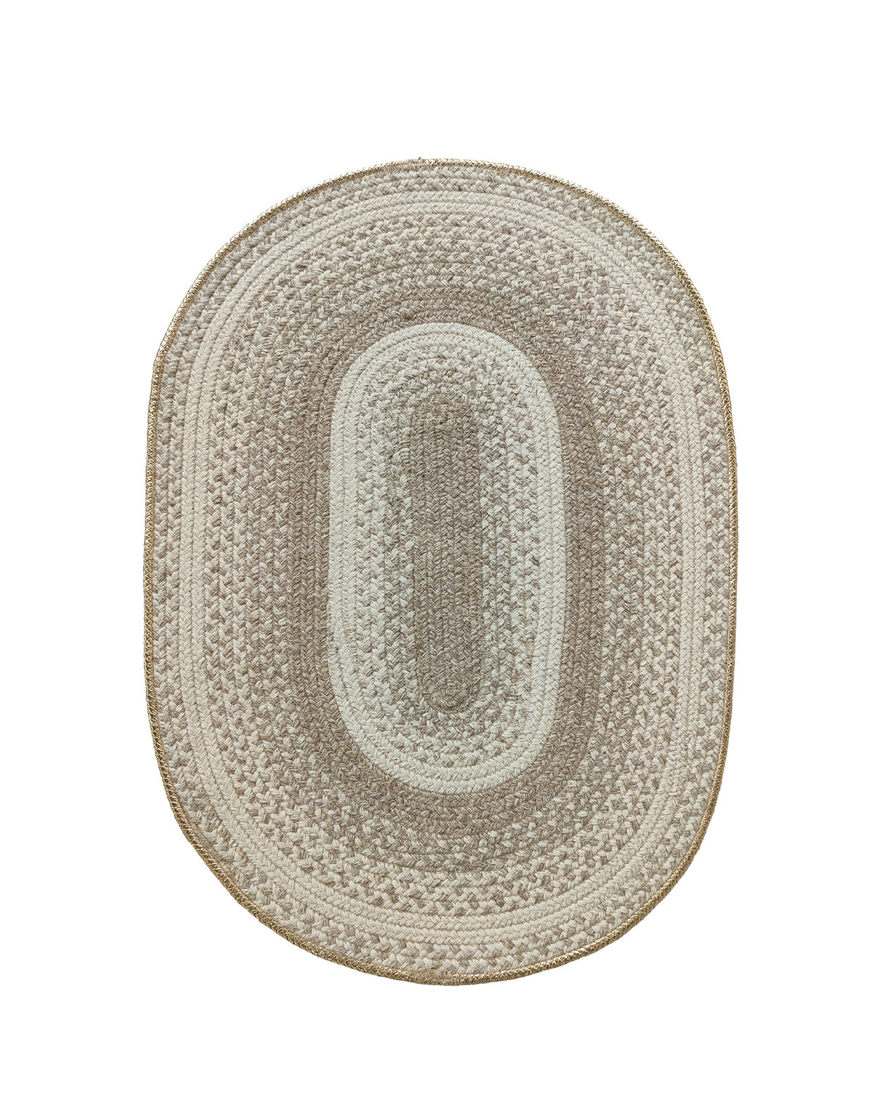 Bring soft texture and classic charm to your space with this oval braided rug in warm beige and cream. The braided rings add depth and a cozy, farmhouse feel, while the subtle gold border gives it a dressed-up finish. This neutral braided rug layers beautifully with light woods, natural linens, and warm metals, making it easy to style in both modern and traditional rooms. Use this wool blend rug to create a calm base that still feels rich and detailed.
