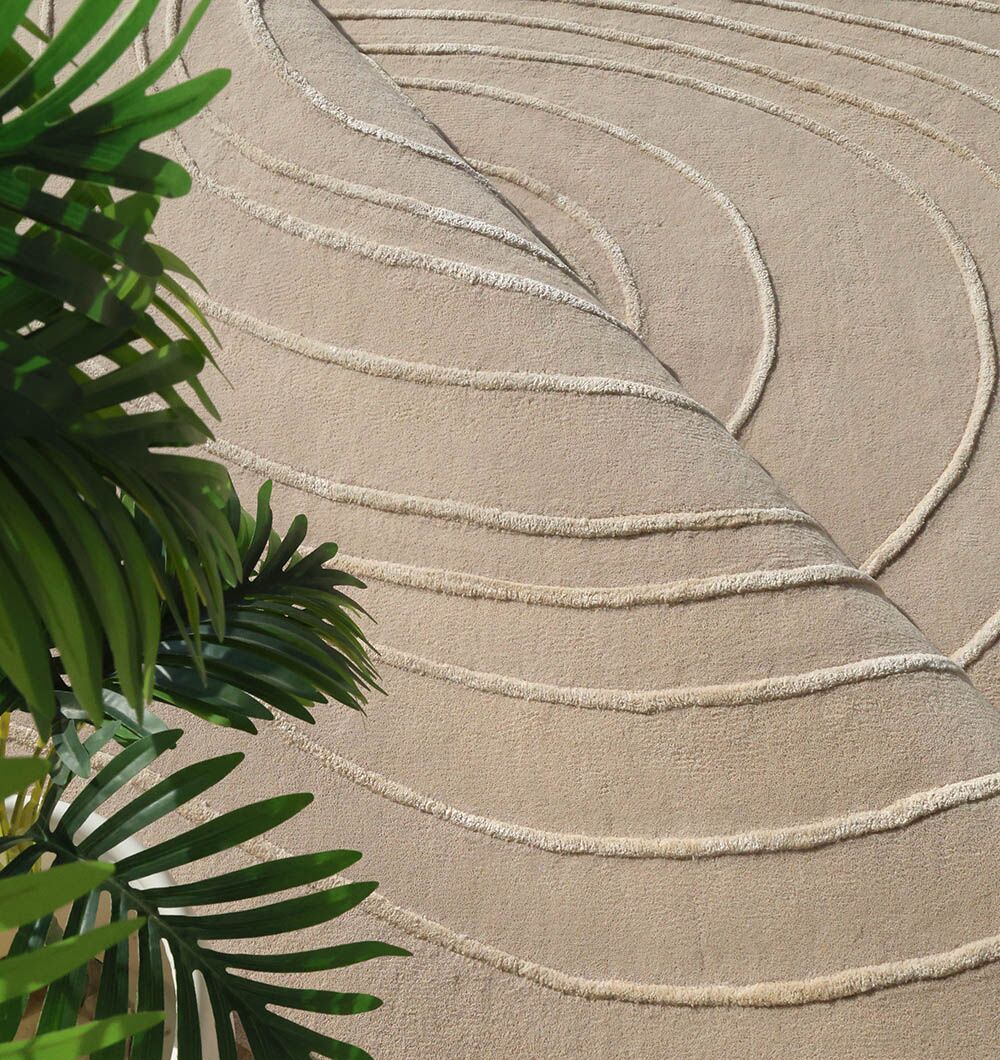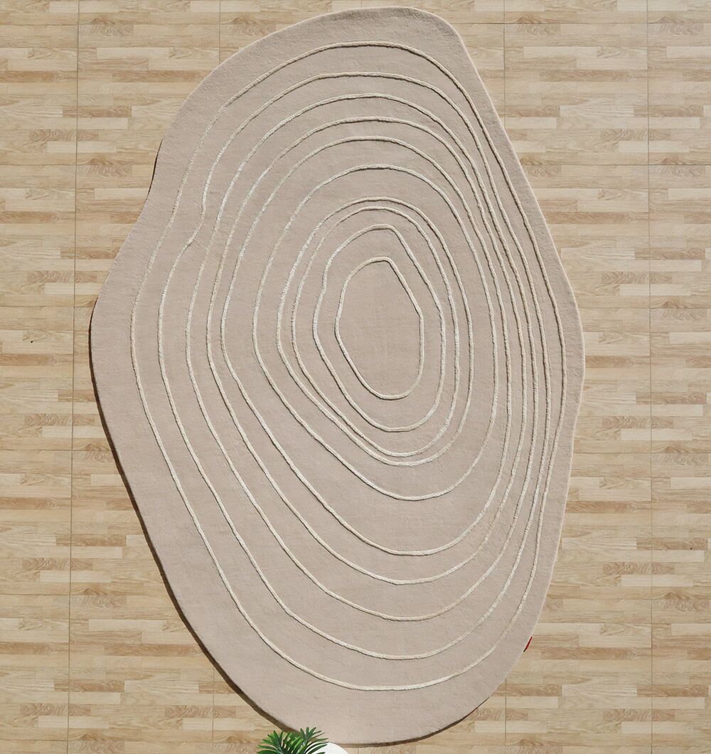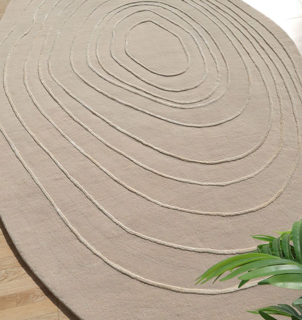 Soft greige with carved ivory contour rings gives this irregular rug a clean, modern look with depth you can feel. The hand-tufted pile is smooth with a gentle cushion, and the wool, tencel, and cotton blend adds a light sheen that brings out the layered lines. Use it as a hand tufted wool rug to keep the space calm and grounded, choose a tencel wool blend rug for a smoother touch and subtle shine, or style it as a neutral contour rug to add texture without bold pattern.