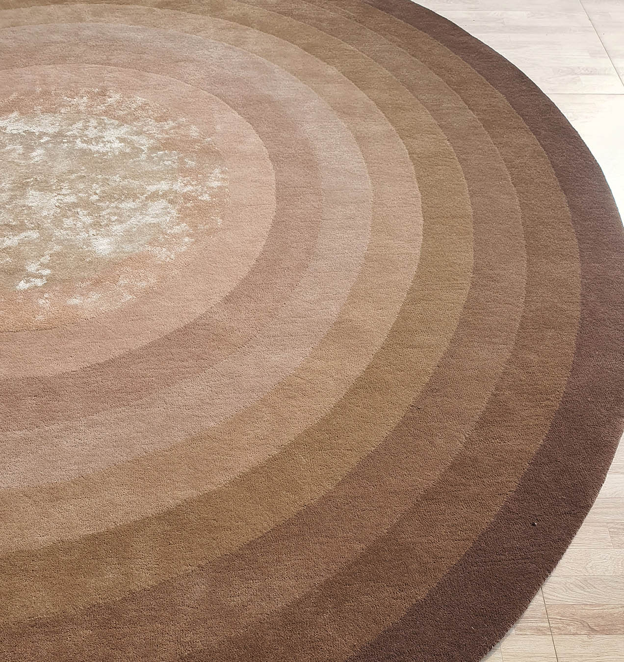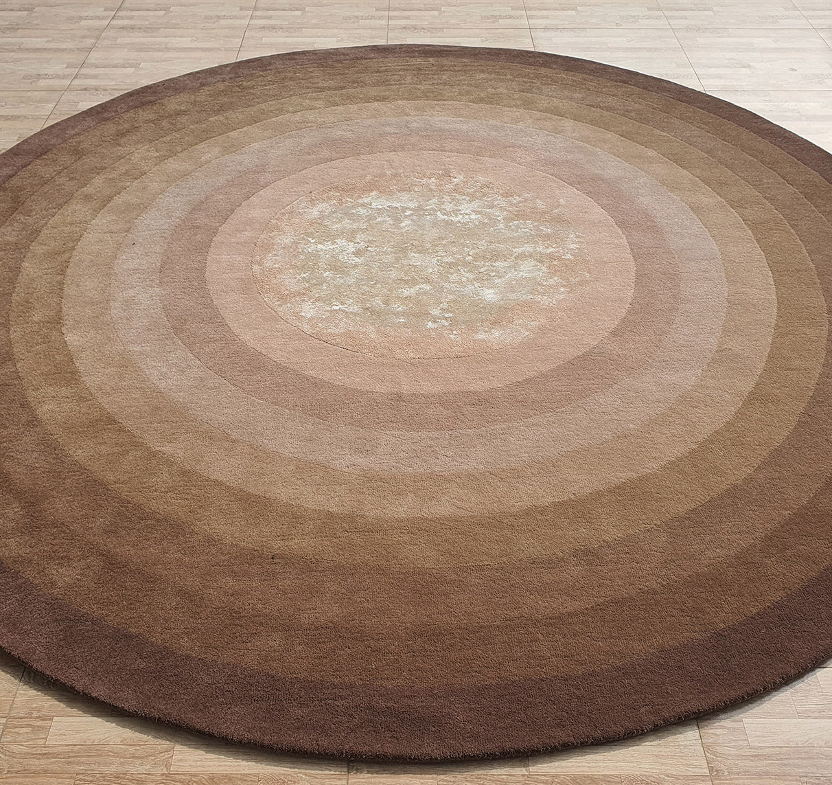 Bring warm depth to your space with this round area rug in layered brown tones. Soft rings move from a light beige center to rich mocha edges, creating a calm, balanced look that feels like gentle sunlight on the floor. The plush, hand-finished surface adds comfort underfoot, while the circular design helps soften sharp furniture lines. Use this brown area rug to anchor seating, frame a small dining set, or add a cozy focal point in a quiet corner. A versatile handtufted rug that blends easily with neutrals, wood, and earthy décor.