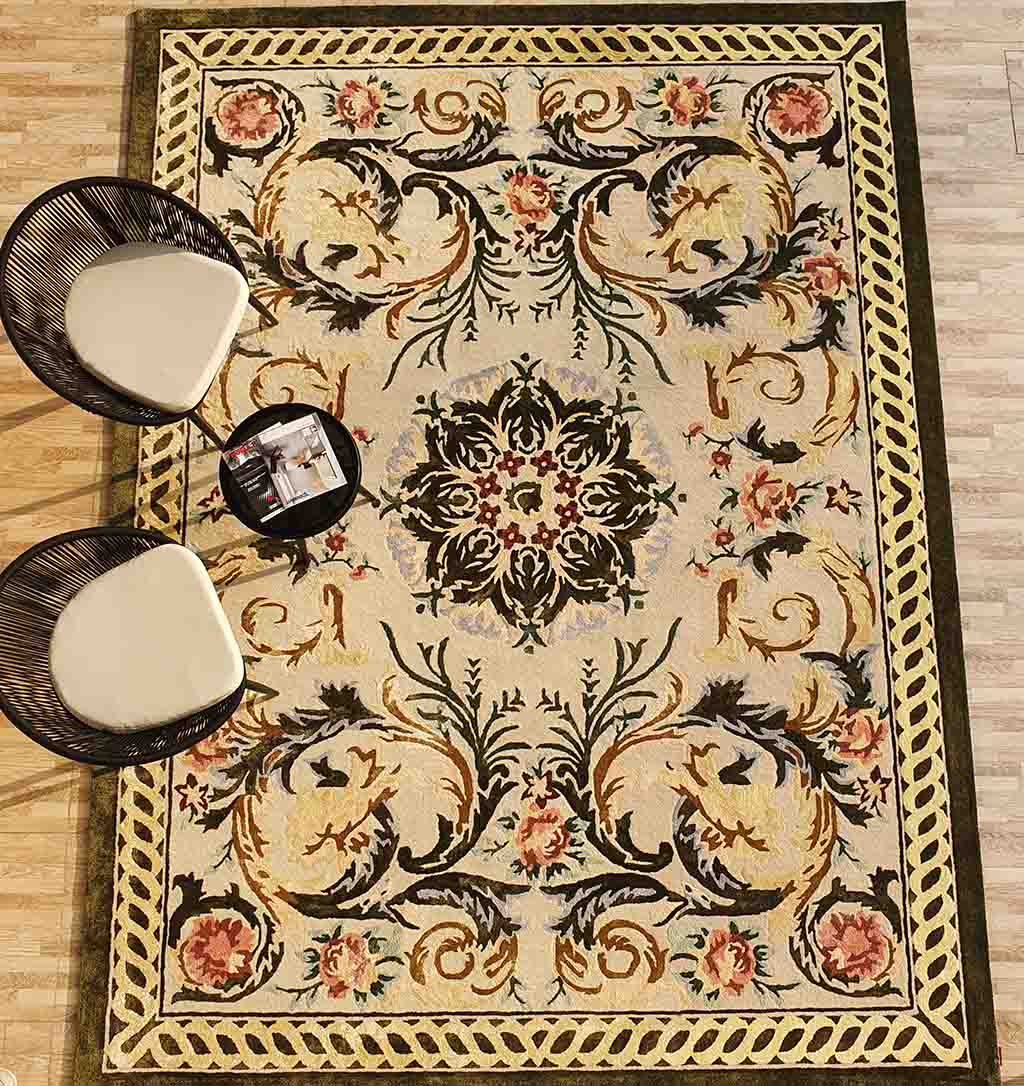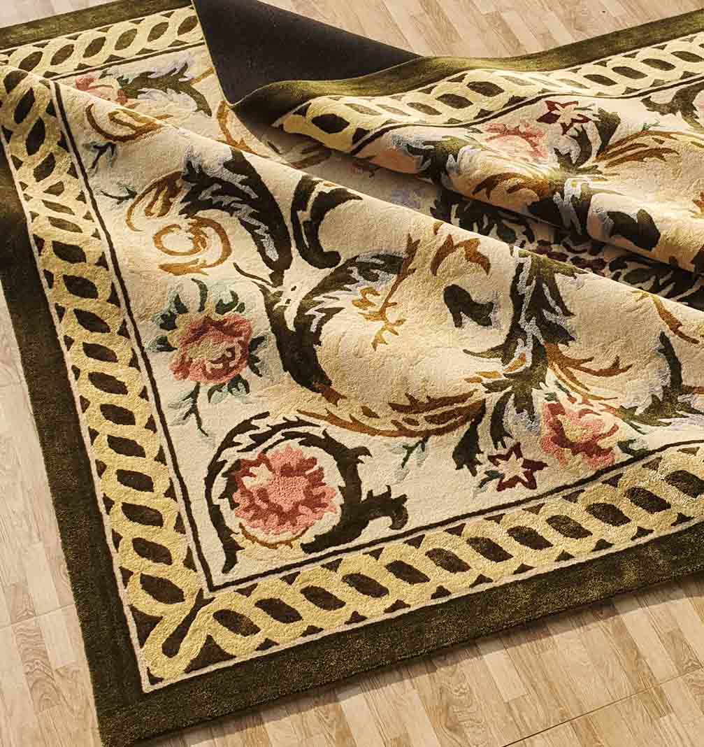 Cream and beige tones set a warm base, framed by an olive border and filled with black scrollwork, gold accents, and soft rose pink florals. Wool gives it a comfortable feel, while silk adds a light sheen that lifts the pattern. As hand tufted rug detailing, the design reads crisp and decorative, making it an easy statement under a seating set or bed. Use it when you want classic style without heavy color, and pair it with wood, brass, or dark furniture for contrast. This wool silk rug also works well as a traditional floral rug in layered, lived-in spaces.