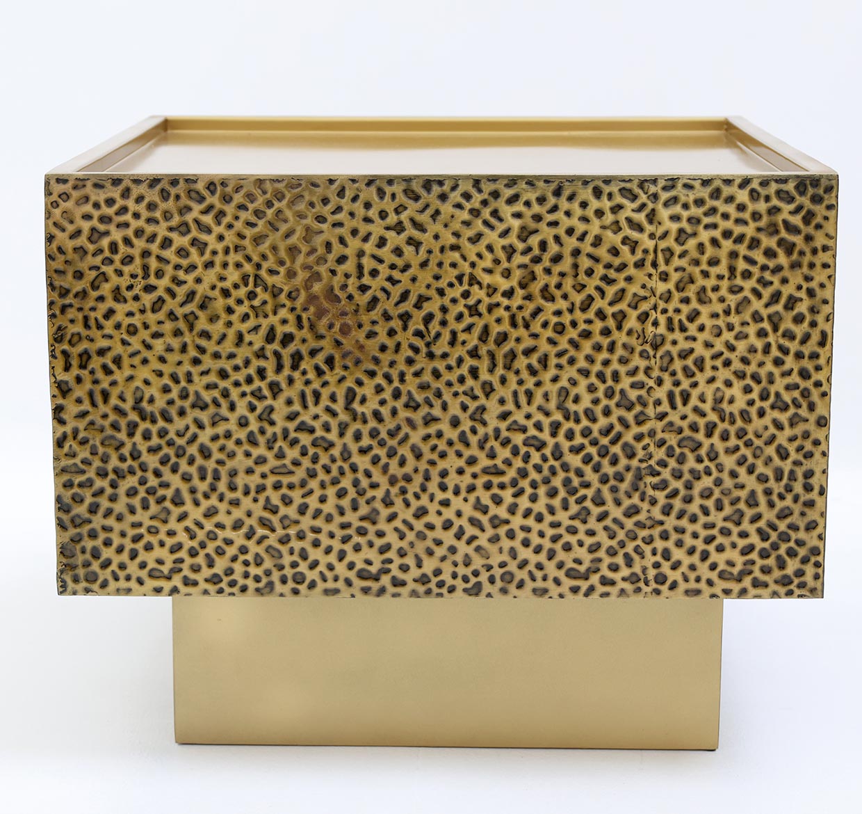 Place this square side table next to a sofa or bed for a neat surface that also adds character. The brass antique finish is paired with a raised rim top to help keep small items in place, while the textured patterned sides give it a bold look. Its solid cube shape feels stable and easy to style with a lamp, vase, or cup. Made from 100% iron, this metal side table suits everyday use in modern spaces.