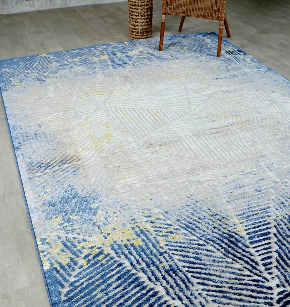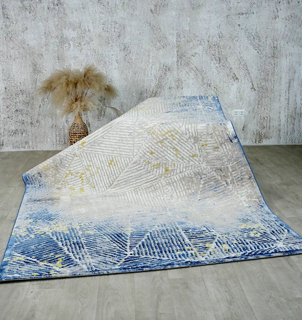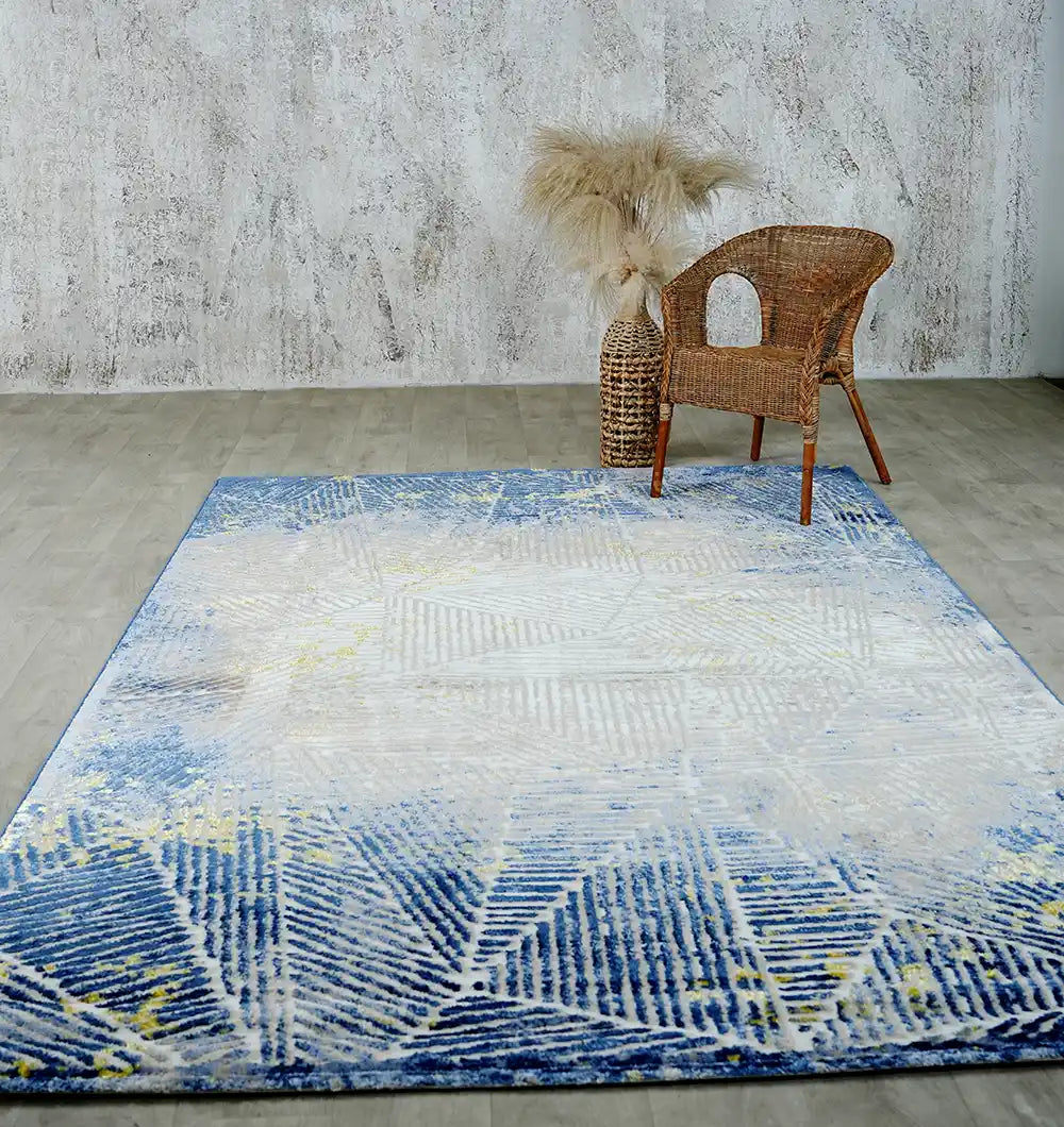 Geometric patterns in denim blue and silver create a striking visual impact in this modern geometric rug. The design features overlapping triangular motifs with distressed yellow accents, providing a weathered yet contemporary feel. As one of our precision machine made rugs, it offers a flat, durable surface that maintains its crisp lines and intricate textures. The polyester silk material lends a luxurious sheen and a velvety touch that shifts beautifully under different lighting. This rectangle silk rug is crafted for longevity and ease of care, making it a functional piece of art for your floor. Its cool color palette and architectural style bring a fresh, sophisticated energy to any updated interior without the need for traditional fringes.