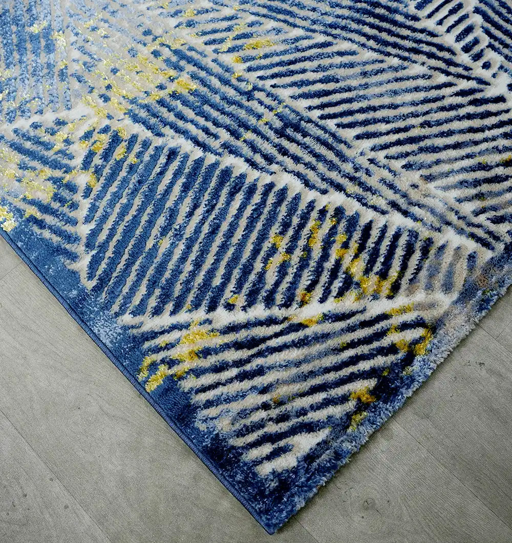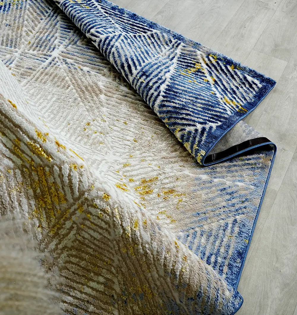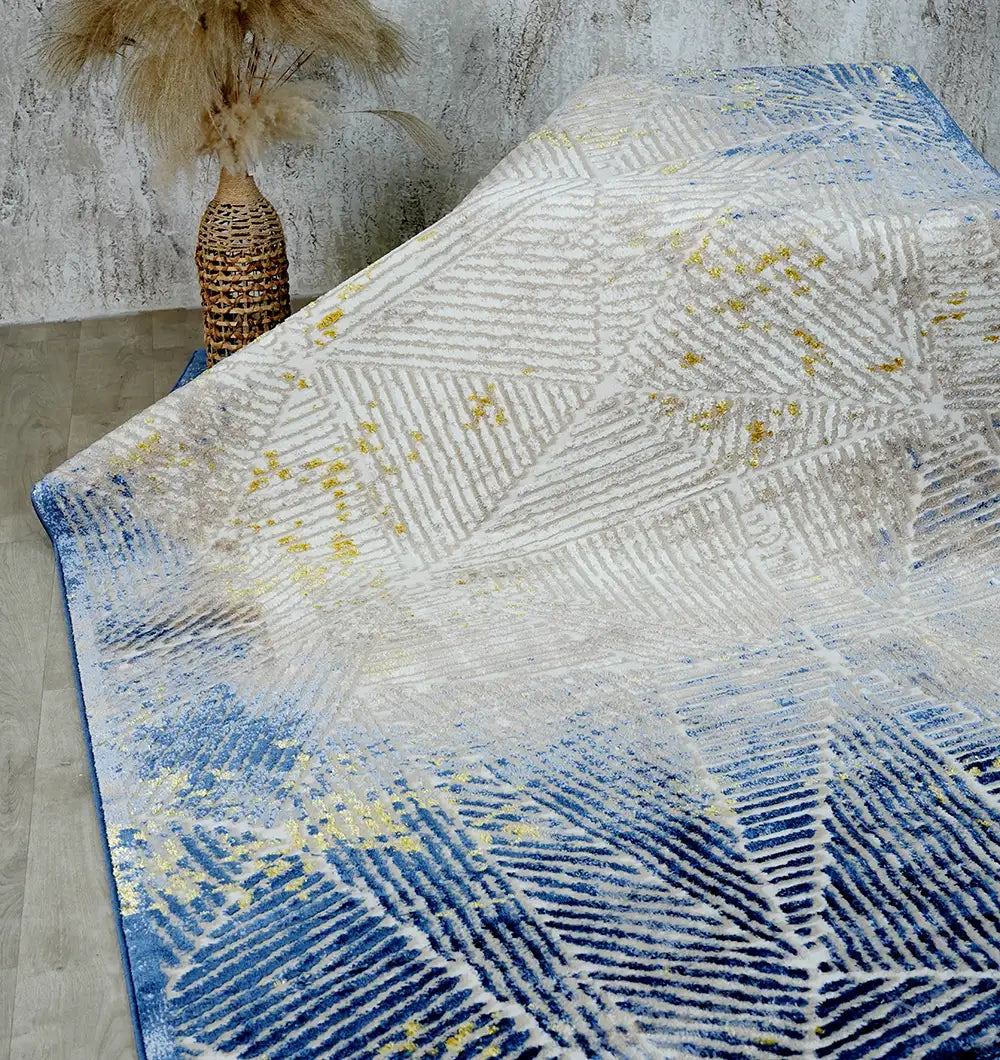Geometric patterns in denim blue and silver create a striking visual impact in this modern geometric rug. The design features overlapping triangular motifs with distressed yellow accents, providing a weathered yet contemporary feel. As one of our precision machine made rugs, it offers a flat, durable surface that maintains its crisp lines and intricate textures. The polyester silk material lends a luxurious sheen and a velvety touch that shifts beautifully under different lighting. This rectangle silk rug is crafted for longevity and ease of care, making it a functional piece of art for your floor. Its cool color palette and architectural style bring a fresh, sophisticated energy to any updated interior without the need for traditional fringes.