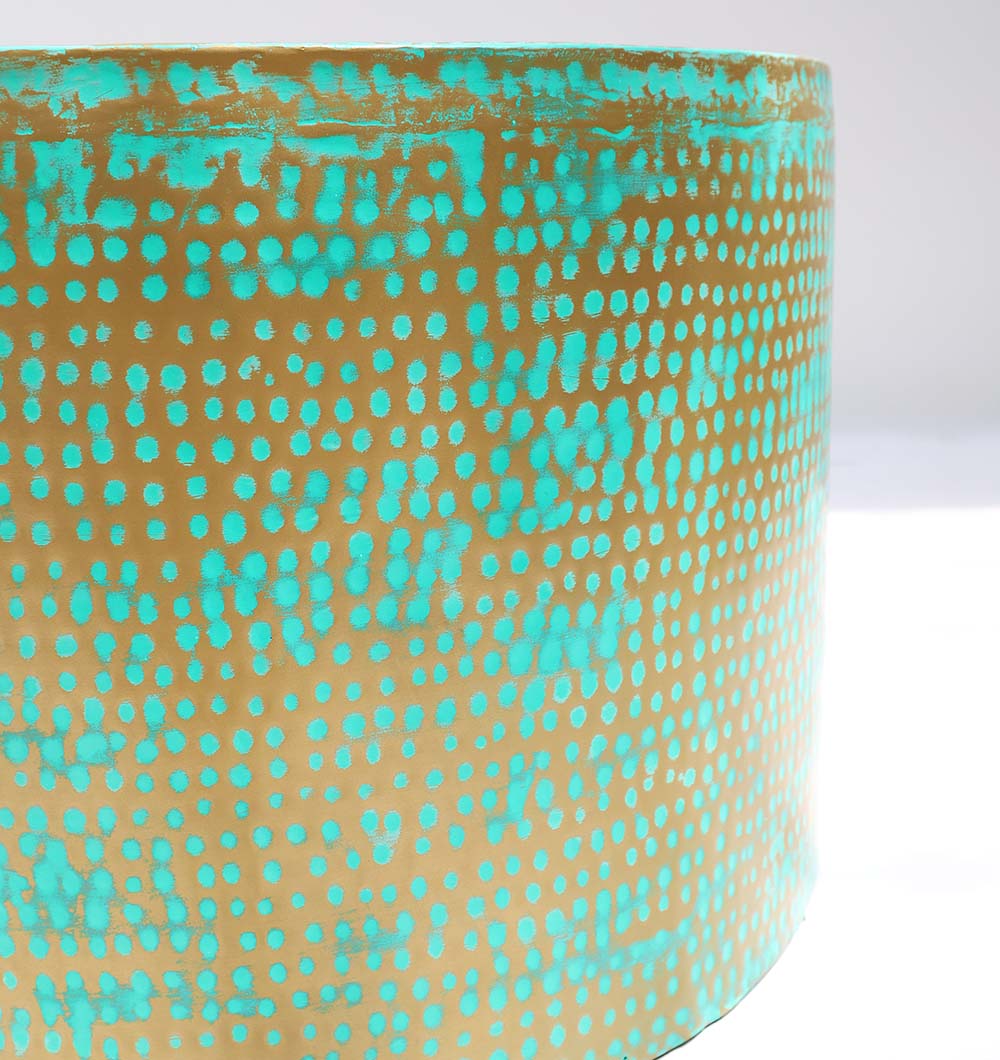 Make a bold statement with this round coffee table in a turquoise patina look with a dotted, textured finish across the top and sides. The drum shape gives a clean, modern feel and a stable surface for drinks, books, or décor. Made from 100% iron, this metal drum coffee table is easy to style in both bright and neutral spaces.