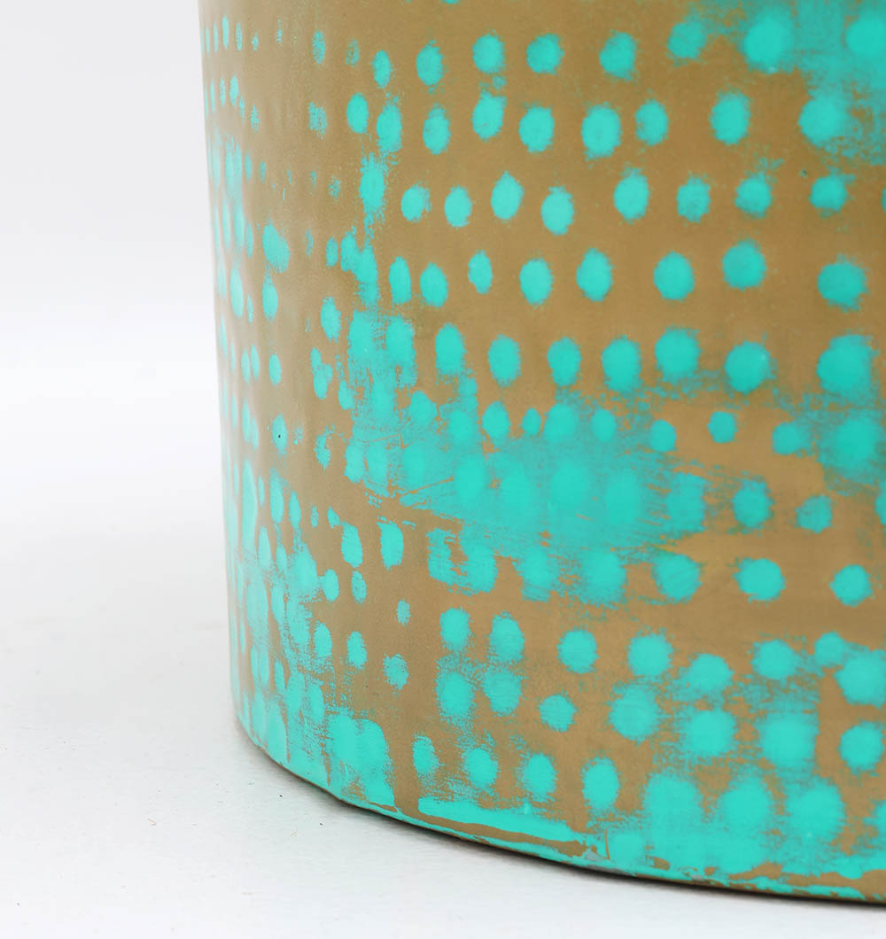 Add a pop of color with this round metal side table in a turquoise patina look with an all-over dotted texture. The drum shape makes it easy to use as a compact surface for a drink, décor, or a small tray, while still feeling sturdy. Made from 100% iron, this drum accent table fits neatly next to a sofa, reading chair, or bedside.