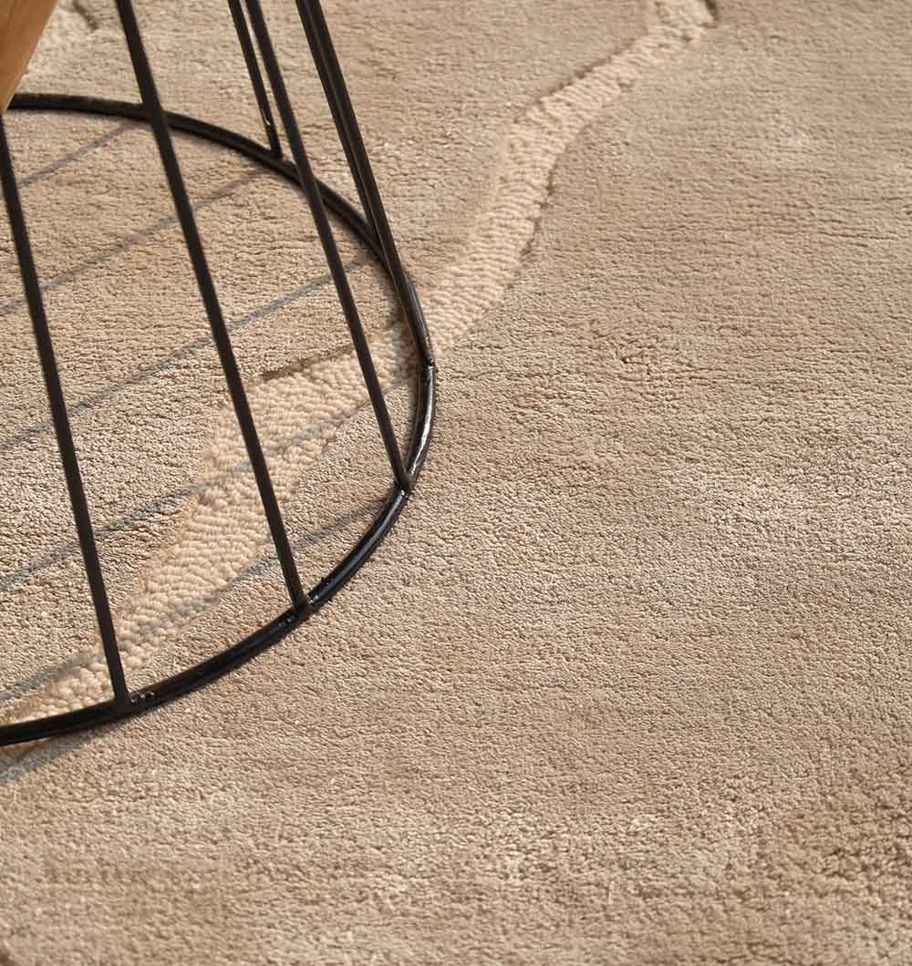 This rectangular rug has an organic, carved design that feels like soft silhouettes over a calm neutral base. The main color is warm greige with sandy beige highlights and subtle depth from the cut pattern, giving it a quiet, layered finish. Handtufted for a smooth, cushioned feel, the viscose, wool, and cotton blend adds a gentle sheen that shifts with the light. Use it as a neutral abstract rug to keep the room relaxed, or style it as a viscose blend rug when you want a refined look with soft shine. The understated carving also makes it a strong modern beige rug for simple, clean interiors.
