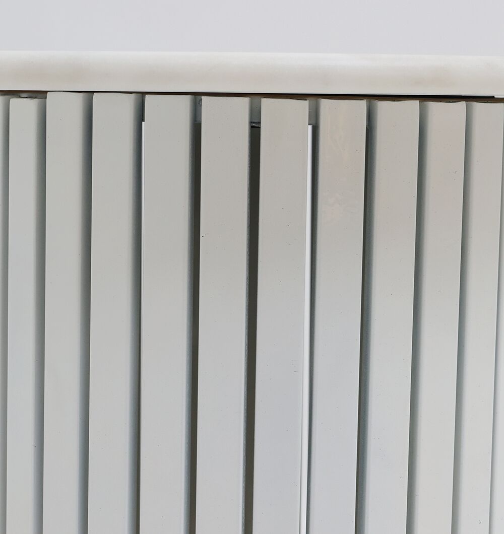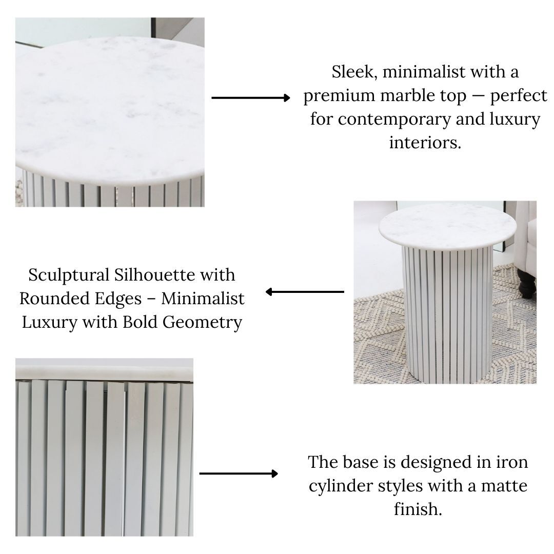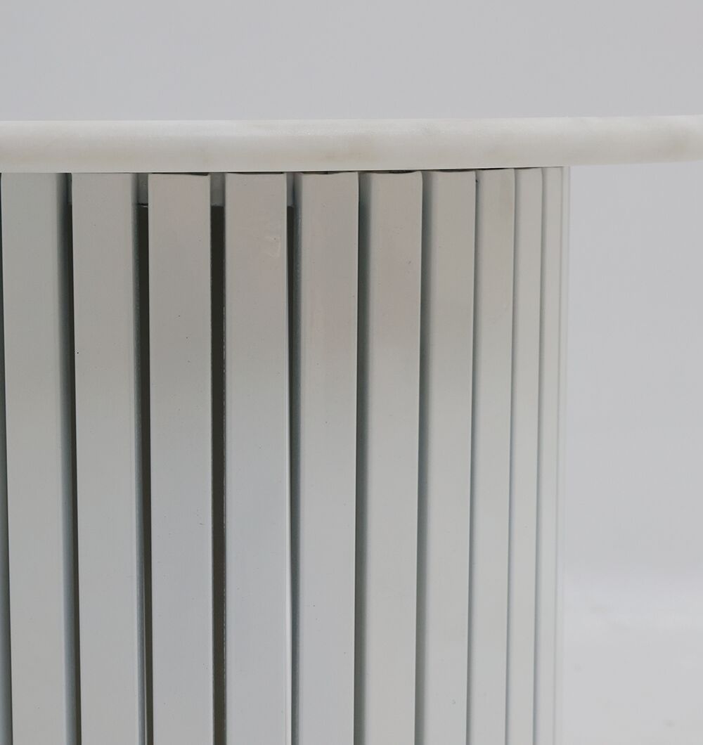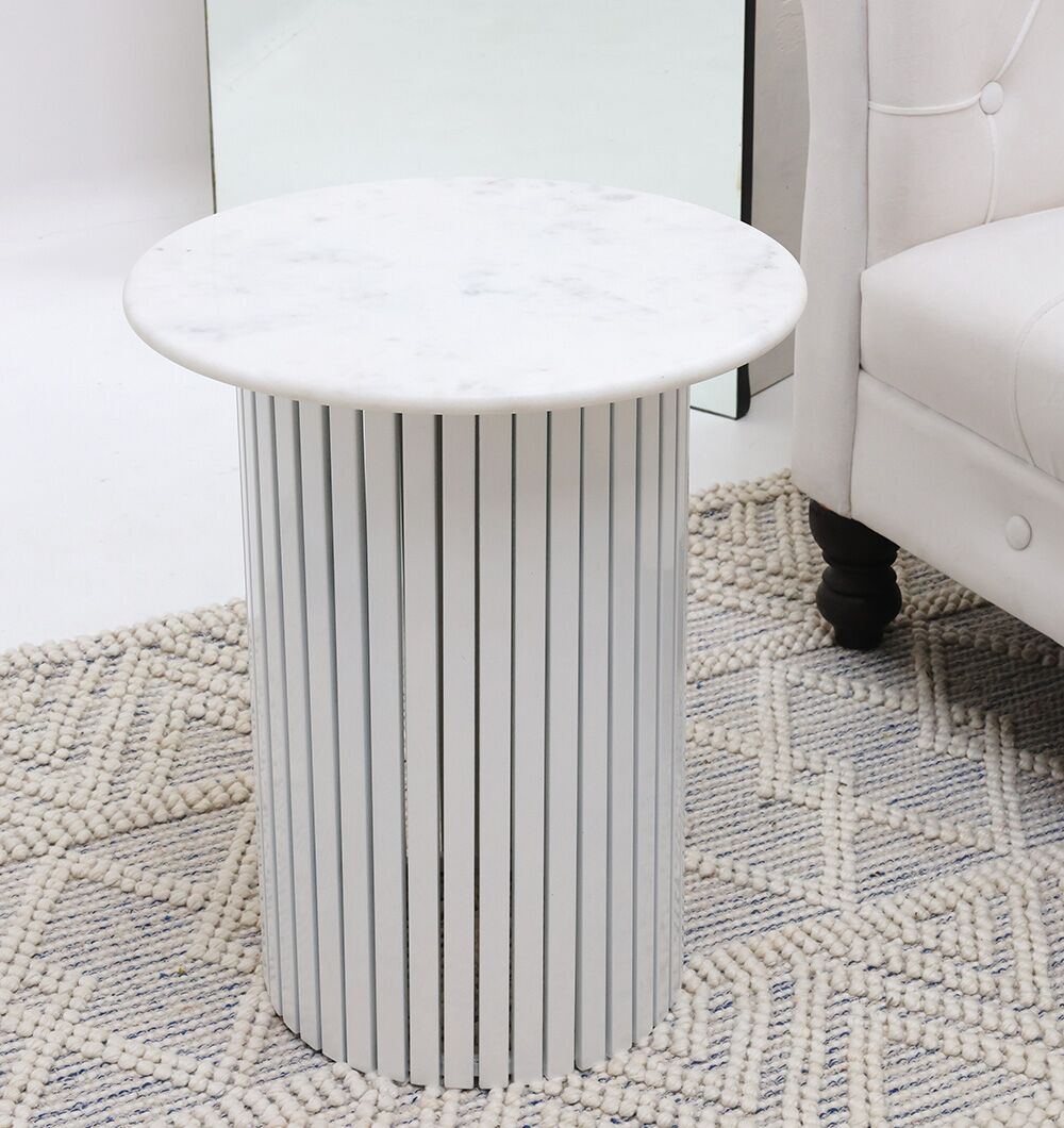Give your space a clean, modern accent with this round marble side table in white gloss. The smooth marble top shows soft natural veining, paired with a vertical slatted base that adds texture without feeling heavy. Its drum shape is easy to place beside a sofa or bed for a drink, book, or small décor. Made from 70% marble and 30% iron, this white marble side table suits bright, contemporary interiors.