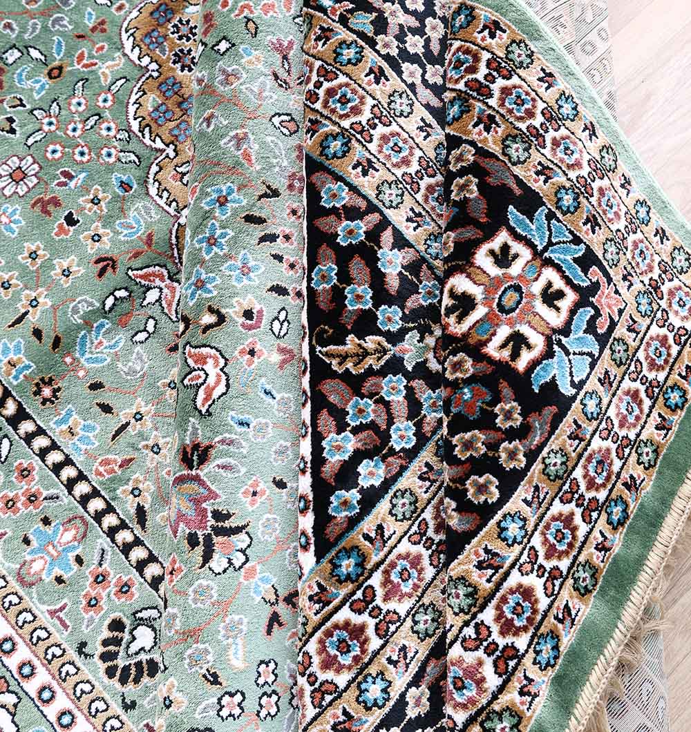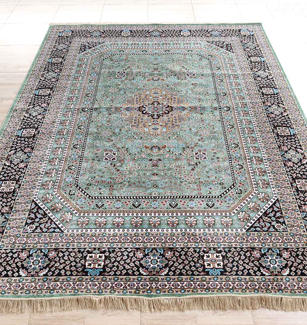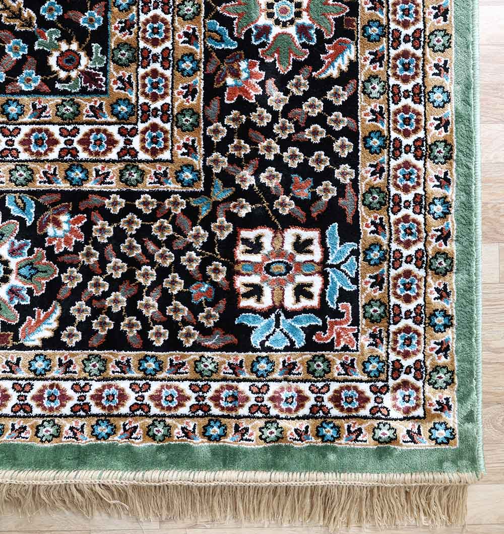 Bring calm color and classic detail to your space with this teal Persian rug. The soft teal field is filled with tiny floral motifs and a warm medallion center, framed by a dark border with crisp pattern work for a rich, layered look. This traditional area rug adds instant depth without feeling heavy, and the machine-made polyester surface is smooth, durable, and easy to maintain for daily living. Use it to anchor seating, soften hard floors, or add a polished finish to your décor. A perfect vintage style rug feels for homes that love timeless design with a fresh touch.