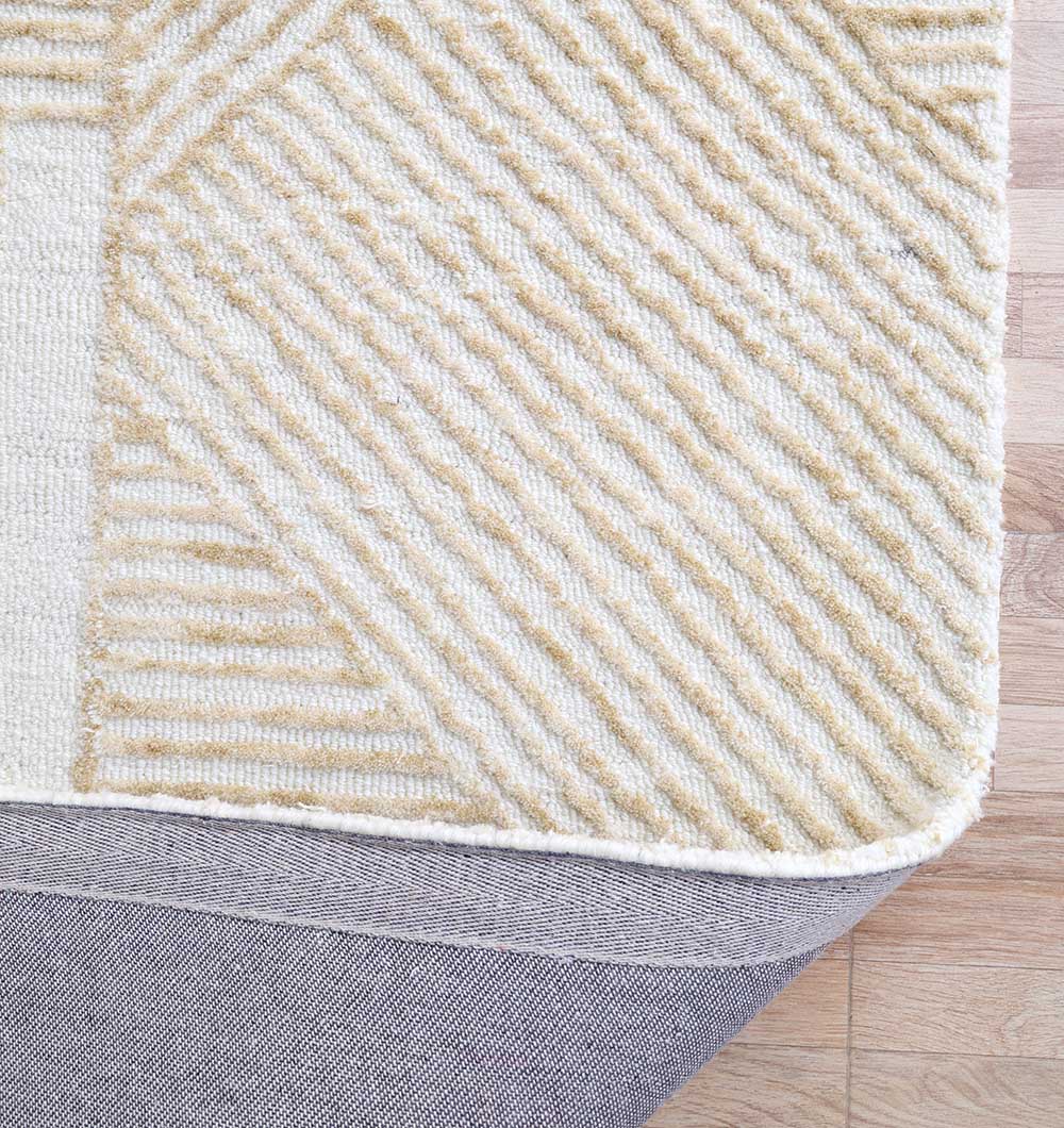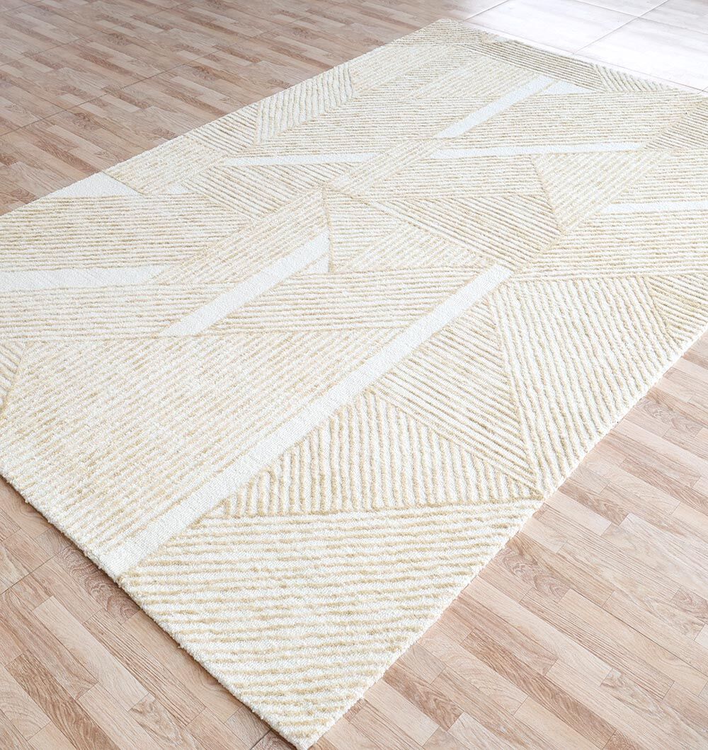 Cream and light beige tones form a patchwork of angled blocks and fine ribbed lines, giving this rug a modern look with gentle texture. Wool adds warmth and a soft feel underfoot, while cotton helps it stay comfortable for everyday living. The mix of matte and raised areas makes the pattern visible without feeling loud, so it works well with simple furniture, light woods, and neutral upholstery. As a hand tufted rug, it’s a good choice when you want structure and definition in the space without heavy color. Style it as a calm geometric wool rug or a versatile neutral area rug.