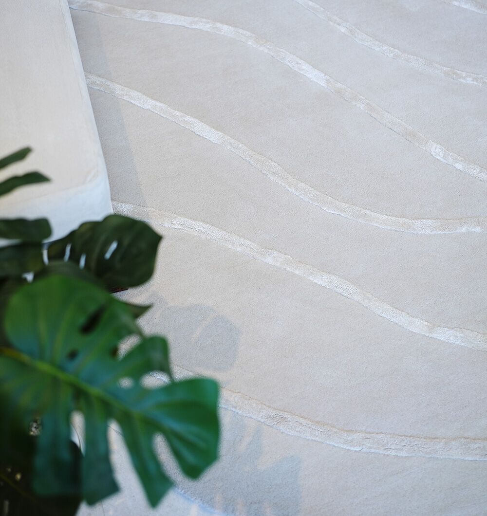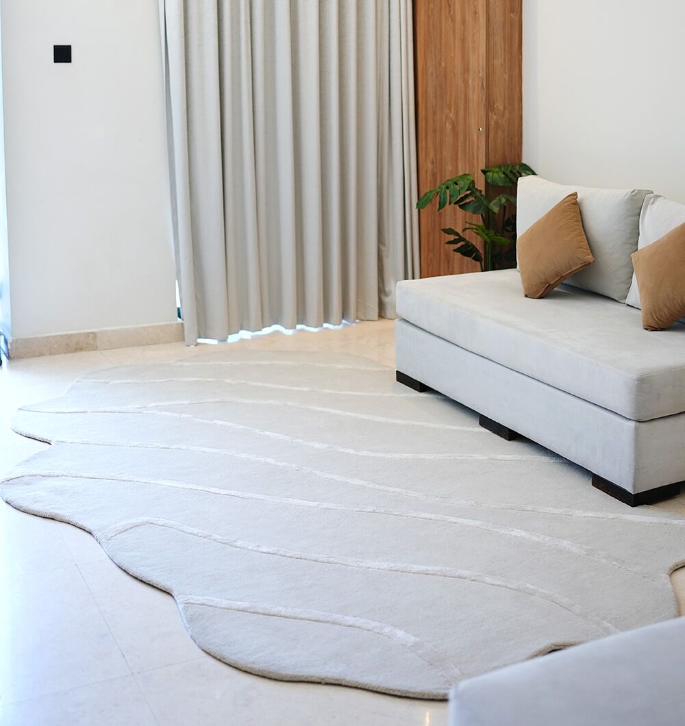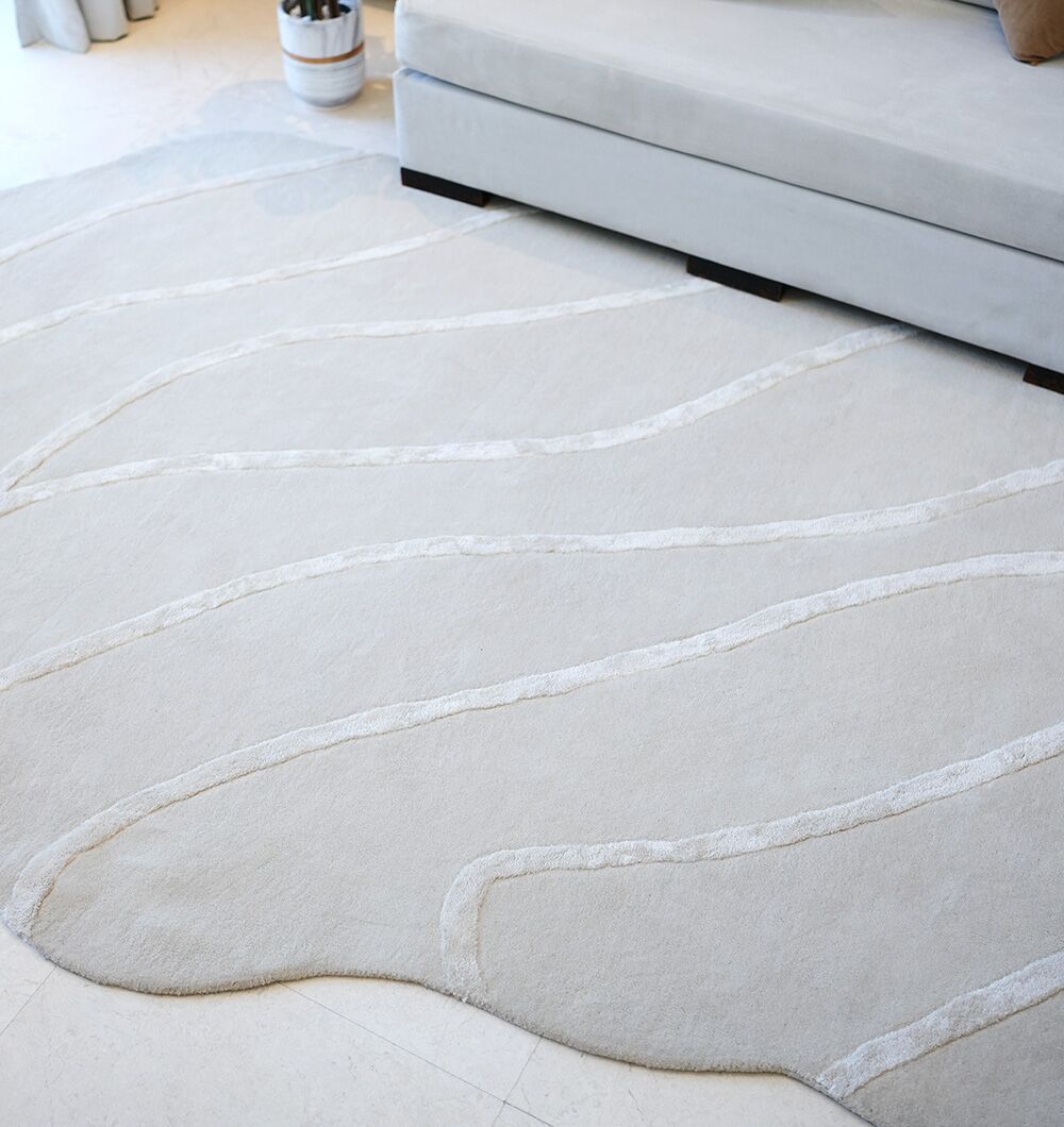This irregular rug keeps the room light with a soft ivory base and gentle wave lines in pale beige. The hand-tufted surface has a smooth feel, and the wool, cotton, and viscose blend adds a subtle sheen while staying comfortable for everyday use. Style it where you want a calm look but still need texture and shape. Use it as a hand tufted wool rug in a main seating area, as an ivory modern rug to brighten neutral interiors, or as a wavy pattern rug to add movement without bold contrast.