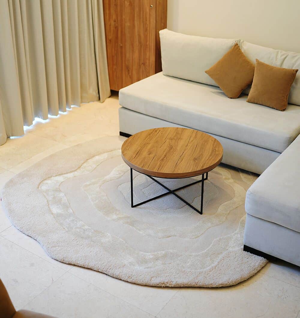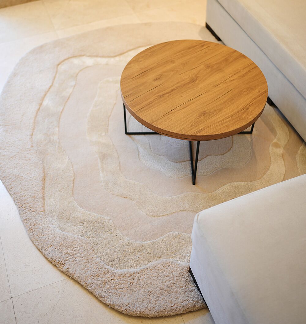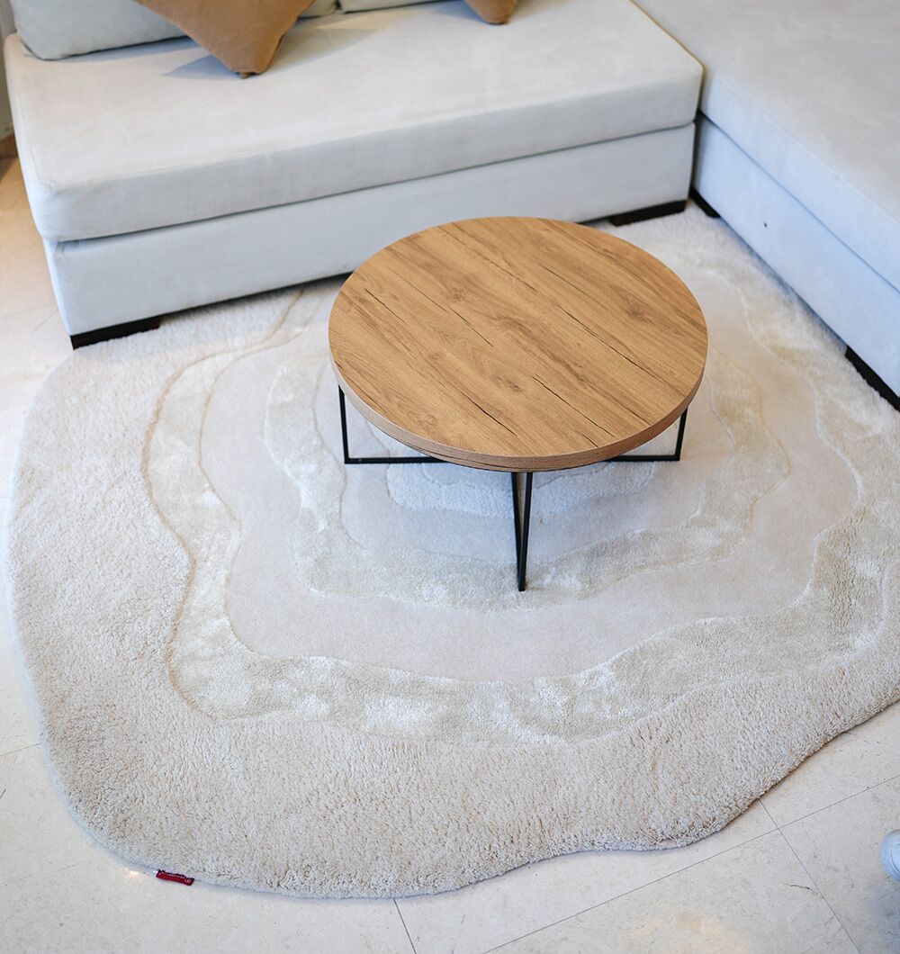 Soft ivory and light grey tones blend in a calm, cloud-like pattern with an organic, freeform outline. The sculpted texture adds gentle depth and a slight sheen, making the surface feel warm and inviting without looking busy. This irregular area rug is perfect for breaking up straight lines in modern spaces and looks great with light woods, black accents, or neutral sofas. Use this modern abstract rug to anchor a seating area, or style it beside the bed for a cozy landing. The handtufted wool rug mix feels plush underfoot and adds a clean, airy finish to your room.
