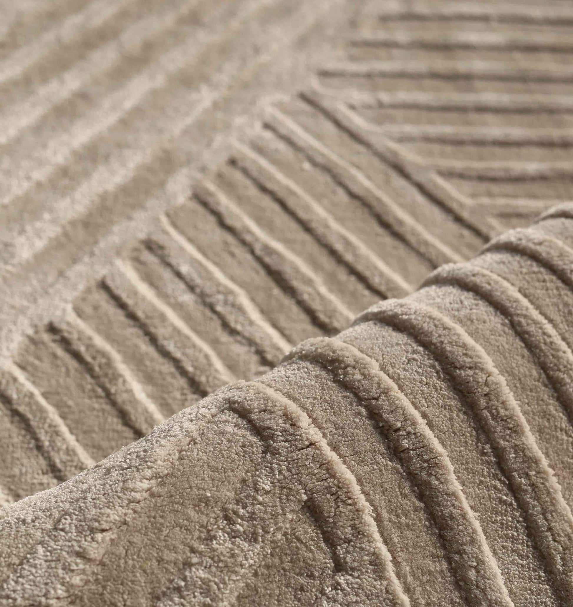 Built with bold triangles and fine linework, this rectangular rug adds structure while keeping the look calm. The color sits in a warm greige mix of beige and soft grey, with a light sheen that shifts as you move around the room. Loom knotted for a neat, even finish, the viscose and cotton blend feels smooth underfoot and works well in everyday spaces. Use it as a geometric viscose rug to sharpen a modern setup, or anchor seating with a neutral area rug that pairs easily with leather, wood, and black accents. The repeating shapes also make it a smart triangle pattern rug when you want texture without loud color.