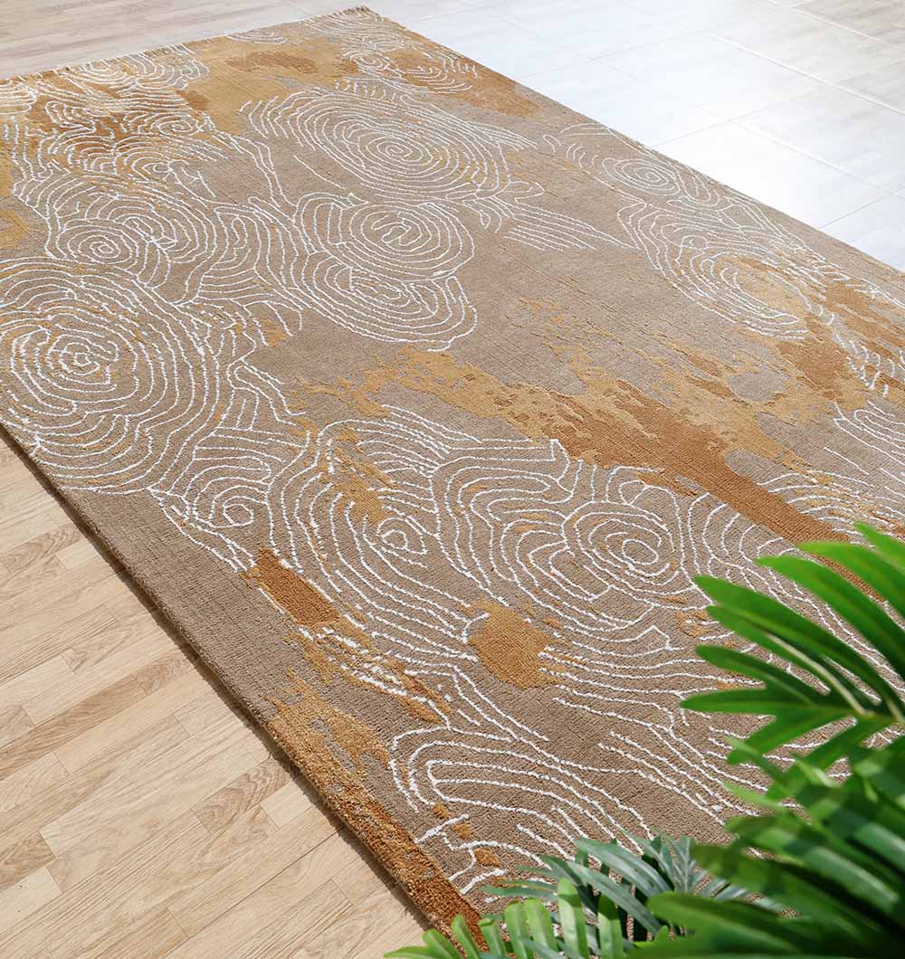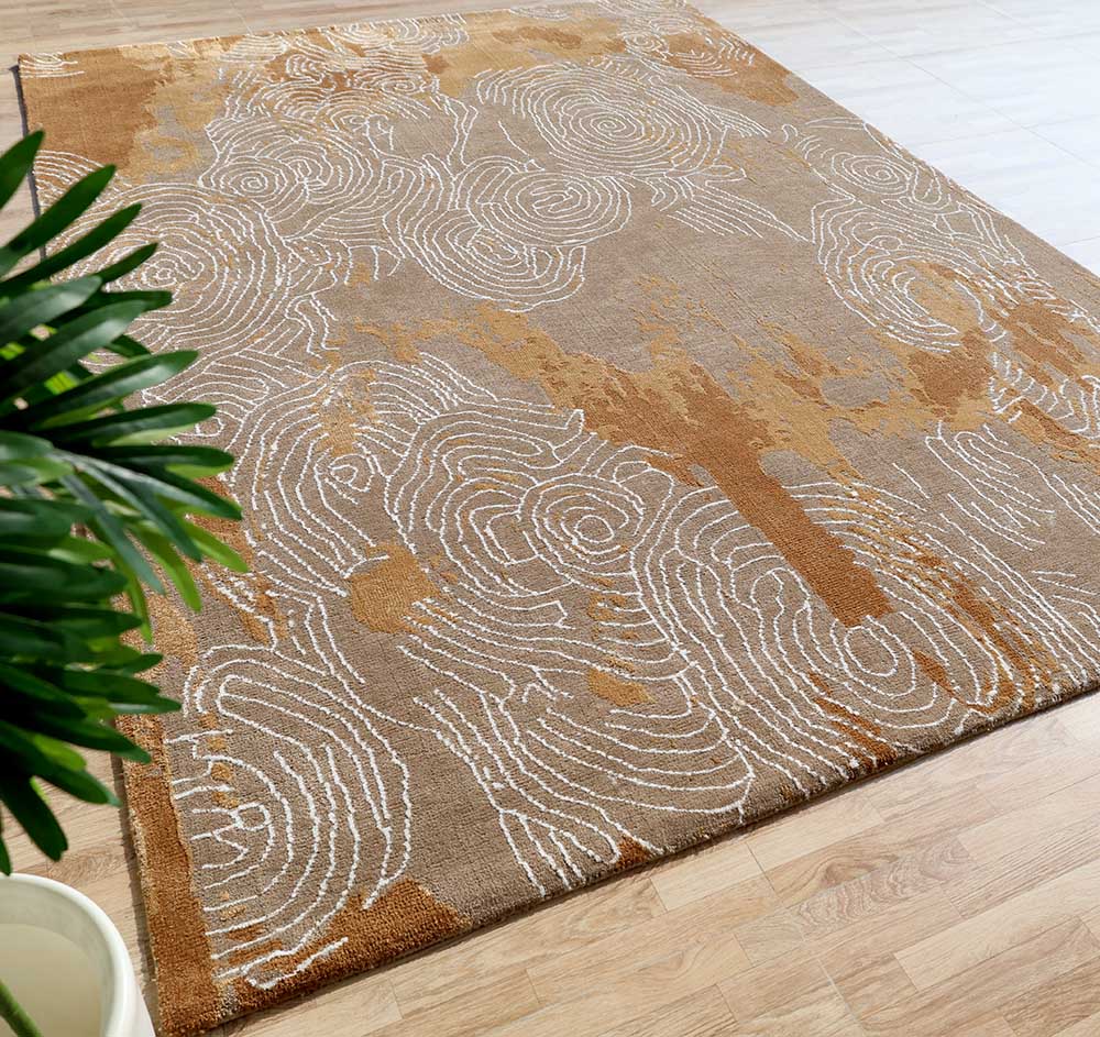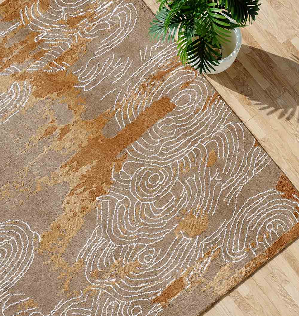 Warm rust brown and taupe blend across the surface with fine ivory swirl lines that feel like hand-drawn rings. The layered, painterly background keeps it relaxed, while the linework adds detail without making the room feel busy. Machine-made from polyester with cotton, it has a smooth feel, lays flat, and is easy to maintain for everyday use. Pair it with wood furniture, black accents, or cream seating to pull out the contrast. Style it as an abstract swirl rug, keep it grounded with a brown and beige rug, and enjoy the practicality of a machine-made rug.
