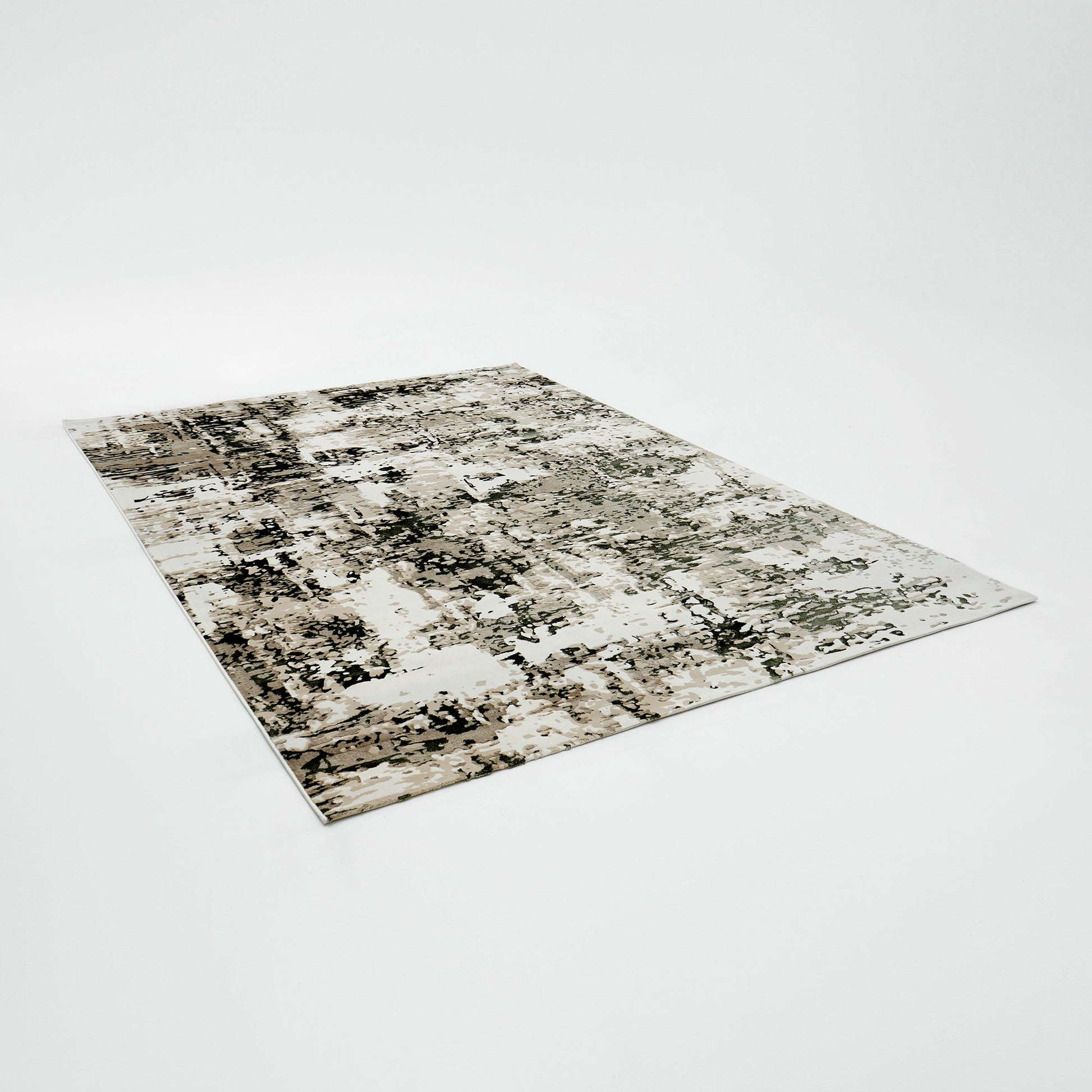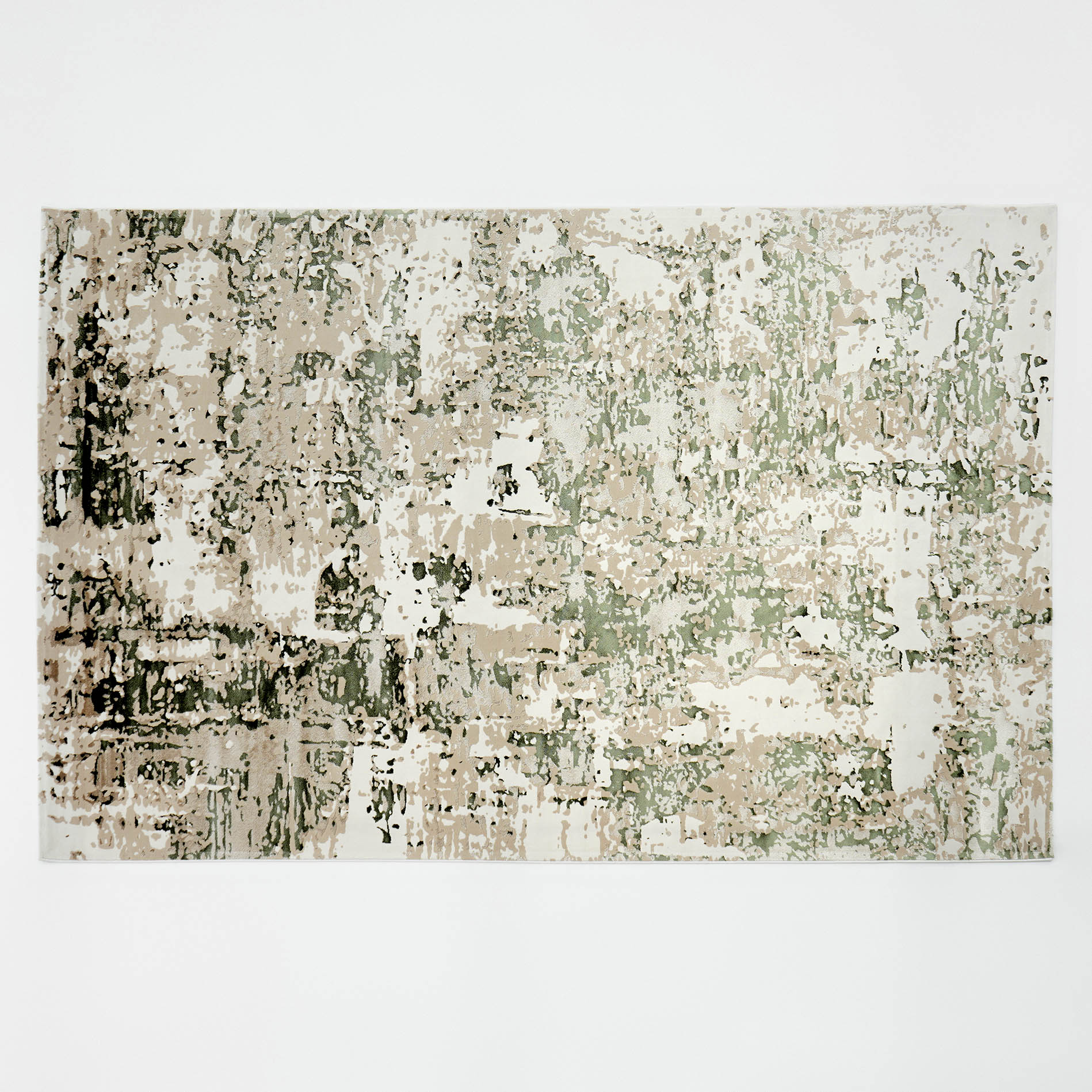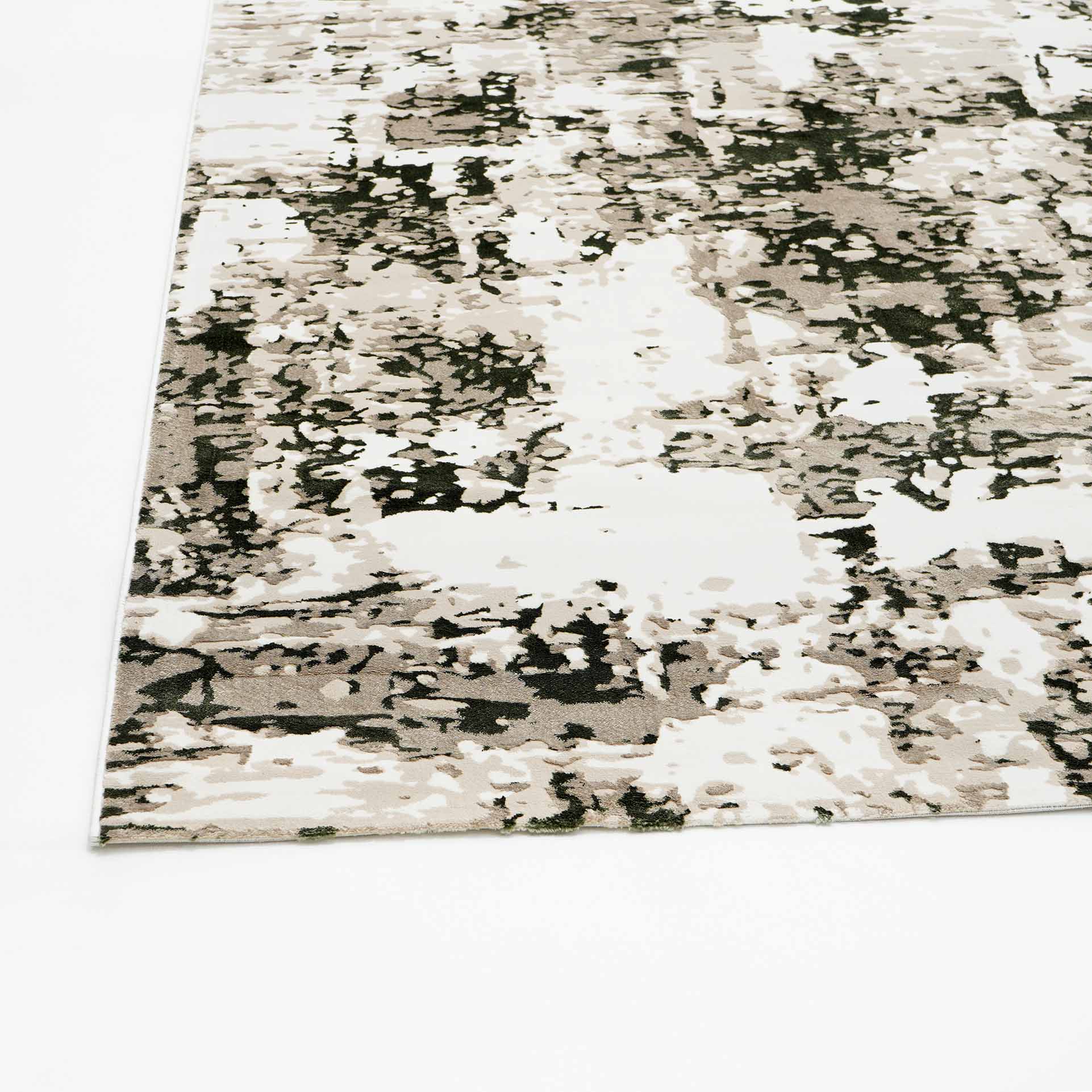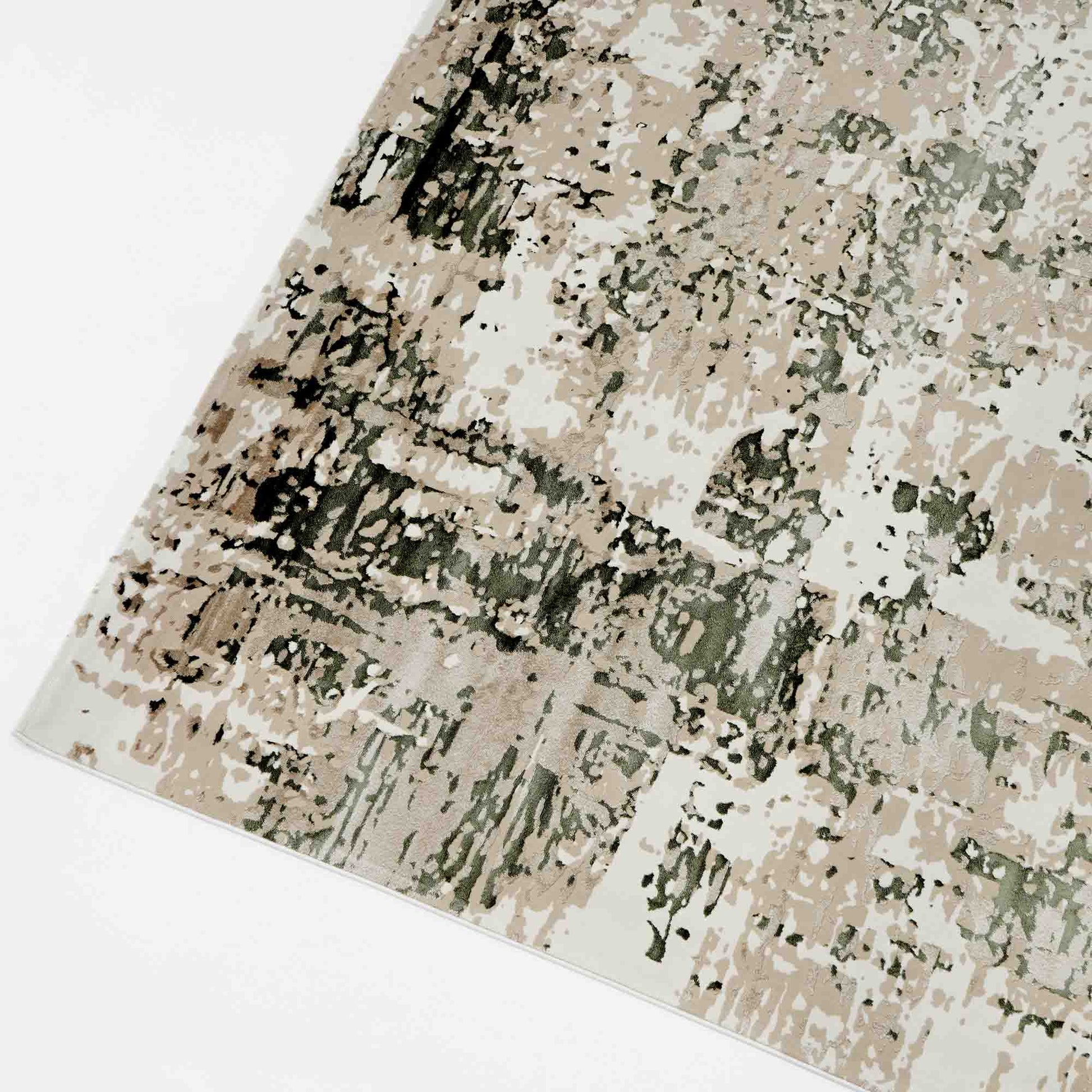 Soft cream and beige tones are layered with sage green and small charcoal details for a relaxed, natural look. The worn-in abstract pattern adds depth without sharp lines, so it blends easily with light wood, rattan, or simple modern furniture. This polyester, machine-made rug feels smooth underfoot and is easy to keep tidy for everyday use. Place it under a sofa set to warm up the space or use it near a bed to add gentle color without taking over the room. It works especially well as a green abstract rug and a beige area rug, with the durability of a machine-made rug.
