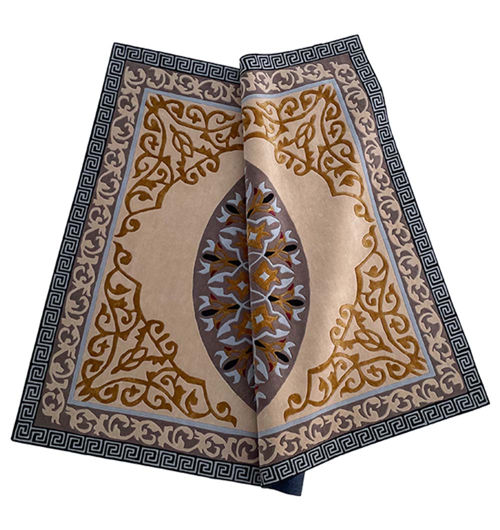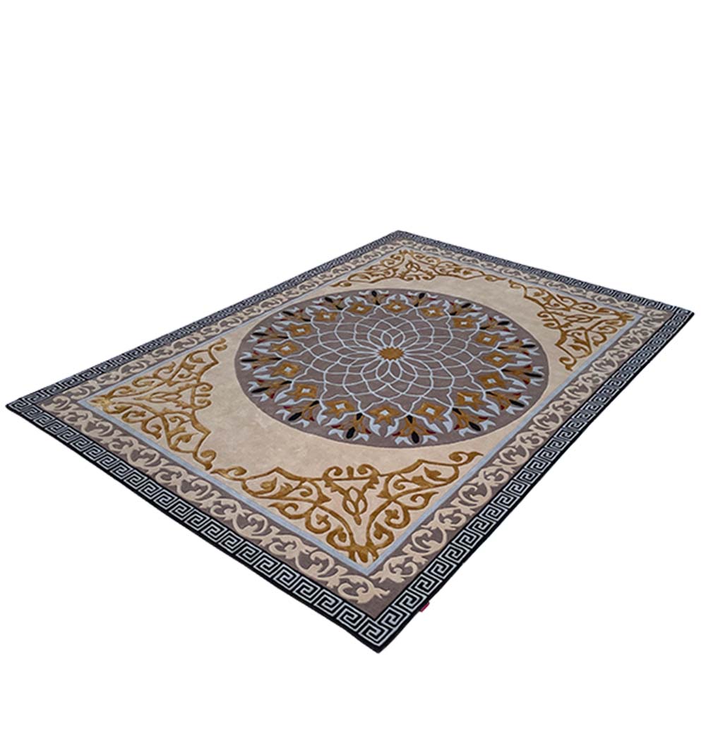 A warm beige base is framed with a bold charcoal Greek-key border and detailed golden scroll corners, finished with a large central medallion in taupe, slate, and soft mustard. The layout feels classic and formal, making the space look more finished without needing extra decor. Wool gives it a cozy, cushioned feel, while cotton supports comfortable everyday use. As a hand tufted rug, it has a plush surface and crisp pattern edges that hold up well in busy areas. Pair it with wood furniture, neutral seating, or brass accents for a balanced look. A timeless medallion area rug and a statement traditional wool rug.