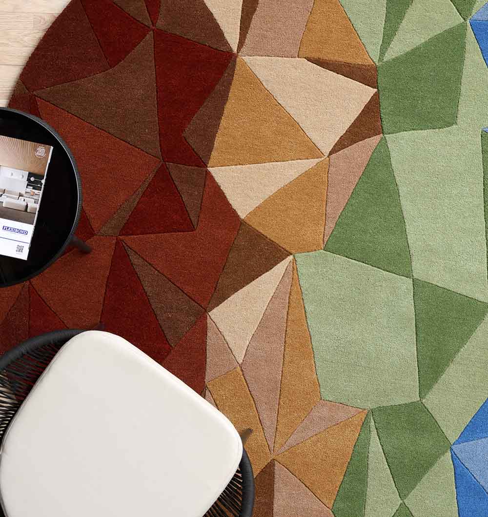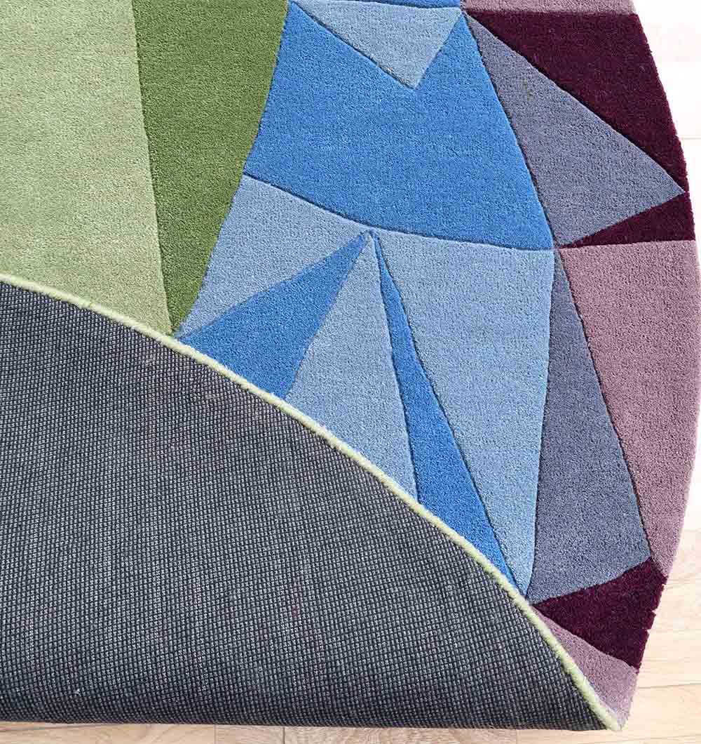 Bold blocks of rust, tan, olive green, sky blue, and deep purple create a lively patchwork look with sharp, modern angles. This colorful rug brings instant energy to neutral spaces while still feeling balanced. The round shape is great for centering a seating area, and the hand-tufted finish adds a soft, smooth feel underfoot. Use this round area rug to brighten up a corner, frame a coffee table, or add a statement layer in an open layout. A standout geometric rug that pairs well with wood tones, black accents, and simple decor.