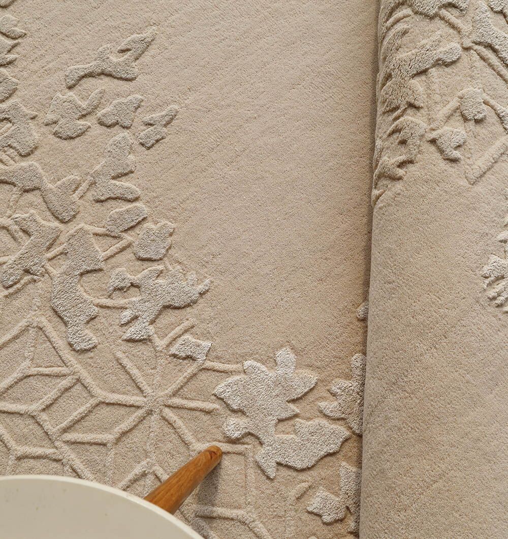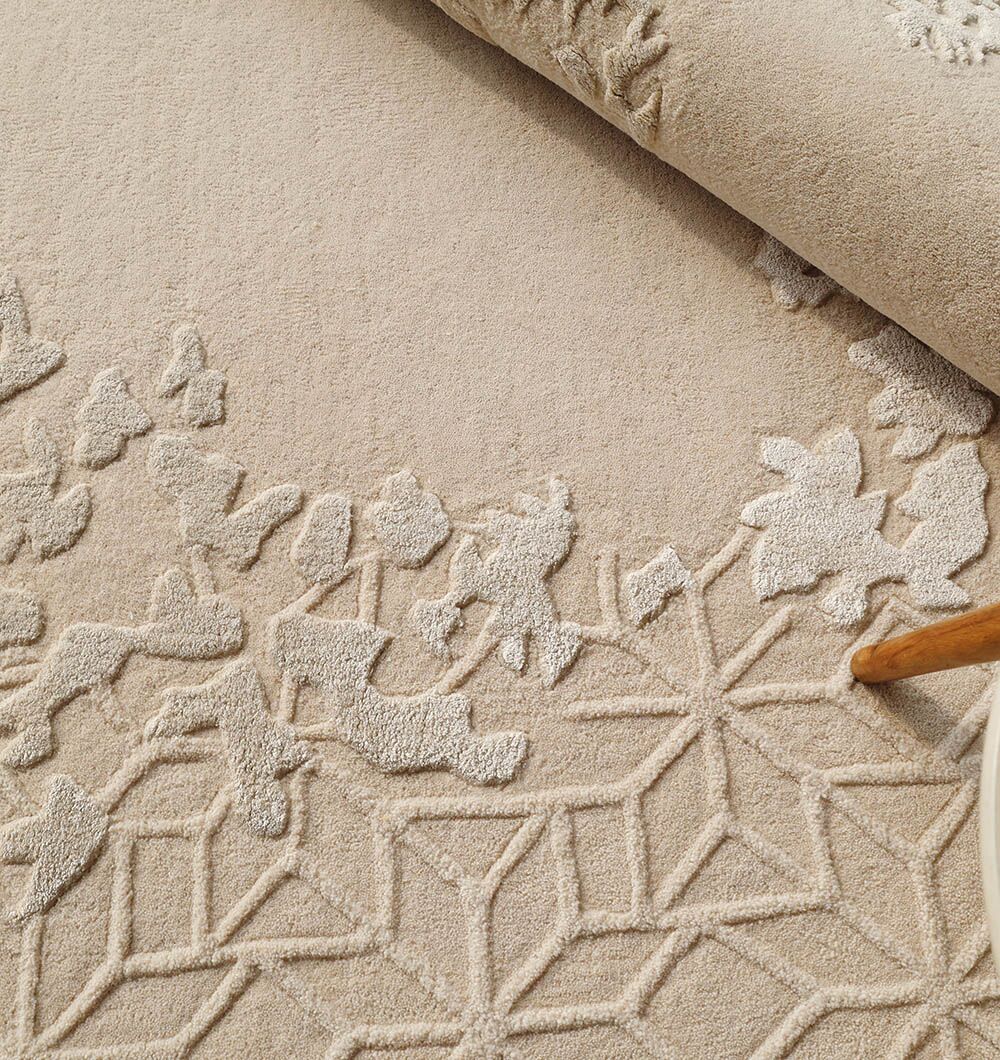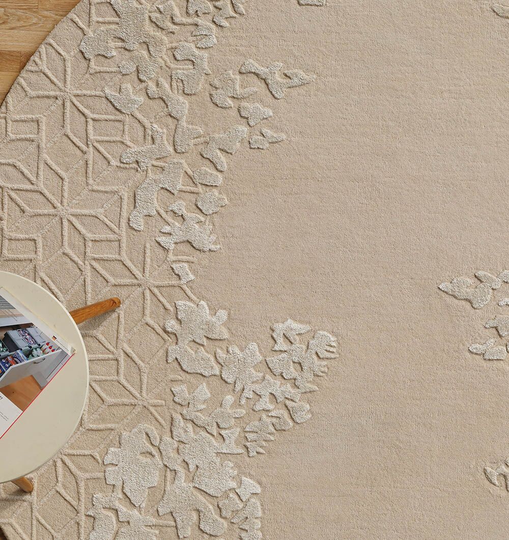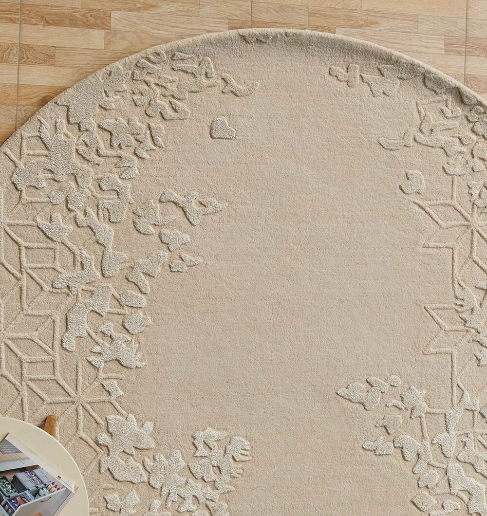 Warm beige and soft ivory shades give this round rug a calm, airy look. The handtufted pile has a smooth center with raised leaf clusters and a quiet lattice texture around the edge, adding depth without busy color. The wool, viscose, and cotton blend feels plush with a gentle sheen that lifts the pattern in daylight. Use it as a round area rug under a coffee table to soften sharp lines, or choose this floral round rug to bring a relaxed garden touch to modern spaces. It also works as a carved wool viscose rug when you want texture that stays subtle and elegant.