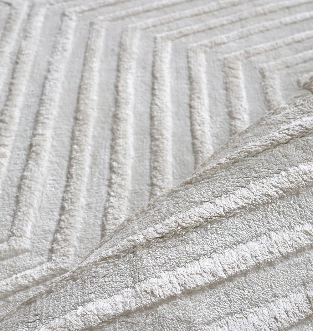 Clean and calming, this light grey and ivory rug features a raised geometric pattern with fine carved lines that add depth without feeling busy. The soft wool blend feels warm underfoot, while the loom knotted finish gives it a neat, tailored look. Style it with pale woods, black accents, or natural textures for an easy modern setup. Use this geometric area rug to sharpen a minimal space, or layer it as a neutral modern rug to keep the room bright and balanced. A loom knotted rug like this is perfect when you want subtle texture that still makes a statement.