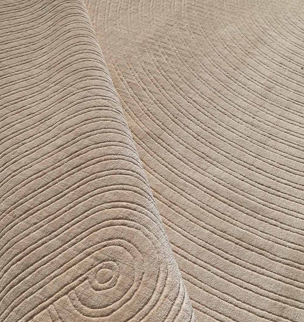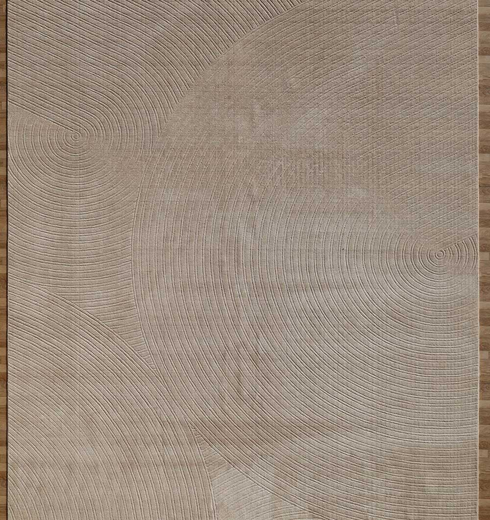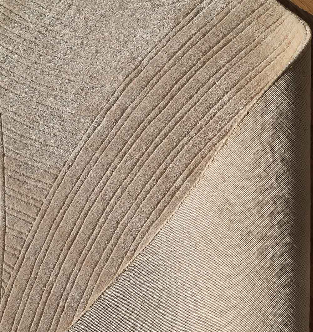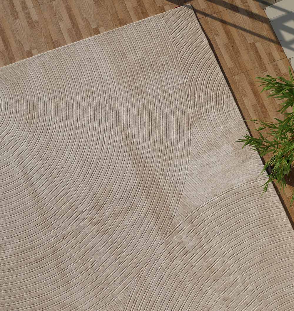 Soft beige with carved arc lines creates a calm, modern texture that adds depth without strong contrast. This loom knotted rug is made from polyester Thai yarn with cotton, giving it a durable feel for everyday use. The sweeping curves bring a gentle sense of movement, making this beige textured rug easy to style with light woods, black accents, and neutral upholstery. Place this modern area rug under a sofa setup or workspace to keep the room looking clean, warm, and well defined.