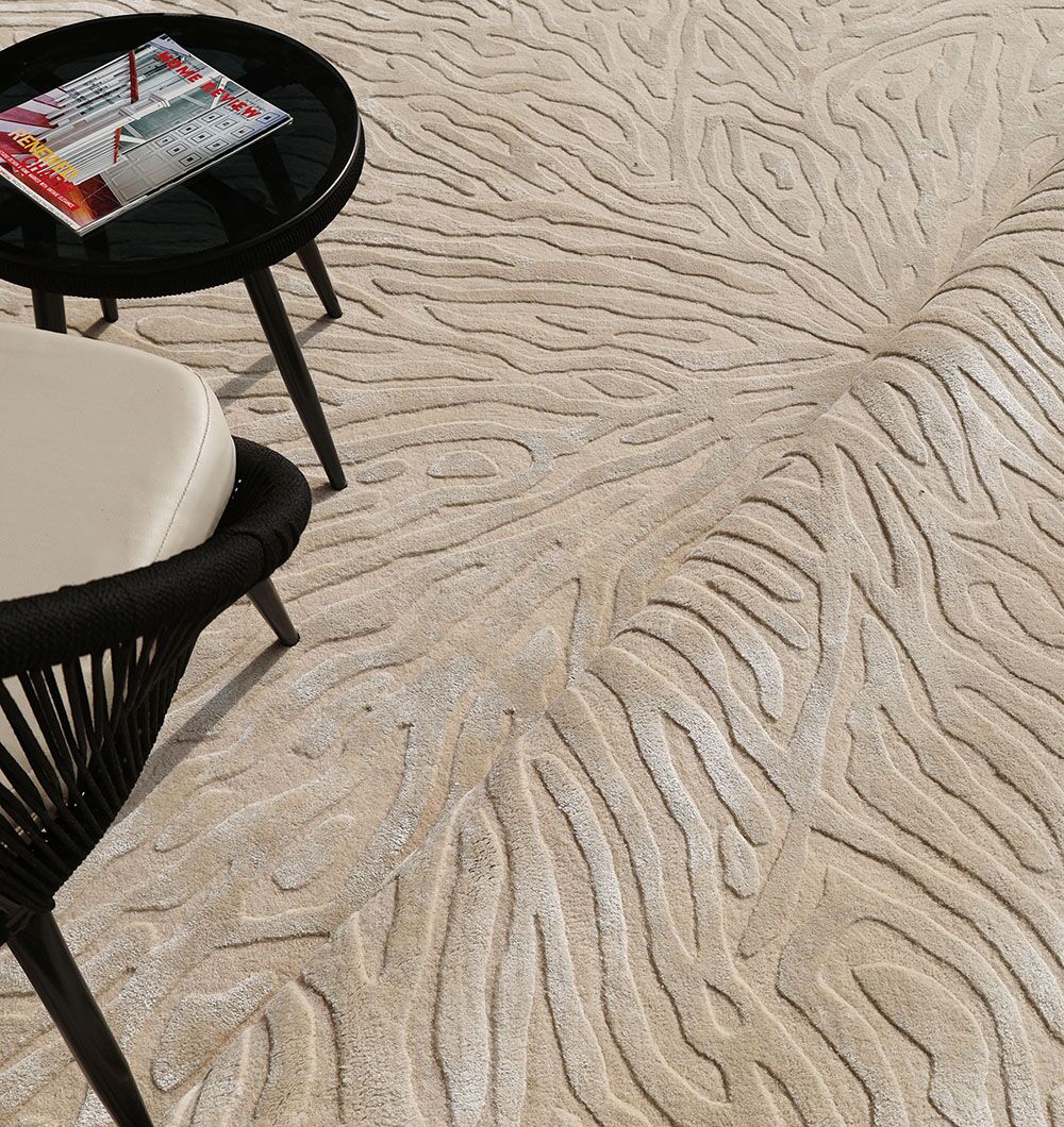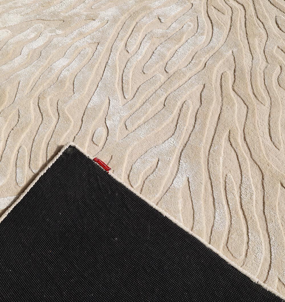 Soft beige and ivory tones meet sculpted texture in this calm, modern design. Carved lines flow outward like a gentle sunburst, giving the surface depth and movement without feeling busy. Wool adds a cozy, comfortable feel, while viscose brings a light sheen that shifts as you walk around the room. This beige abstract rug is an easy match for warm wood, black accents, and natural fabrics. Use it as a textured handtufted rug to add interest to a simple space, or layer it with neutral furniture for a relaxed look. A refined wool viscose rug that feels plush and looks clean, perfect for everyday styling.