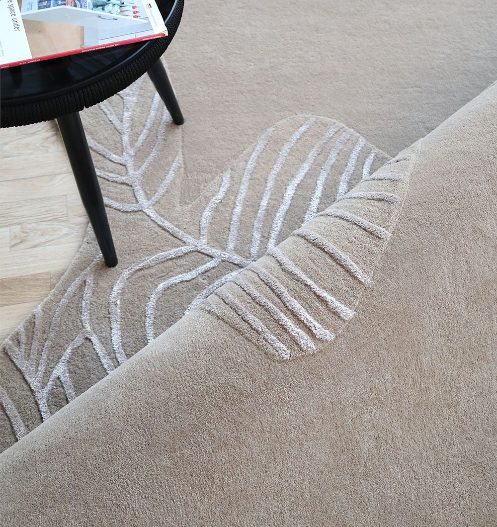Earthy taupe fills the base of this irregular rug, while raised ivory leaf linework wraps across the surface for a calm, modern contrast. The hand-tufted pile feels smooth with a soft cushion, and the wool, viscose, and cotton blend adds a light sheen that highlights the carved details. Use it as a hand tufted wool blend rug to ground neutral furniture, choose it as a taupe leaf rug for texture without busy pattern, or style it as an irregular shape area rug to soften straight room layouts.
