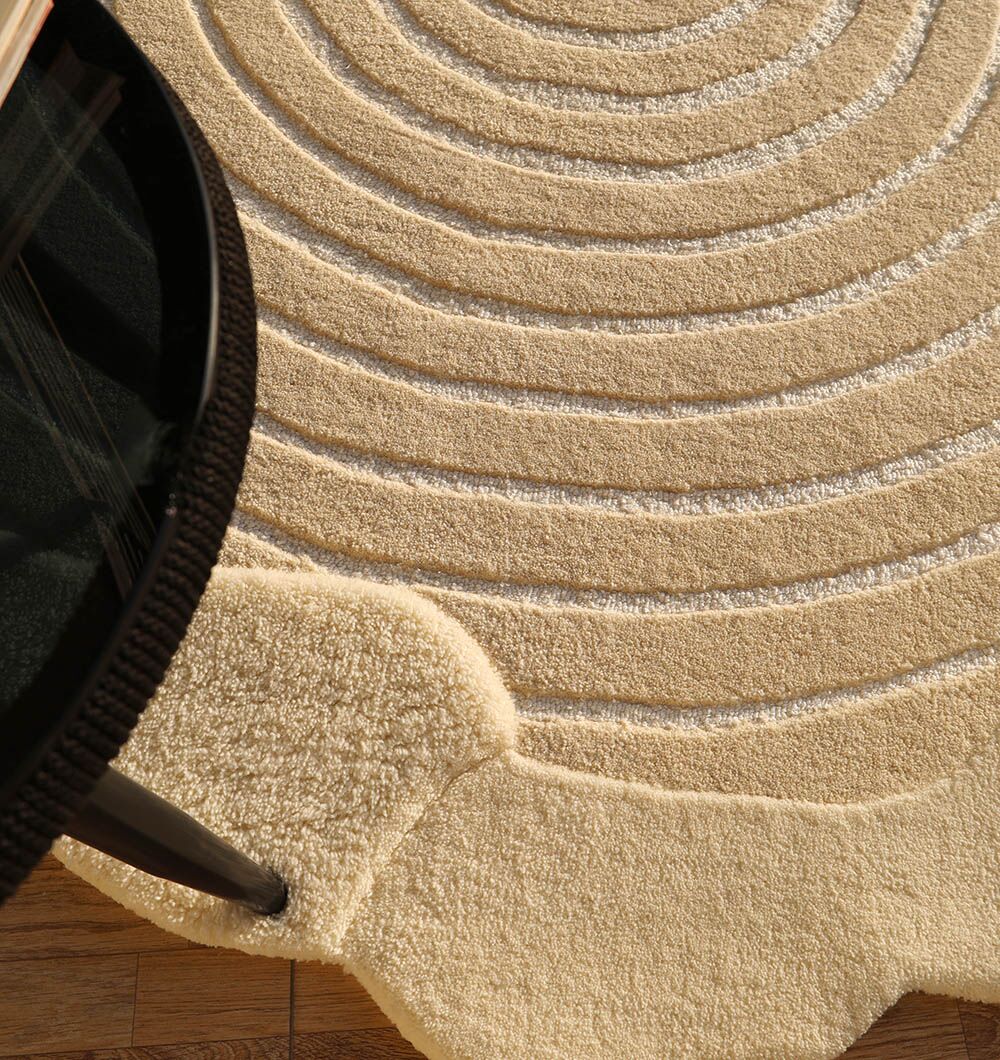 Warm beige tones and soft carved circles give this rug a calm, centered look. The uneven outline adds a modern twist, while the raised rings bring gentle texture you can feel underfoot. This irregular shape rug is an easy way to soften a space and break up straight furniture lines. Use it as a cozy beige area rug with light wood, cream sofas, or earthy accents. The smooth finish and hand-tufted detail make it a comfortable hand tufted rug for everyday lounging and relaxed styling.