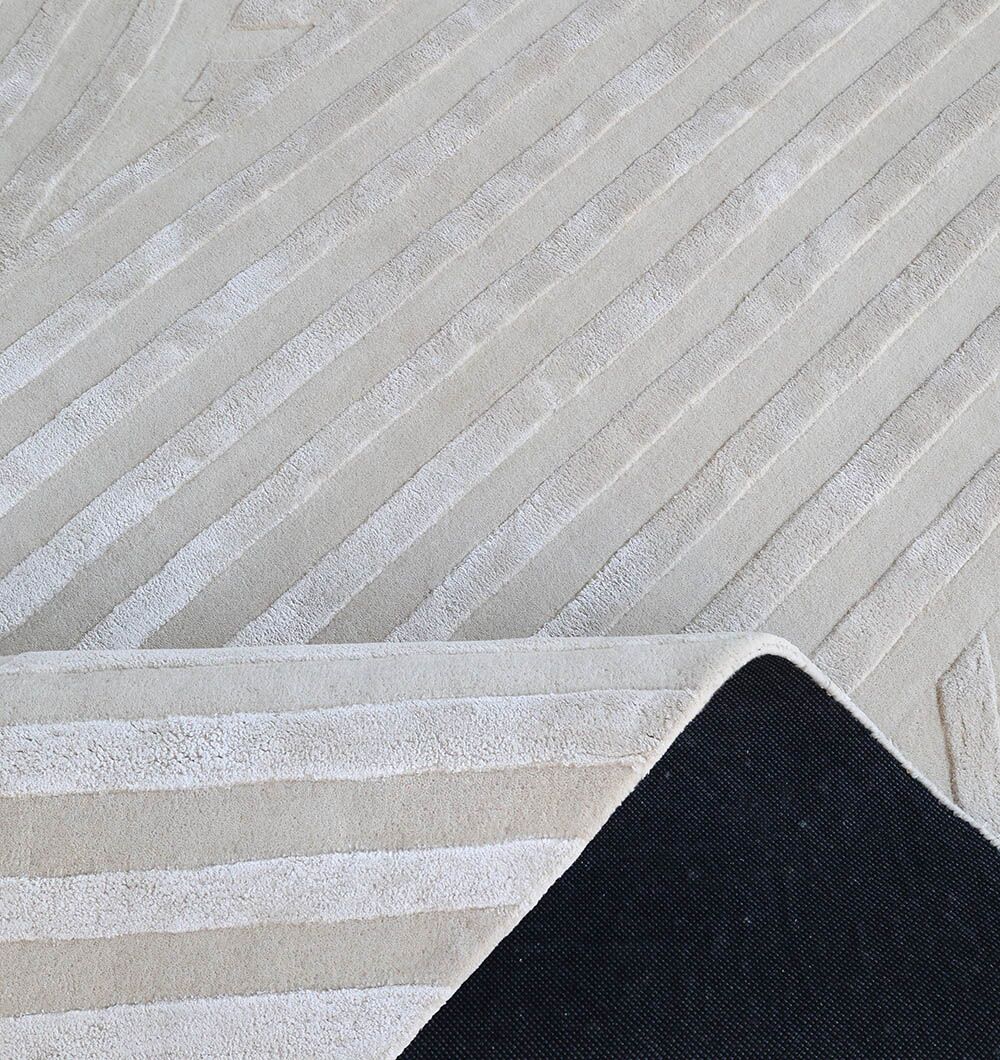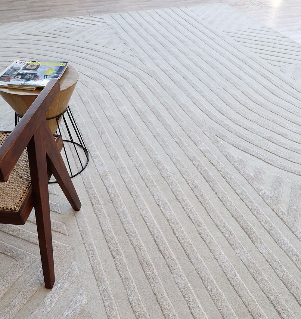 Clean lines and soft curves give this ivory rug a calm, modern look. Carved channels create a bold pattern of arcs and diamonds, adding depth without loud color. The wool base feels warm underfoot, while viscose brings a gentle sheen that shifts with the light. This ivory geometric rug works beautifully with wood, cane, and neutral seating. Use it as a textured area rug to add interest in minimal spaces, and enjoy the crafted feel of a handtufted wool rug made for everyday comfort.