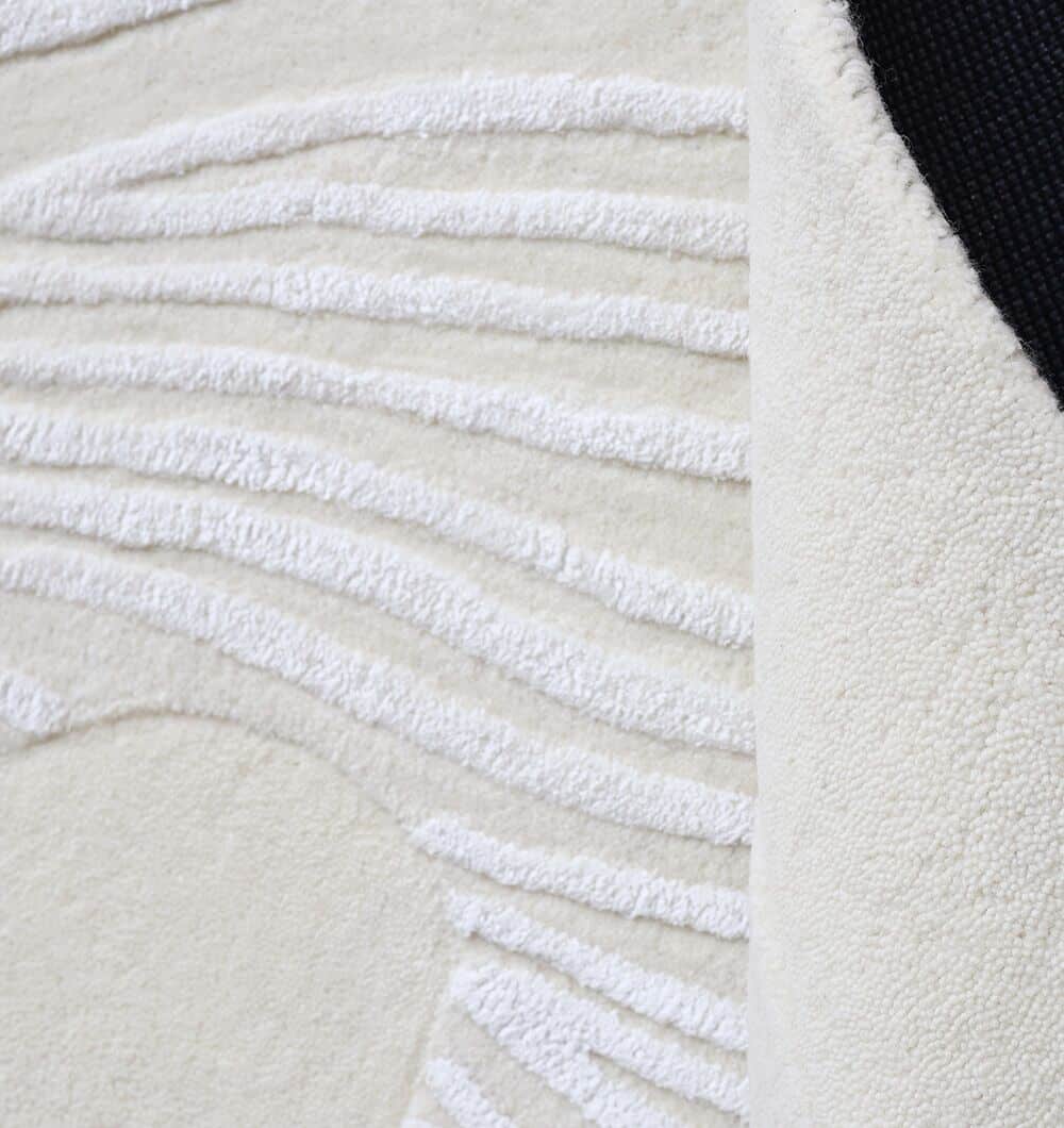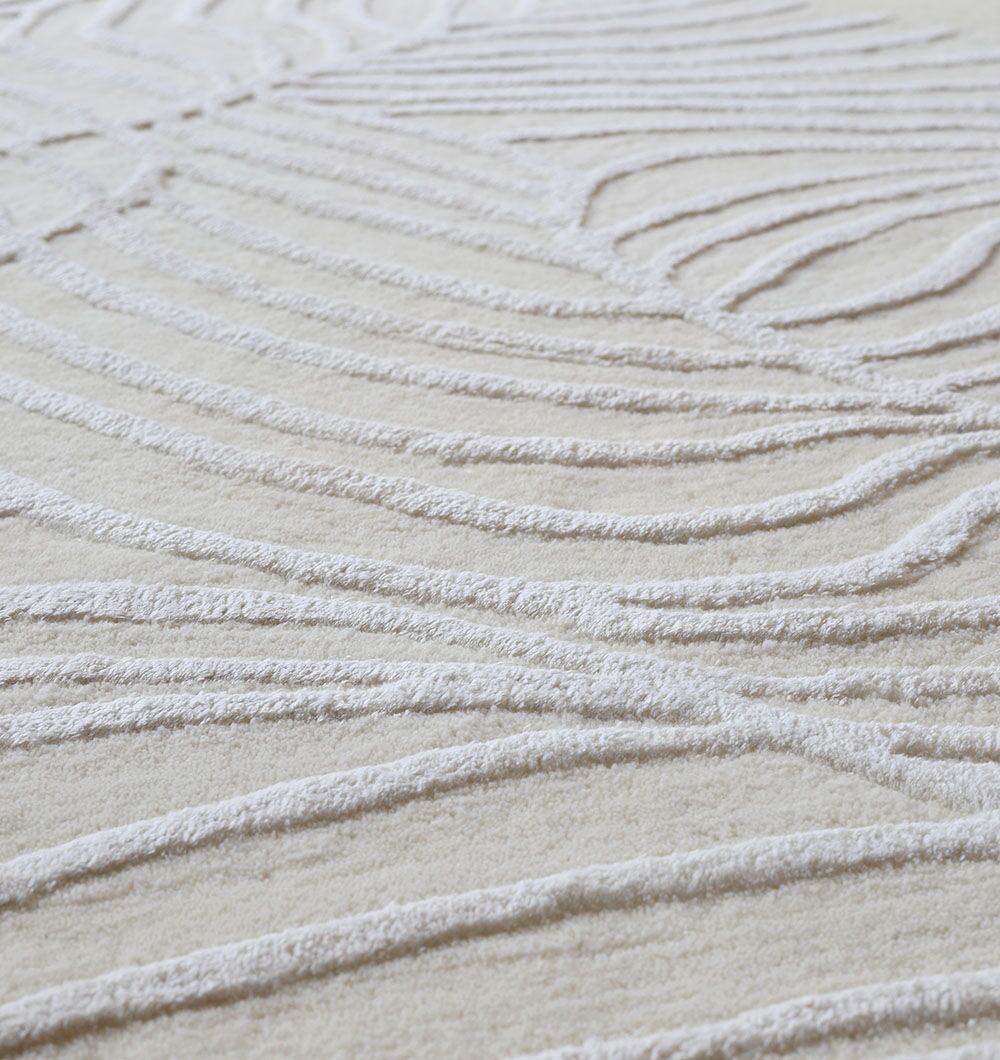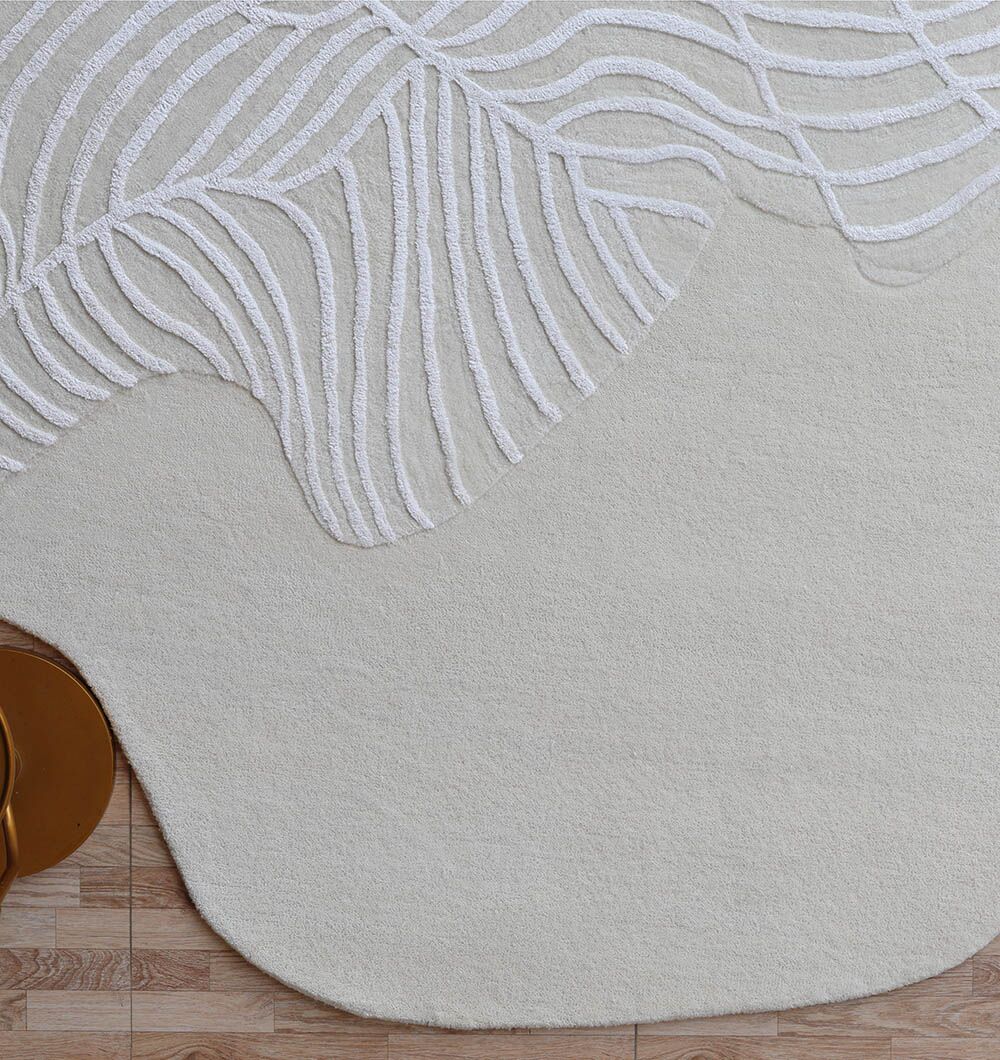 Creamy ivory base meets raised leaf linework in this irregular rug, giving you a soft look with touchable texture. The hand-tufted finish creates a smooth, cushioned feel, while the wool and cotton blend keeps it comfortable for daily living. Use it as a hand tufted wool rug to brighten a seating area, as an ivory leaf rug to add pattern without strong color, or as a modern organic rug to soften straight furniture lines.
