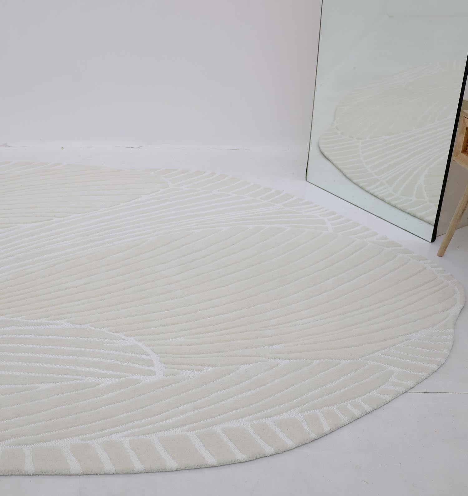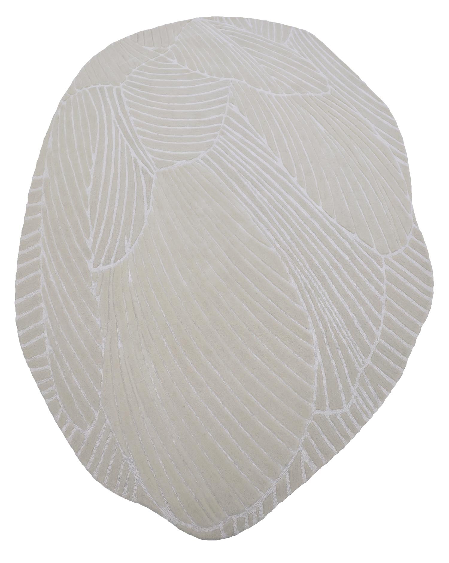 Soft ivory and warm beige create a calm base, with oversized leaf outlines in raised texture for an easy, nature-inspired look. The irregular shape keeps it modern and relaxed, while the hand-tufted pile feels smooth with gentle cushion. The wool, viscose, and cotton blend adds a subtle sheen that lifts the pattern in natural light. Use it as a hand tufted wool blend rug to soften a seating area, choose it as a leaf pattern rug for quiet texture, or style it as a neutral area rug when you want the room to feel light and balanced.