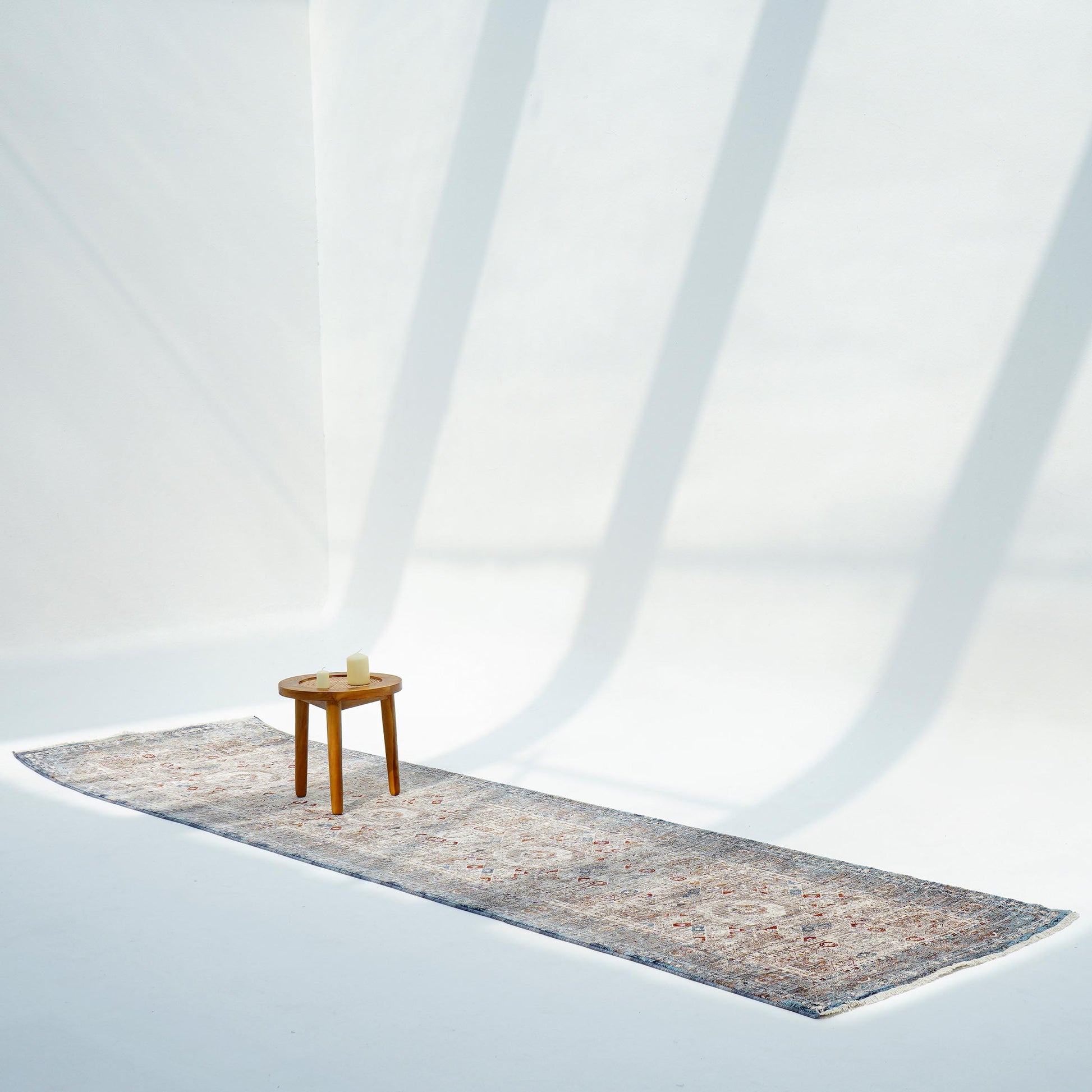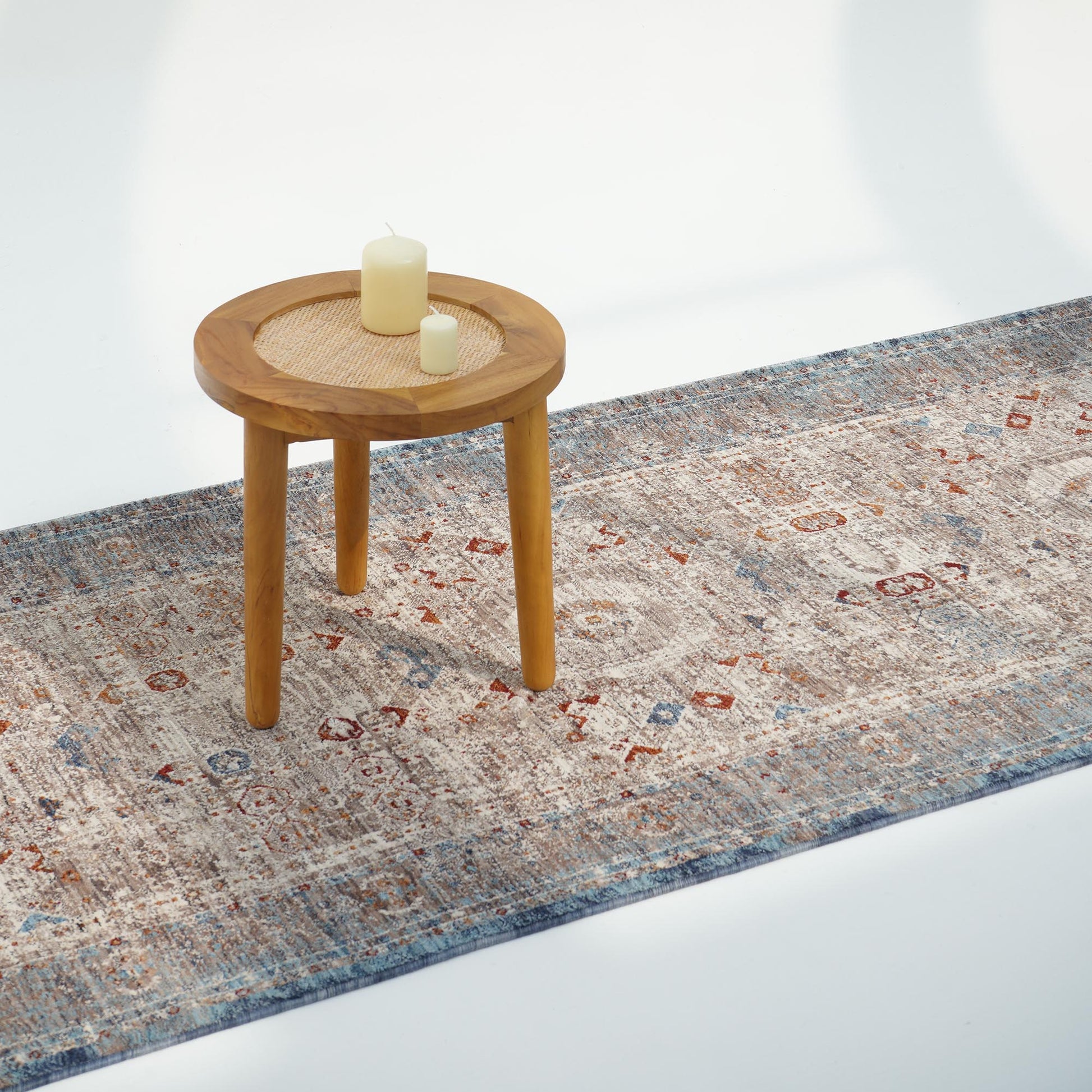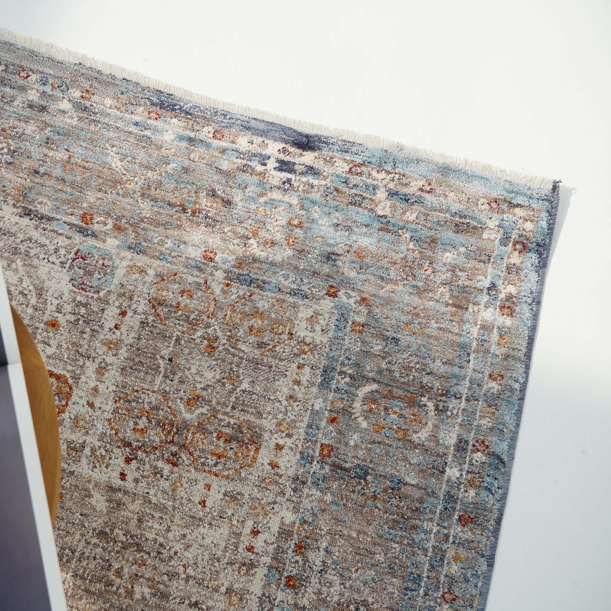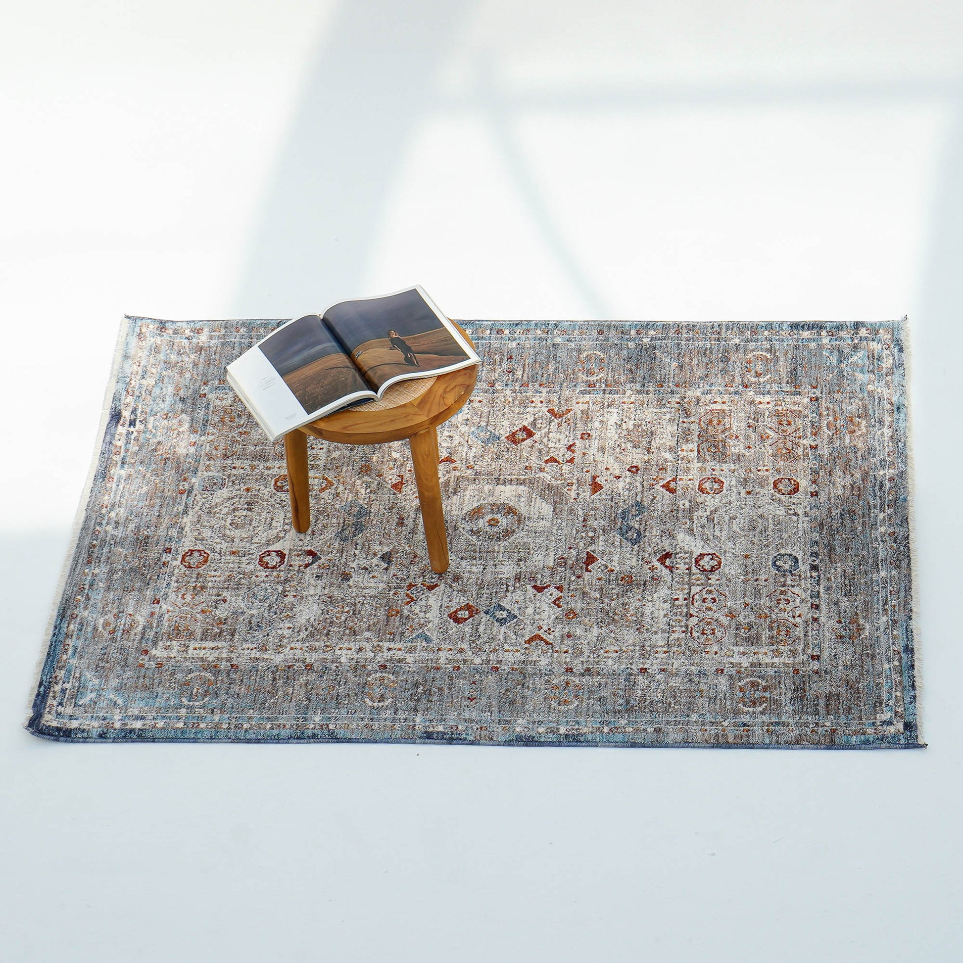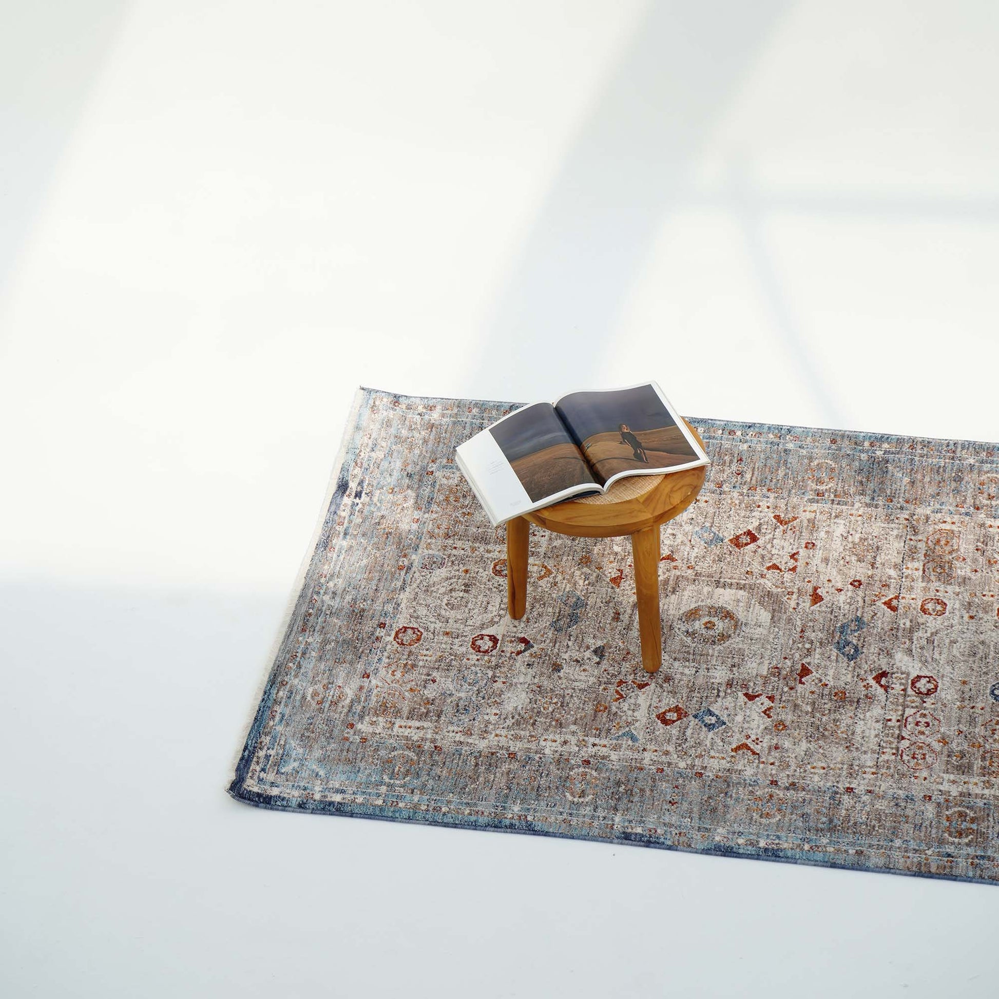 Give your space an easy, lived-in look with this beige, blue rug in a soft vintage style. Faded medallion details and tiny accents in muted rust and gray add character without feeling loud. The low, smooth surface has a gentle shine from polyester silk, making it simple to place under a coffee table or by the bed. Use it as a distressed area rug to brighten neutral rooms or style it as a vintage blue rug with wood, leather, and warm metal tones for a cozy finish.
