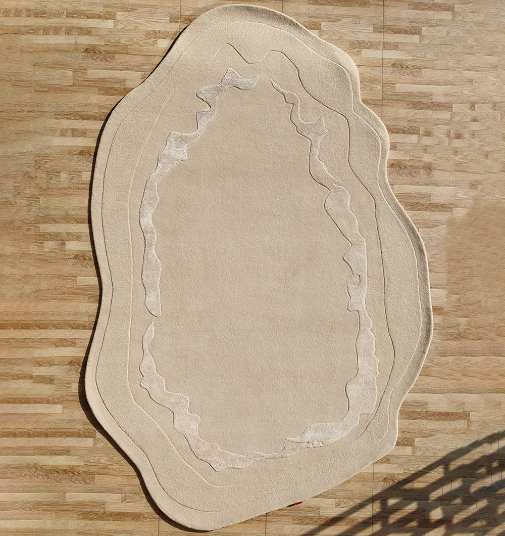 A soft beige base with carved contour rings gives this irregular rug a calm, layered look that reads like gentle topographic lines. The hand-tufted pile feels smooth with a light cushion, and the wool, viscose, and cotton blend adds a subtle sheen that highlights the raised edges. Use it as a hand tufted wool rug to keep the room warm and neutral, choose it as a neutral contour rug for quiet texture, or style it as an irregular shape rug to soften straight furniture layouts.