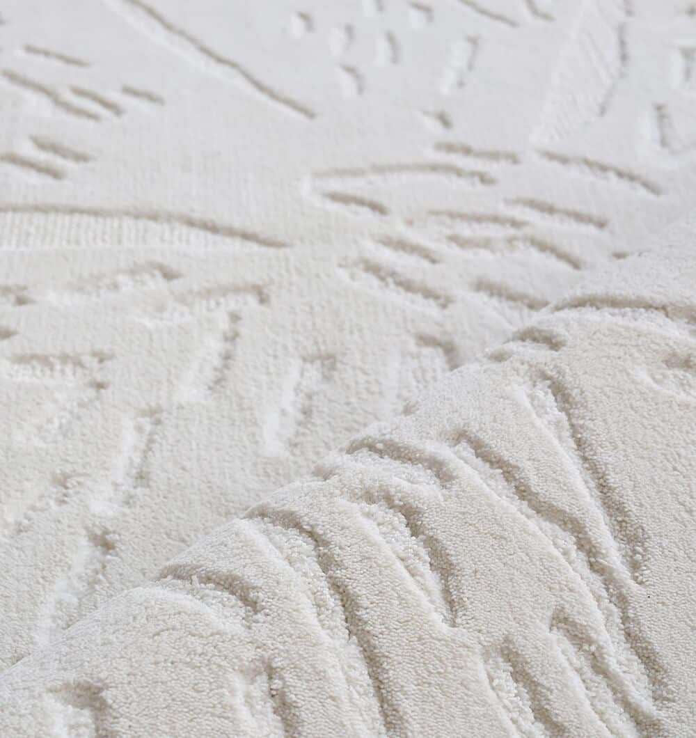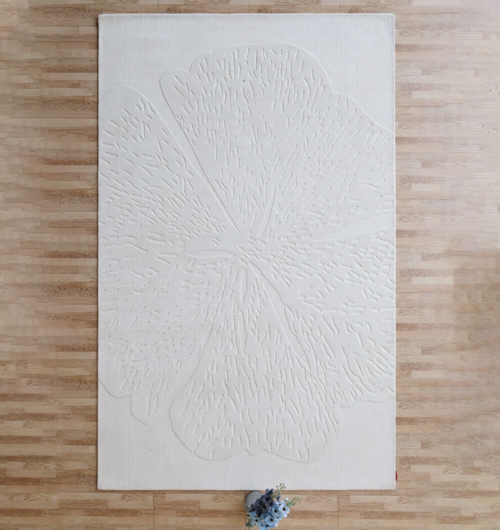 Clean ivory-on-ivory design with a raised floral outline gives this rug a quiet, textured look that feels modern and soft. The machine-made surface stays even and smooth, and the polyester and cotton blend is easy to care for in daily spaces. The carved-style details add depth without strong contrast, so it pairs easily with light woods, neutral sofas, or colorful accents. Place it under a bed or in a seating area to add comfort while keeping the room bright. This white textured rug also works as a modern floral rug, and it’s a practical machine-made rug for low-fuss styling.