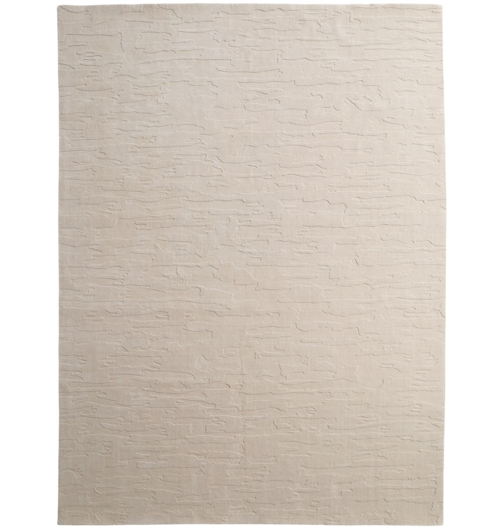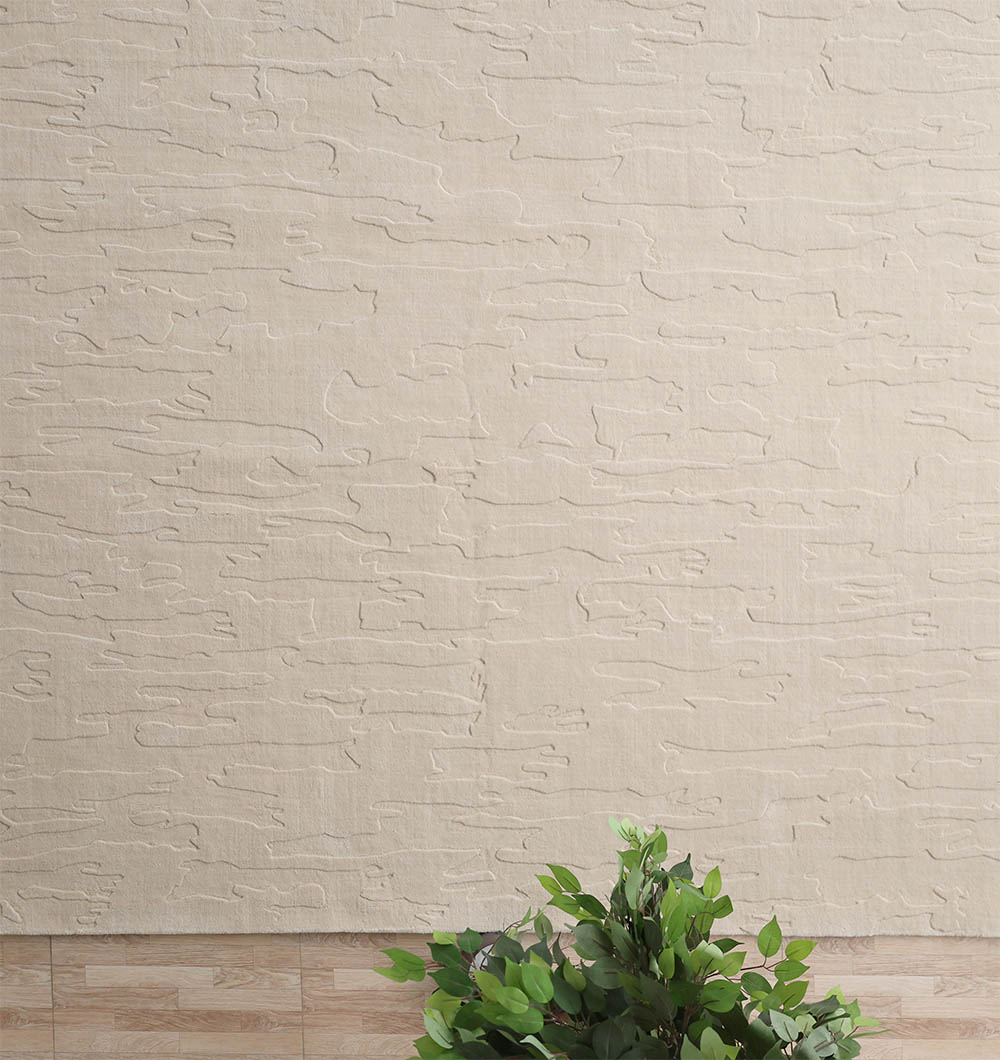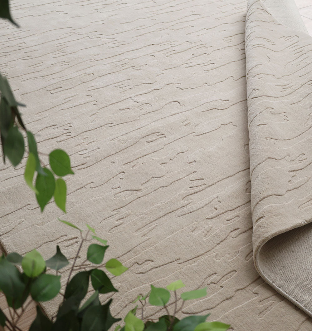 Soft and calm, this rectangular rug brings a clean, layered look to any space. The warm ivory tone stays easy to match, while the low carved lines add gentle depth, like hand-drawn strokes across the surface. Made with wool and cotton, it feels cozy underfoot yet keeps a neat, tailored finish. Use it as a neutral area rug to brighten a room, or style it with wood, linen, and stone for a relaxed modern feel. Its subtle pattern makes it a great textured wool rug when you want interest without bold color. A refined loom knotted rug for everyday living.