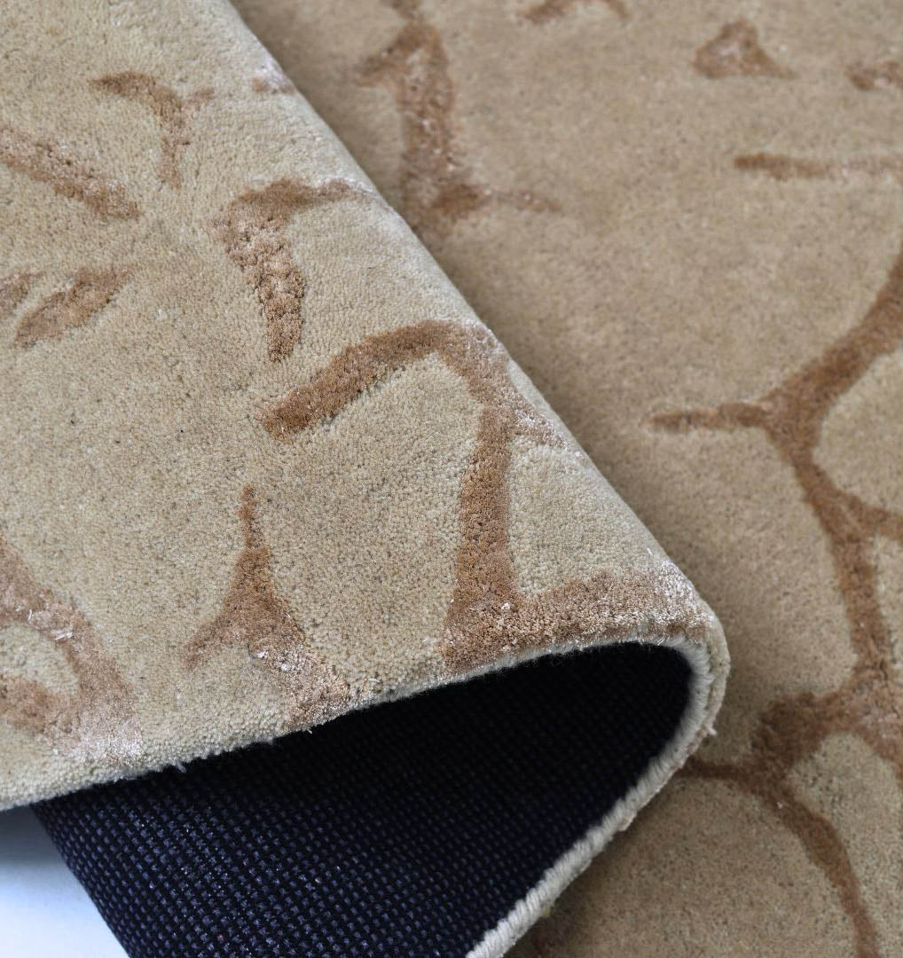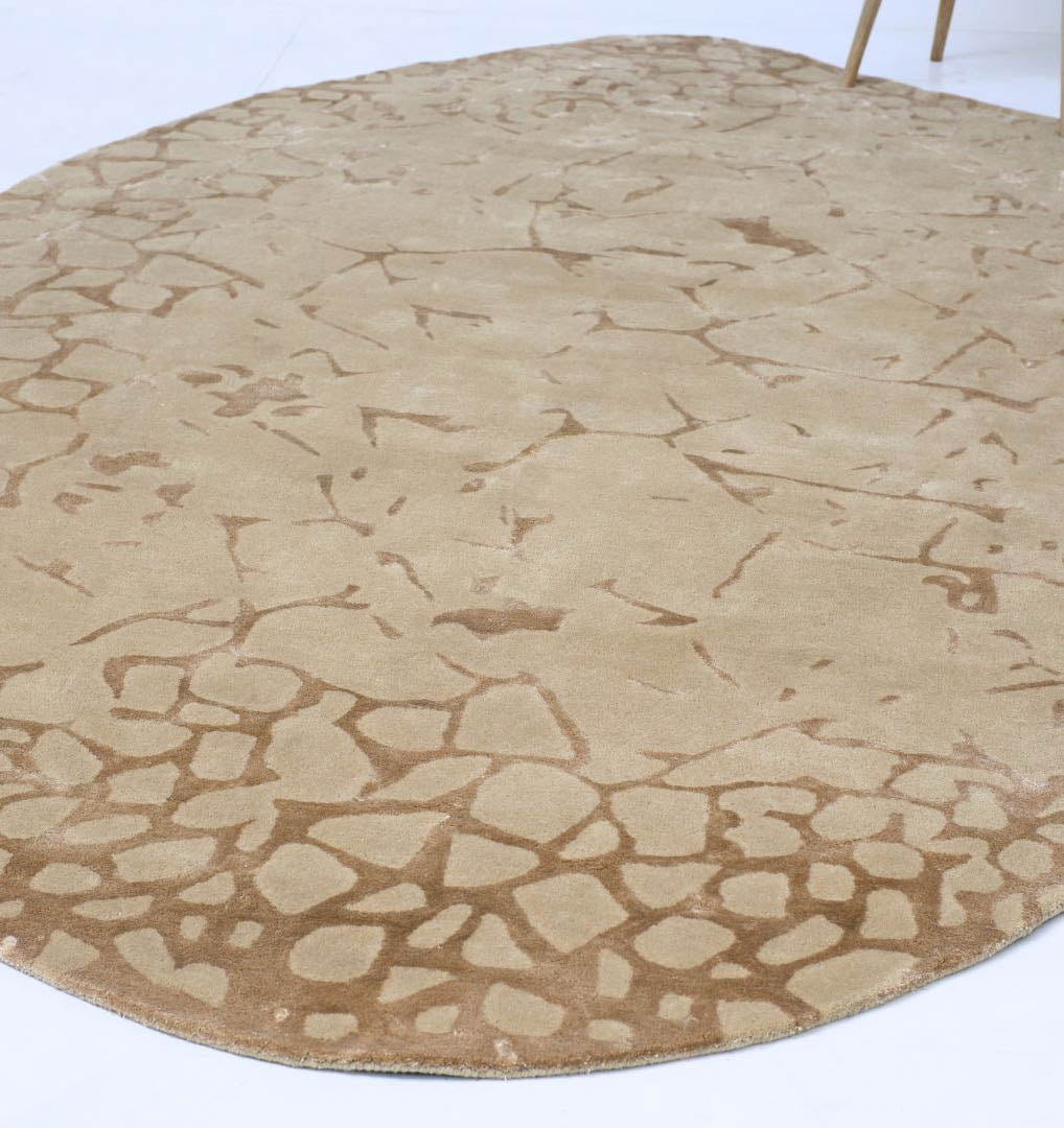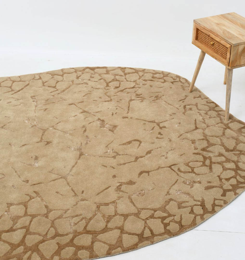 Warm beige tones and a soft crackle pattern give this rug a calm, earthy look that suits both modern and classic spaces. The irregular outline adds a relaxed, organic feel, while the hand-tufted finish brings a plush, comfortable touch underfoot. Made with wool, viscose, and cotton, it has a gentle sheen in the light and a cozy texture for everyday lounging. Style it with neutral furniture, wood accents, or warm metals for an easy, pulled-together room.