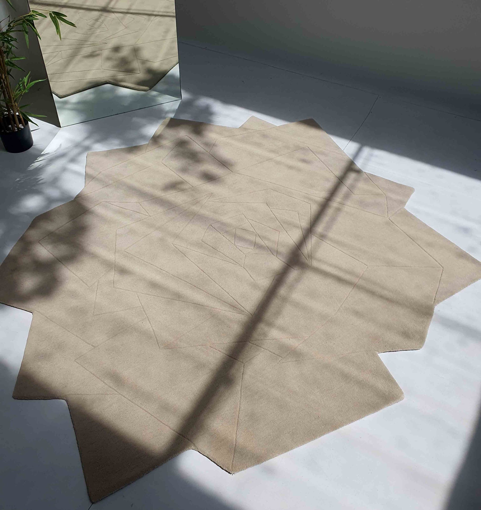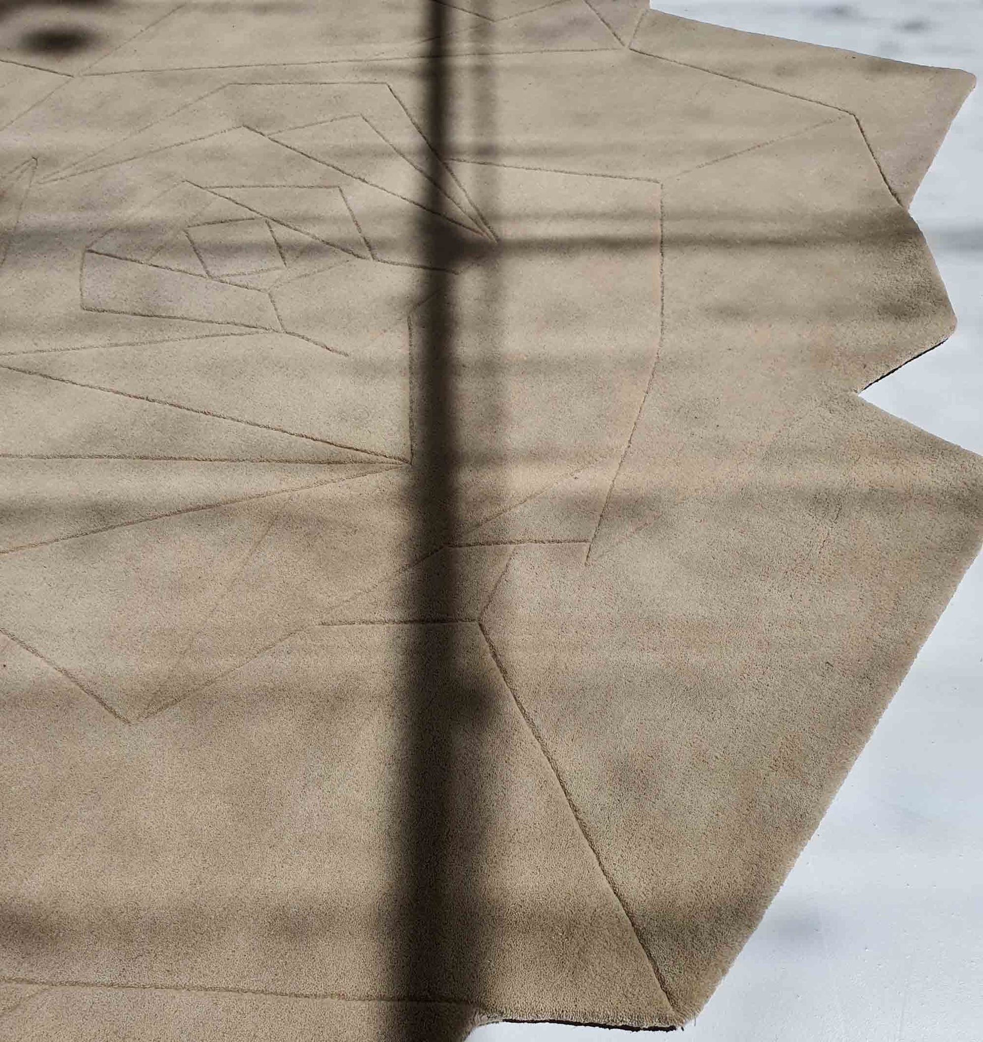 Soft and calm, this beige wool rug brings an easy, modern look to any space. The bold, scalloped outline creates a statement shape, while the faint geometric line design adds quiet detail without feeling busy. This irregular area rug is perfect for breaking up straight furniture lines and adding a gentle focal point in open rooms. Hand-tufted with a wool, it feels smooth underfoot and works well with light wood, stone, and neutral decor. Style it as a modern hand tufted rug under a coffee table or as a clean base for layered seating.