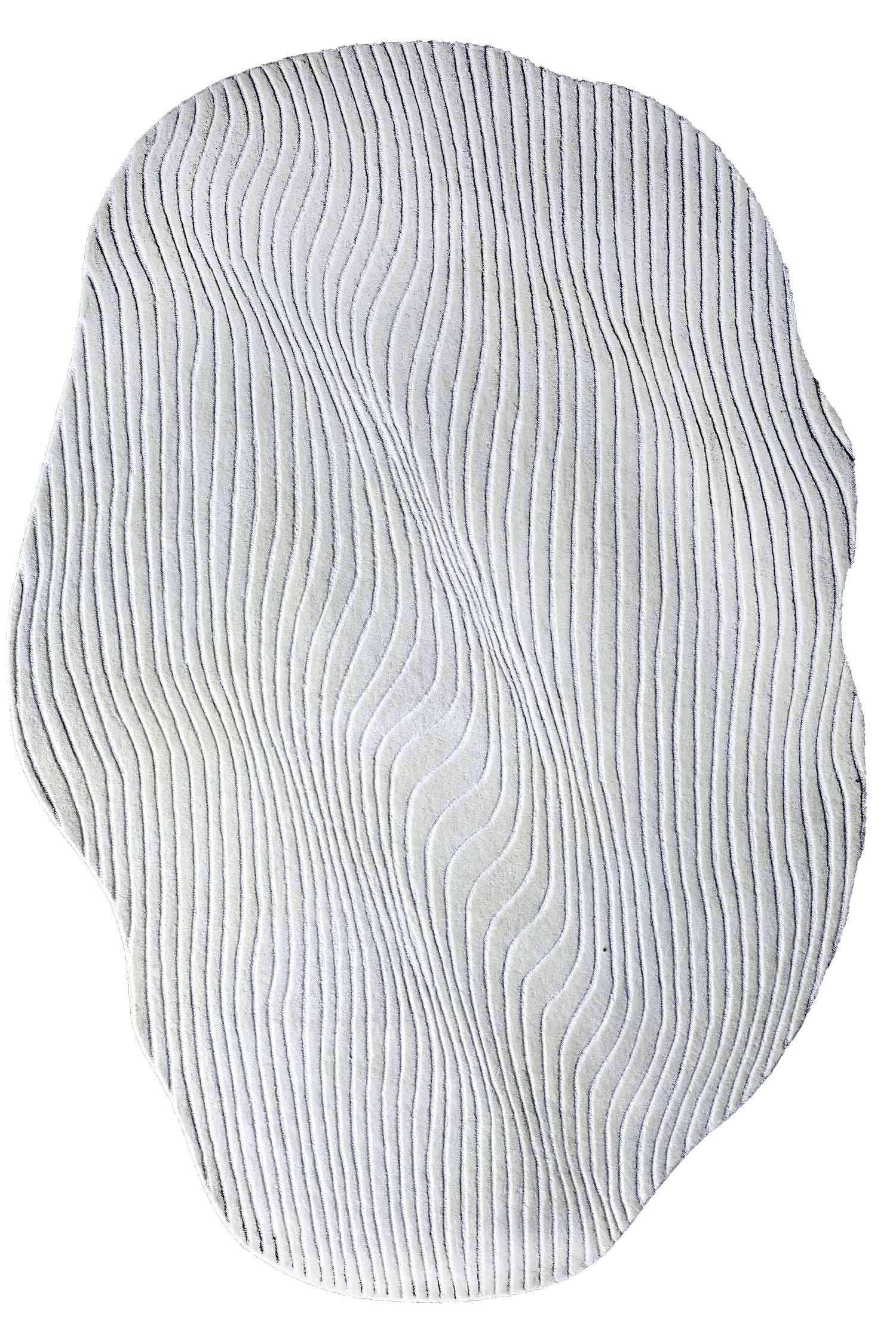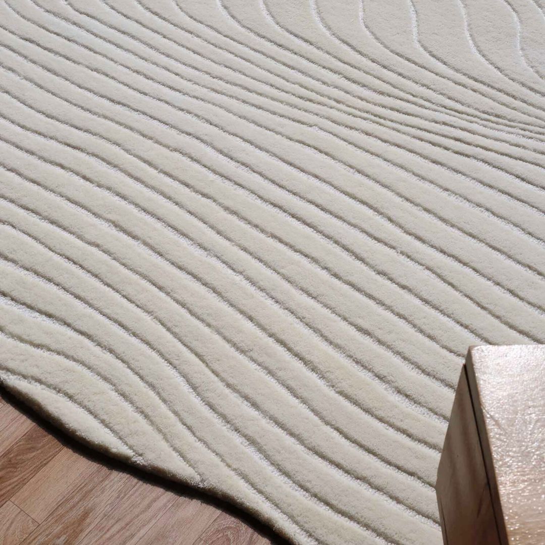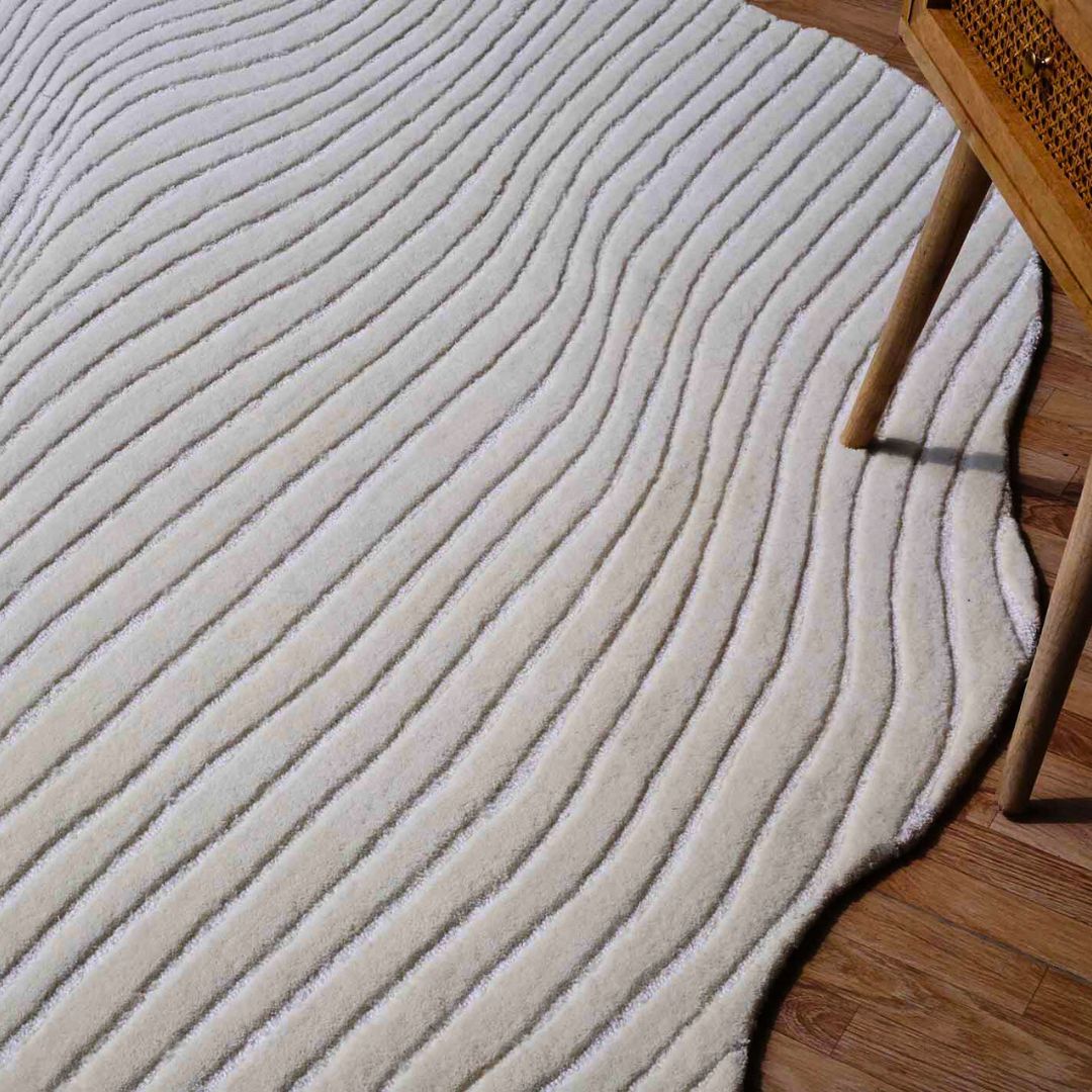 This white and silver irregular wool rug features a stunning wood-grain texture created by flowing, organic lines. Hand tufted from a premium blend of wool, viscose, and cotton, it offers a multi-dimensional look that changes with the light. The irregular silhouette and high-low pile depth make it a modern accent rug that adds movement to minimalist or contemporary spaces. Its cool tones provide a crisp finish, while the viscose silkiness provides a gentle luster across the surface. This textured floor piece is as durable as it is artistic, providing a soft, resilient foundation that stands out in any room. The unique shape serves as a creative alternative to standard borders, making it a true conversation starter for your home.