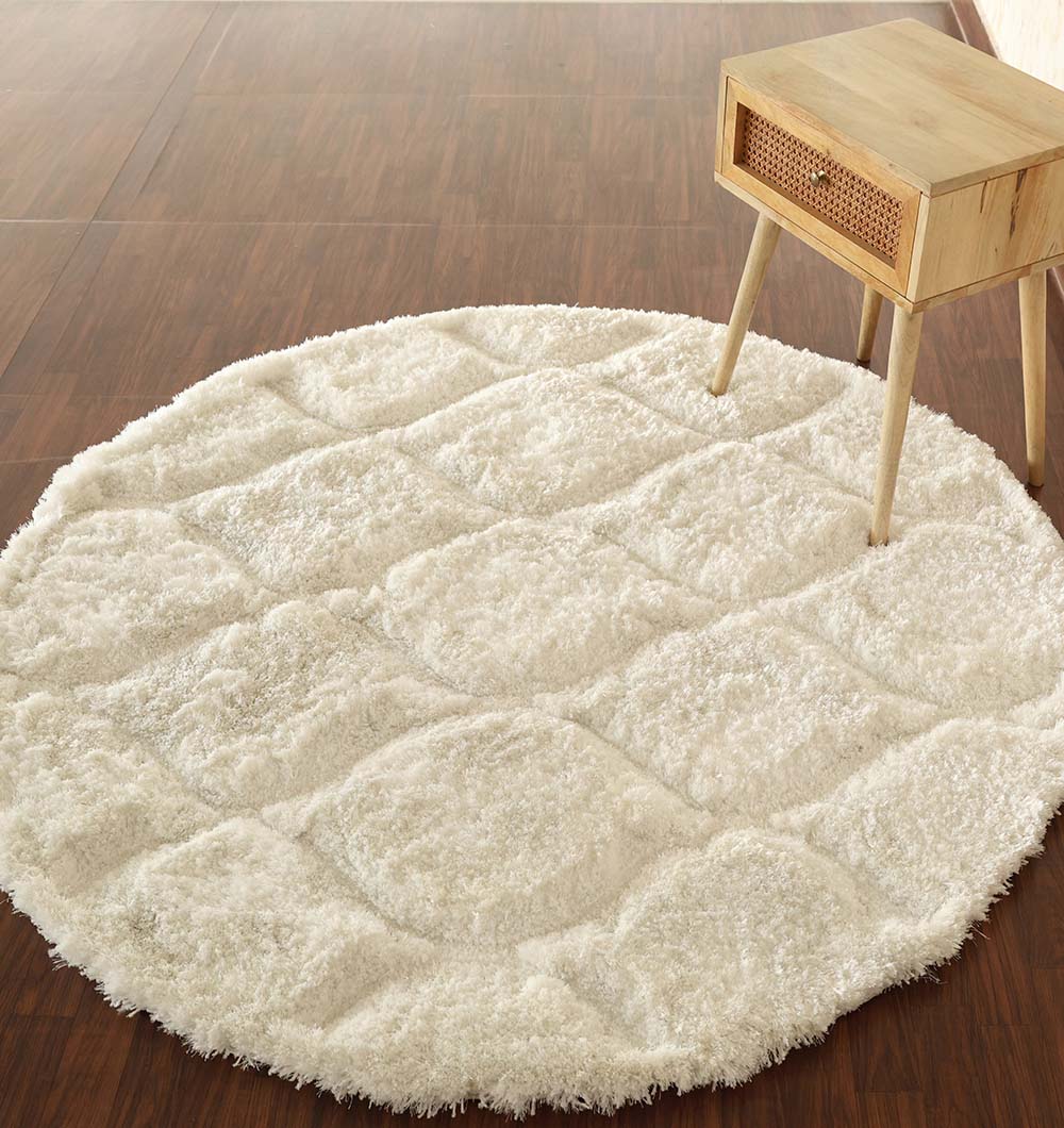 Bring a clean, cozy touch to your space with this round shaggy rug in soft ivory. The raised texture creates gentle waves that catch the light and add depth without a bold pattern. Made with polyester, it feels plush underfoot and stays easy to maintain for everyday living. Use it to soften hard floors, warm up a seating area, or add comfort beside the bed while keeping the look bright and simple.