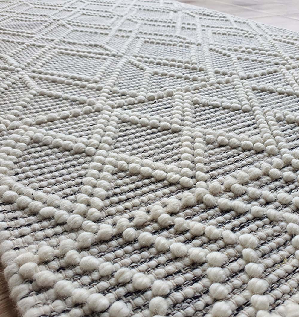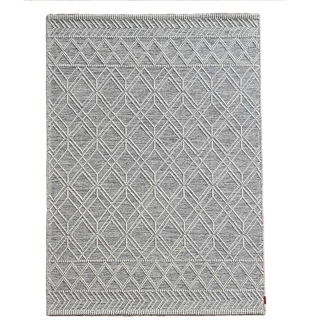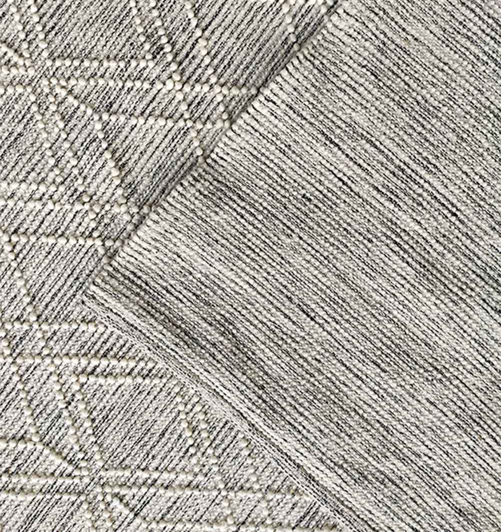 Add a clean, modern layer with this rectangle woven rug in soft grey and ivory. The raised lattice lines create a crisp look, while the triangle borders and chevron bands frame the design with subtle detail. Made from wool, it feels cozy yet firm underfoot and works well in busy, everyday spaces. This grey geometric rug pairs easily with light sofas, wood tones, and black accents, and the calm contrast keeps the room feeling open. Use this diamond pattern rug to sharpen a simple layout or add texture without heavy color. A versatile woven wool rug that brings pattern, comfort, and a neat finish to your floor.