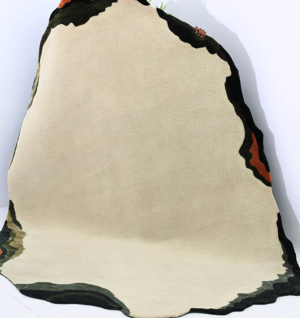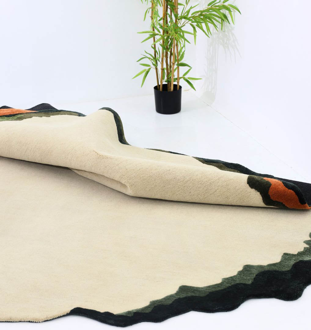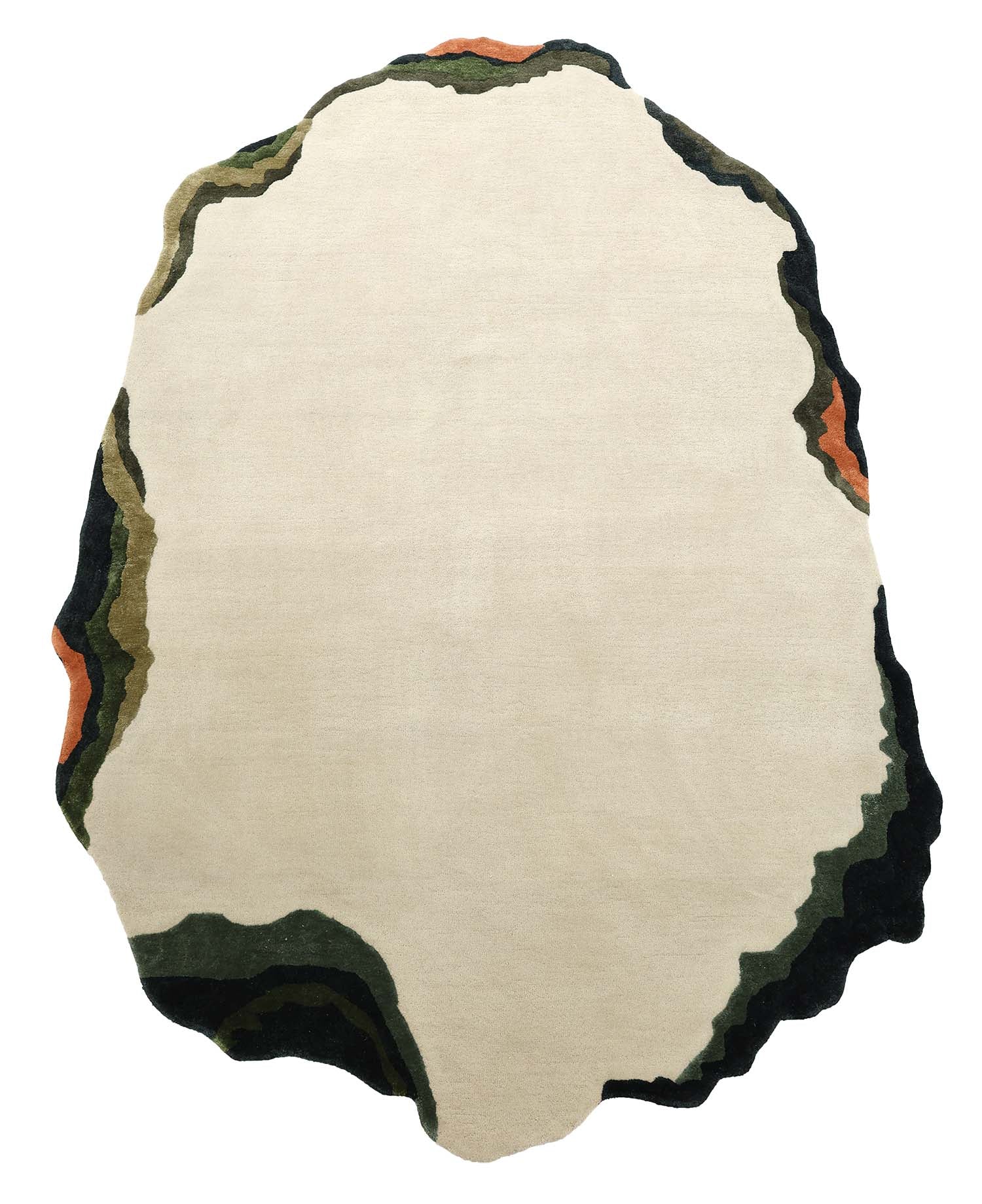 Soft cream fills the center, framed by layered edges in deep green, olive, and black with small rust touches for a calm, earthy look. This modern wool rug adds warmth without feeling heavy, and the smooth surface is easy to style with neutral or wood furniture. The free-form outline makes this irregular area rug a quiet statement piece, while the hand tufted rug finish gives a neat, premium feel underfoot.
